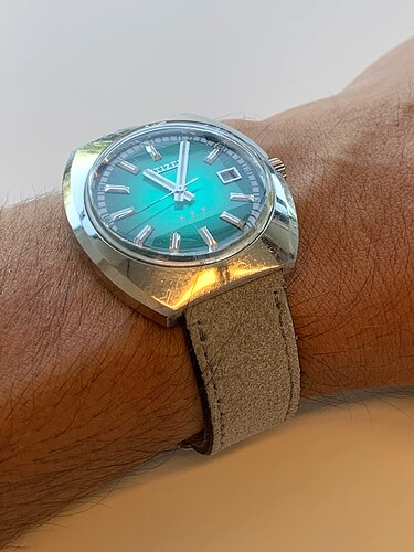 Intussen heb ik die nog niet gevonden, maar wél nog een tweede klokje met cirkeltjes in beide wijzers. In een heel leuke deal met Frank @HorlogeHalle zat onder andere deze beauty; te groot voor mijn pols maar voorlopig met plezier in gebruik als bureauklokje!