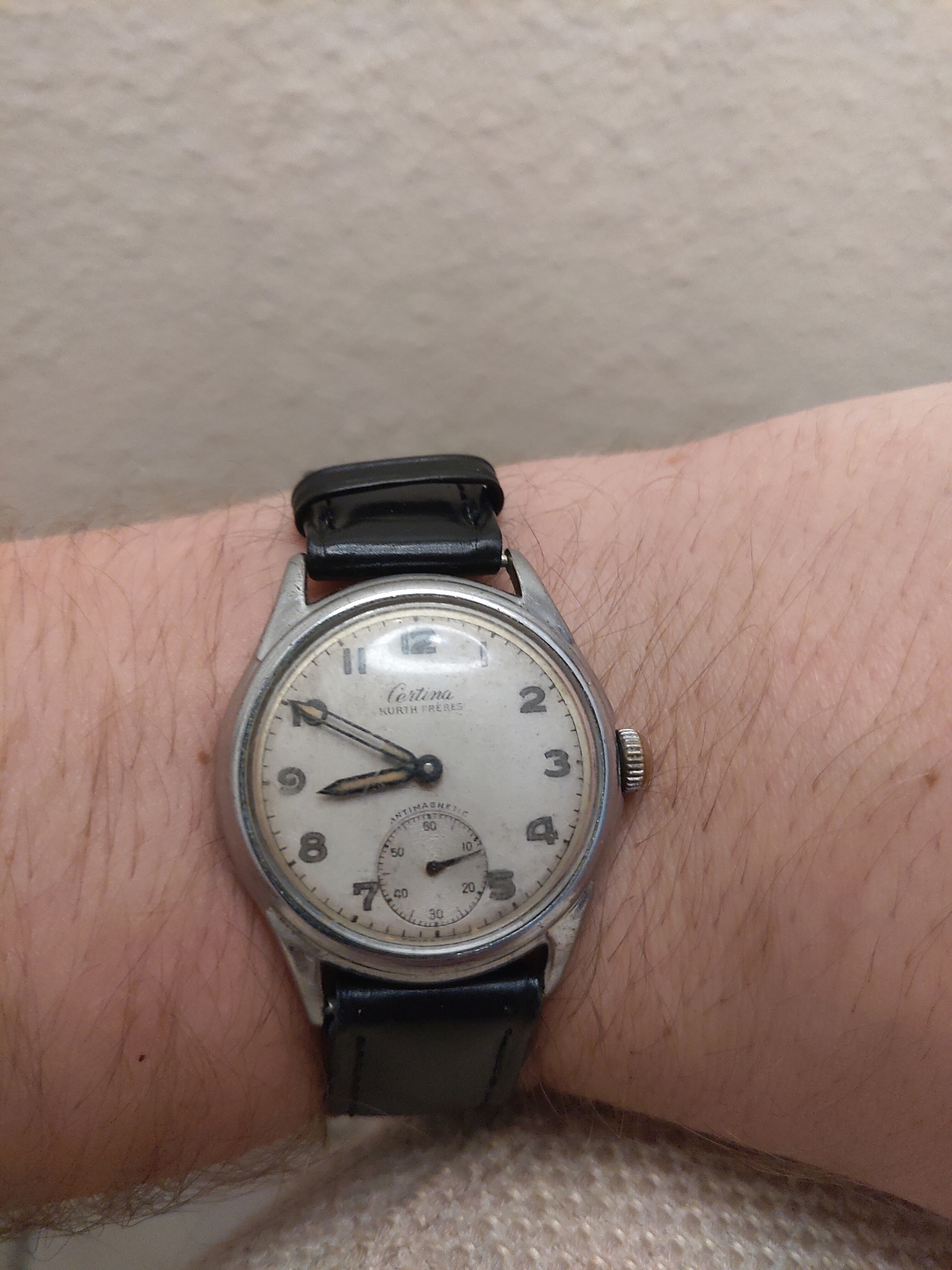 Maar toch heeft’ie iets aantrekkelijks. Hij komt uit de jaren 50, heeft de tekst “Kurth Frères” (naar de oprichters van Certina) op de dial en een caliber 320 uurwerk. Ben geen uurwerkexpert, maar dit blijkt na wat onderzoek een best interessant uurwerk te zijn. Vind het ook schitterend dat de subsecond het nog doet. Kortom, een beetje een vreemde eend in de bijt dit horloge, maar juist daarom leek het me leuk deze met jullie te delen.