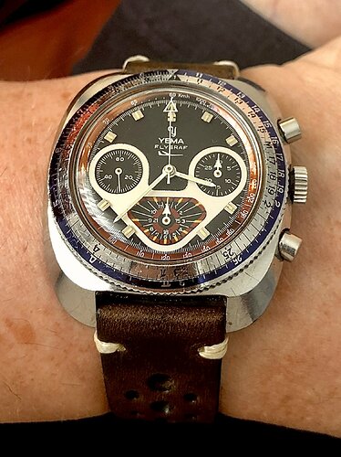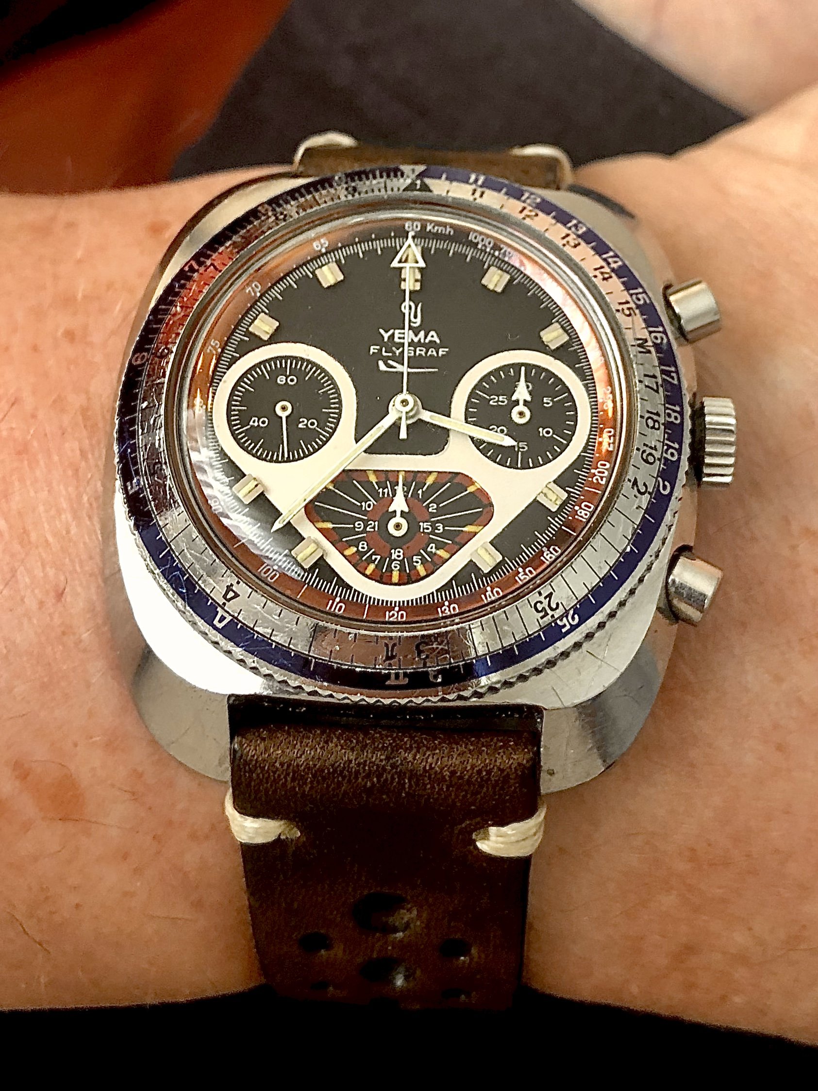 Dit is toch wel mijn mooiste Yema. Een robuuste late 60’s case, een kwalitatief Valjoux uurwerk. Een bijzonder palet aan kleuren en een fantastisch cockpit design. De Yema Flygraf 1st serie uit 1968.