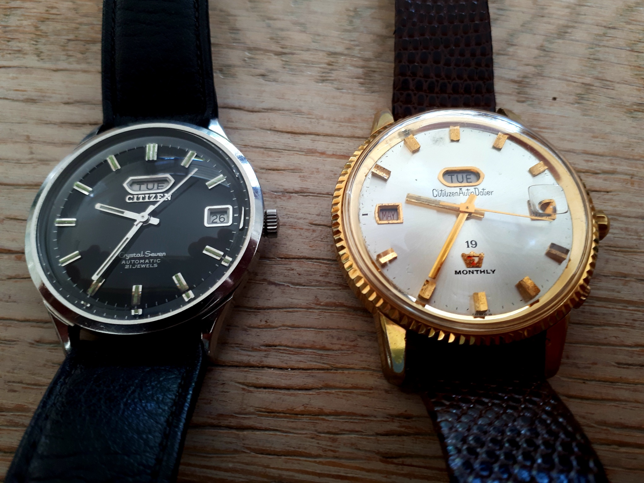 Het formaat van een Citizen Auto Dater Monthly (1965) komt pas goed tot uitdrukking als je hem naast een ‘normale’ dater (1969) legt…