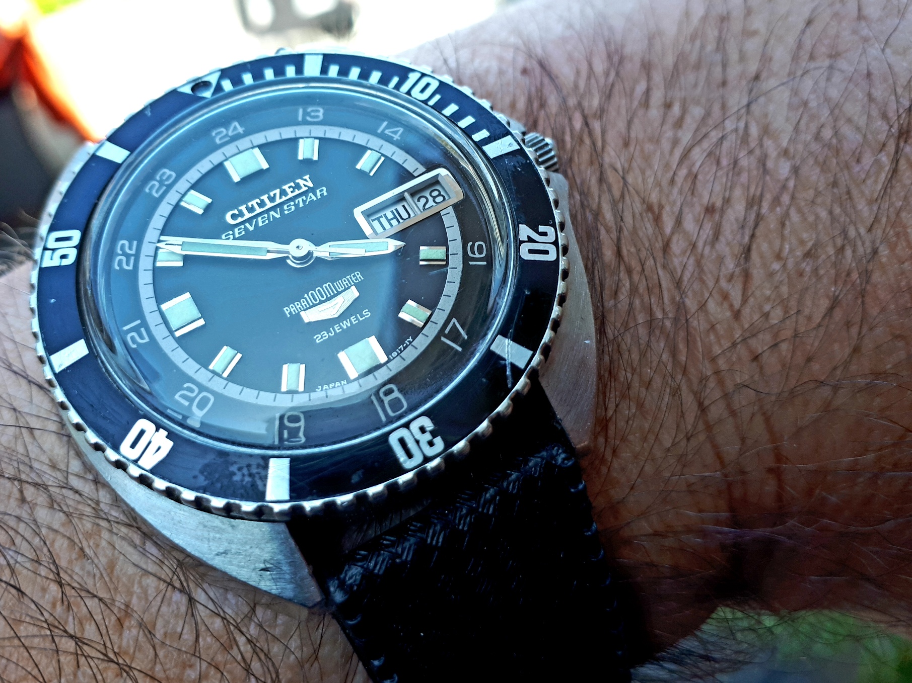 In de middagwissel: Citizen Seven Star Parawater 100M uit februari 1969. Detail: Alleen JDM (Japanese Domestic Market) modellen hadden Seven Star op de dial staan, daaraan zie je het onderscheid met de export versies.