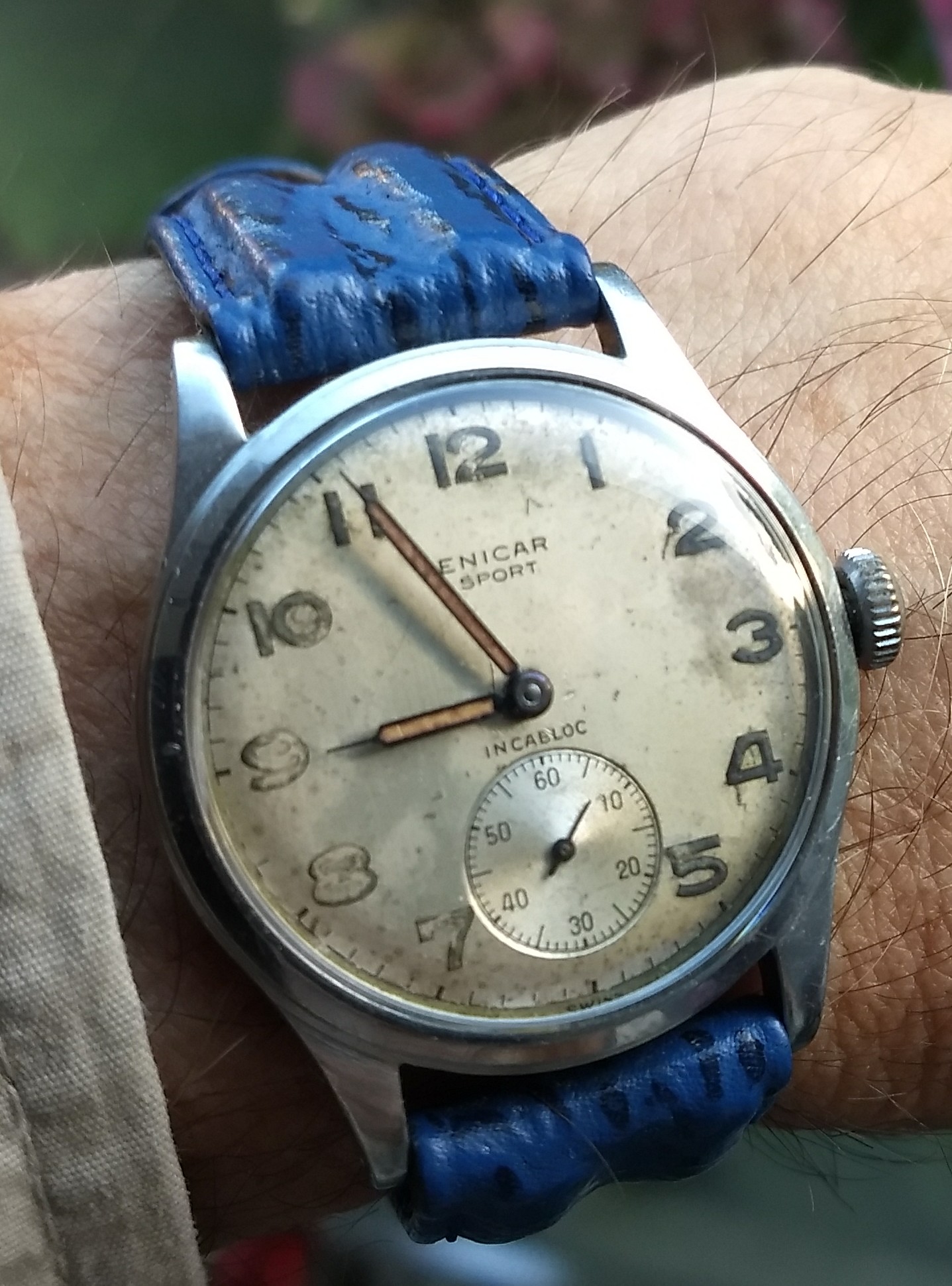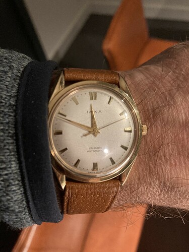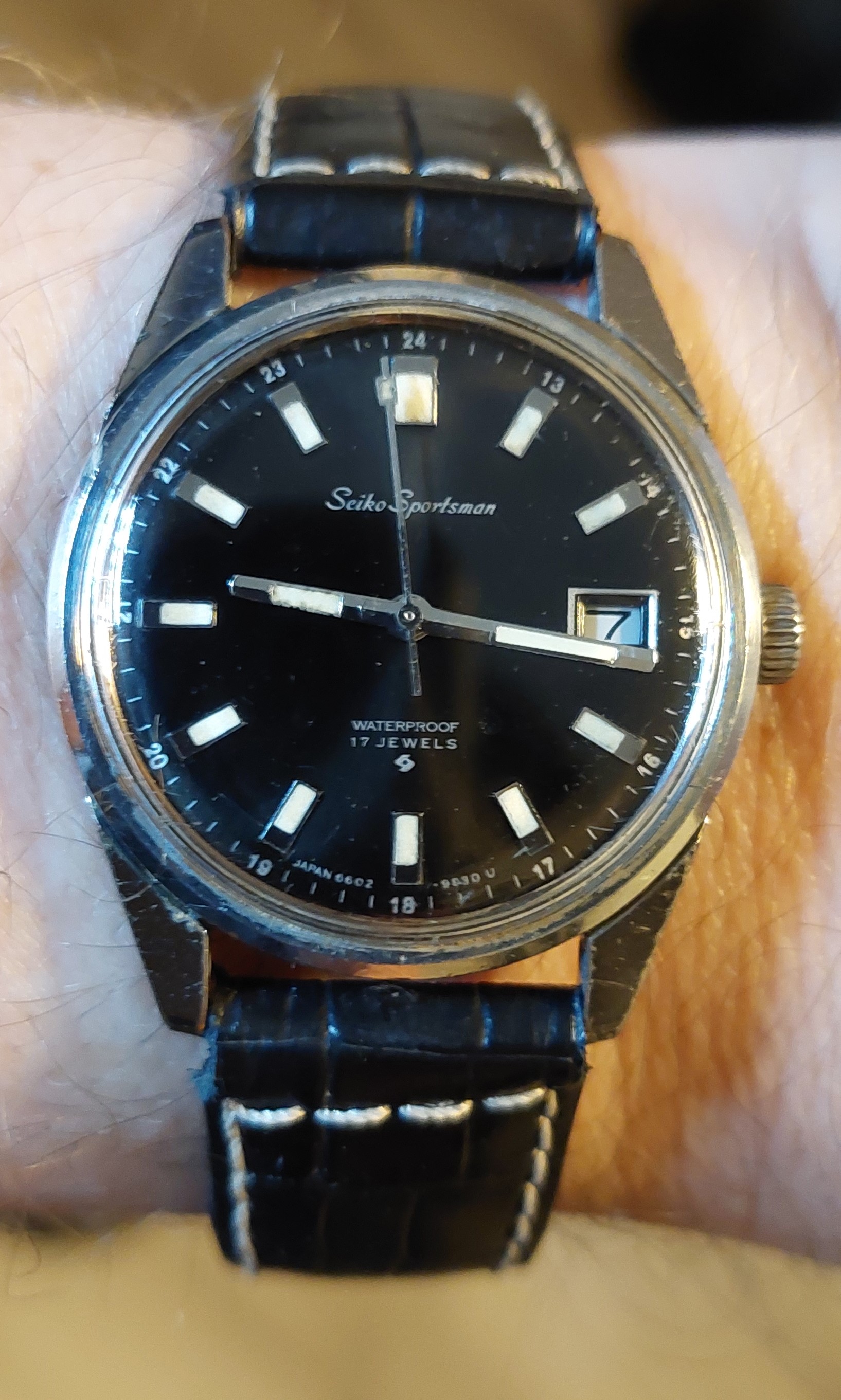 Zojuist deze omgedaan. Zojuist binnengekomen vanuit Japan, deze Seiko Sportsman uit 1969. Enkel zuiver gemaakt en het glaasje gepolijst. Loopt nog snaarstrak, en ziet er voor zijn leeftijd nog erg goed uit!