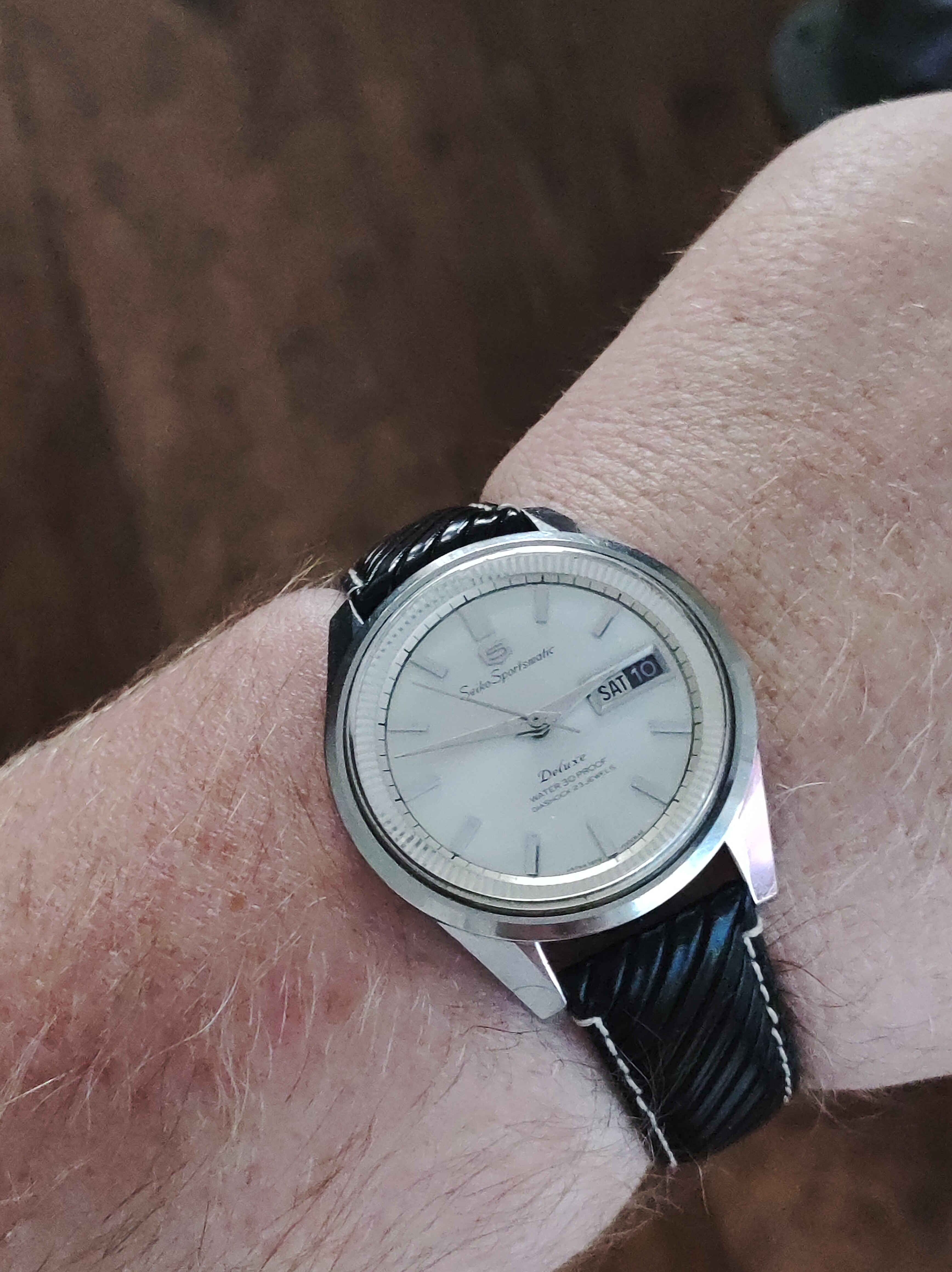 Voor de gelegenheid hier dan ook nog maar even om de pols. Een degelijk Hollands handelsmerk: Olympic met een Frans Lorsa P62 uurwekje er in. Ook met zo’n naar Fixoflex rekbandje. Blijft dus ook in de onvervreemdbare collectie van familie- en erfstukjes.