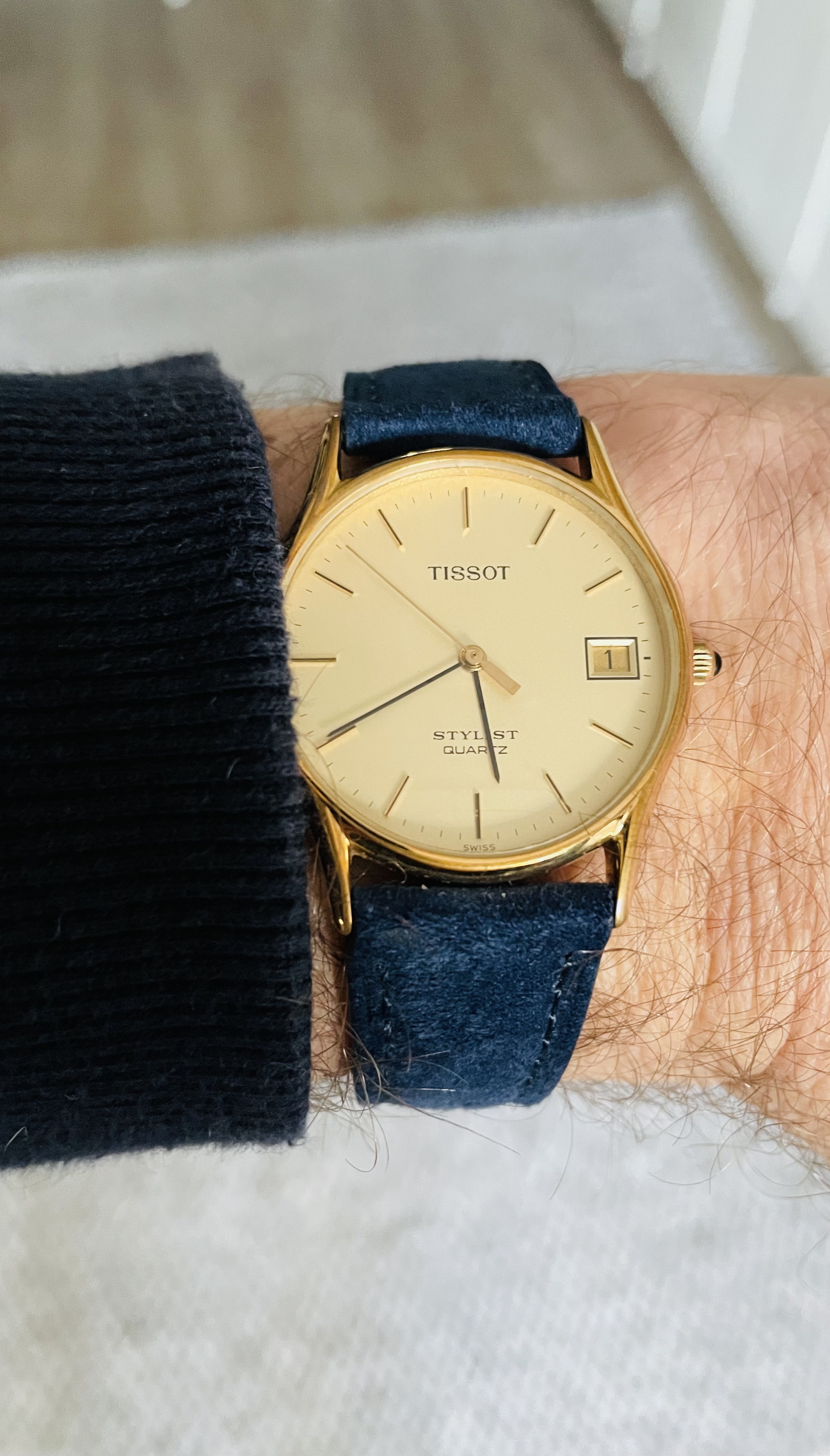 Zojuist binnen gekregen, gelijk maar even om de pols geslingerd. Glaasje verdient wel wat aandacht, en hopelijk zijn de paar minuscule puntjes op deze mooie pie pan dial gewoon weg te blazen. Nog een leuk detail, de stalen band is ook van Tissot. Of hij oorspronkelijk bij dit horloge hoort weet ik natuurlijk niet zeker😉