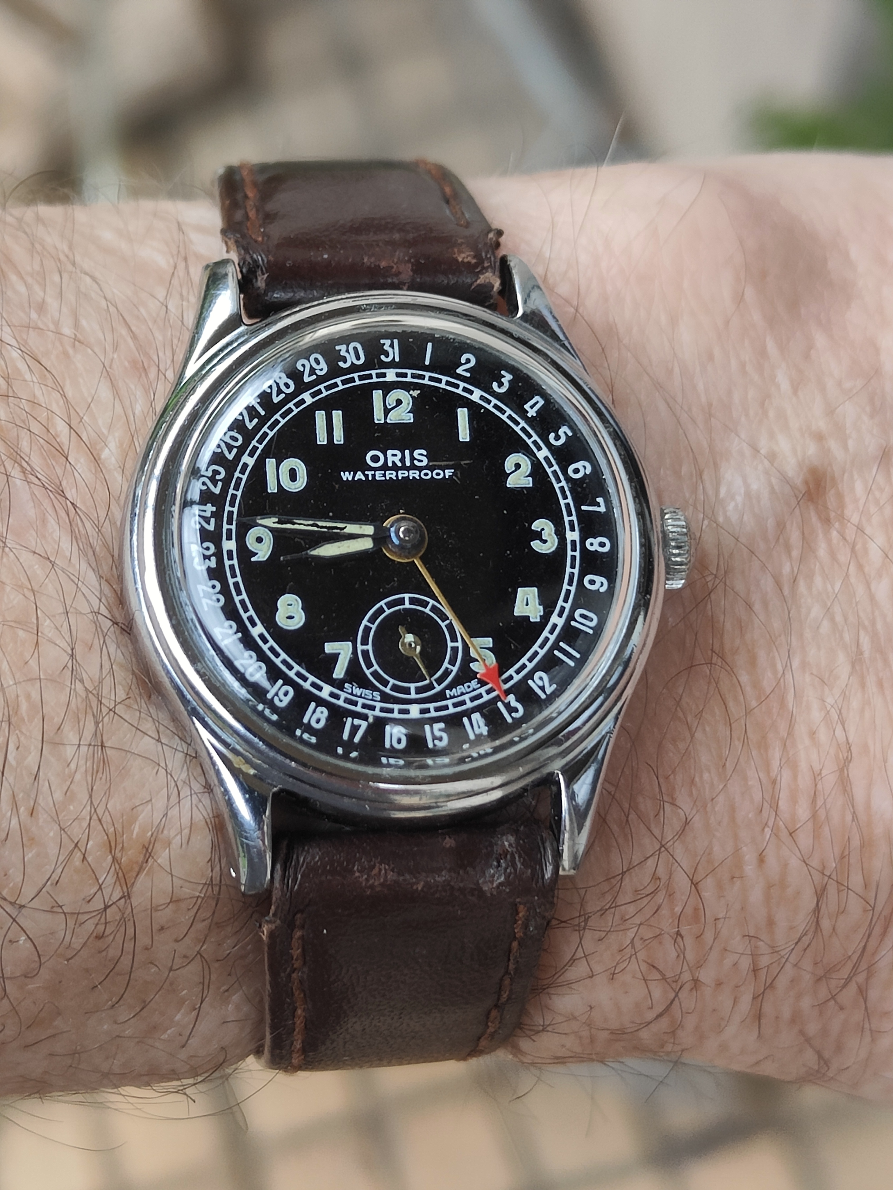 Die zit in deze Junghans Trilastic uit 1954 of 1955 met z’n mooie krabbenpootjes: