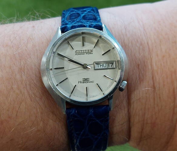 Eerst zat hij op deze blikken rekband uit de tijd. Maar blik vind ik beetje te goedkoop voor het horloge. Zit trouwens wel lekker, weegt helemaal niets.
