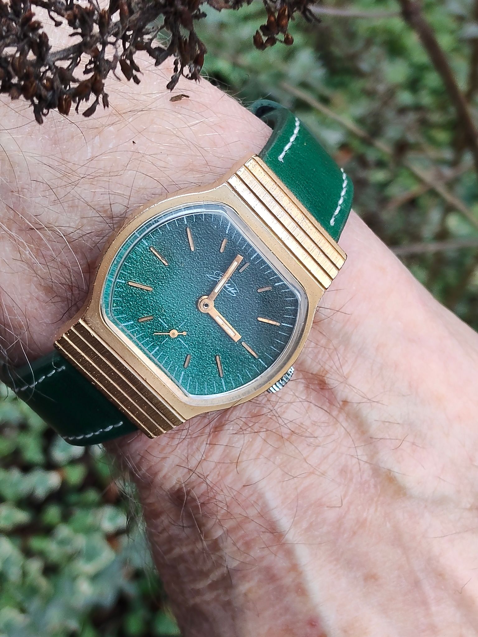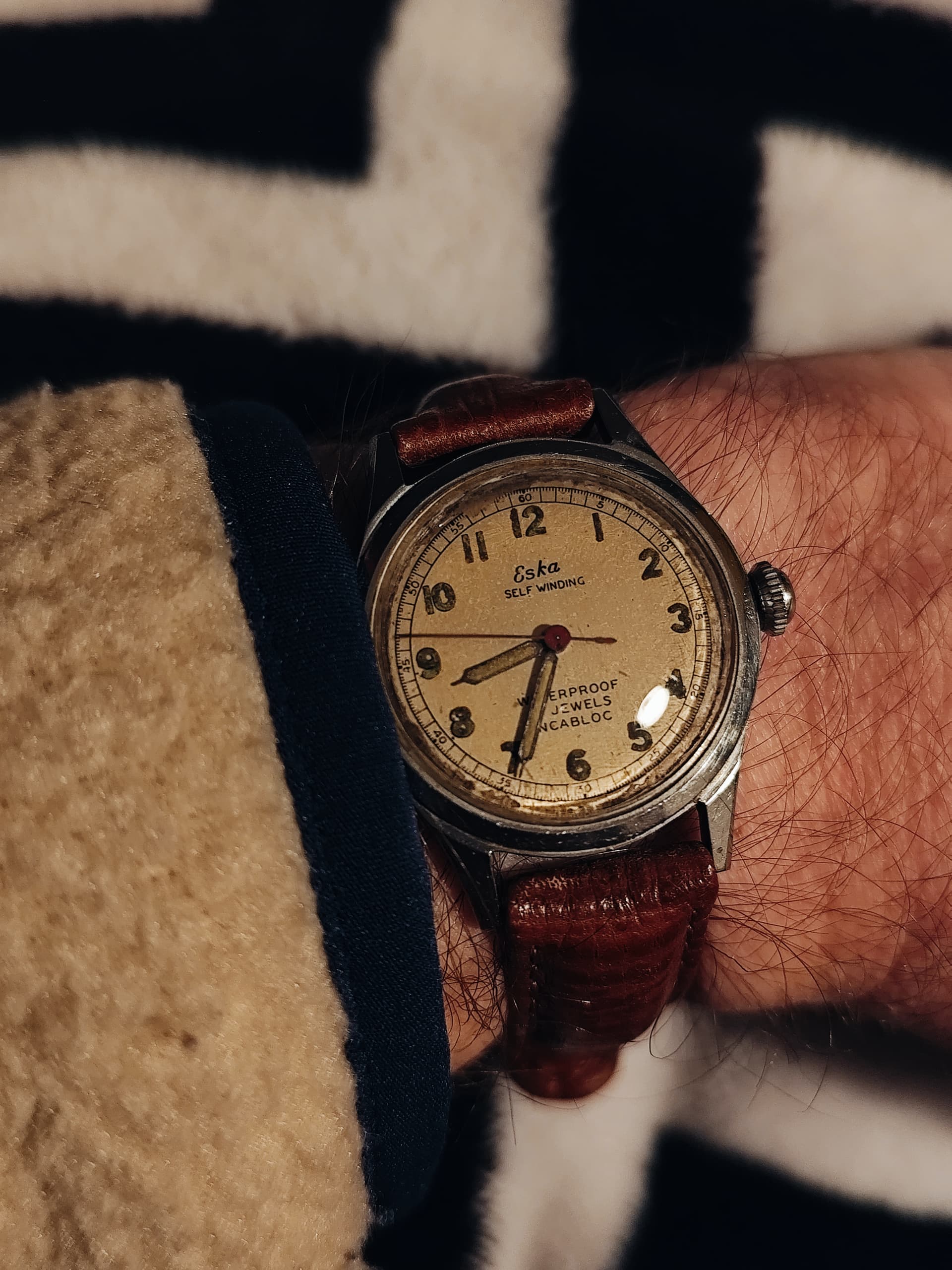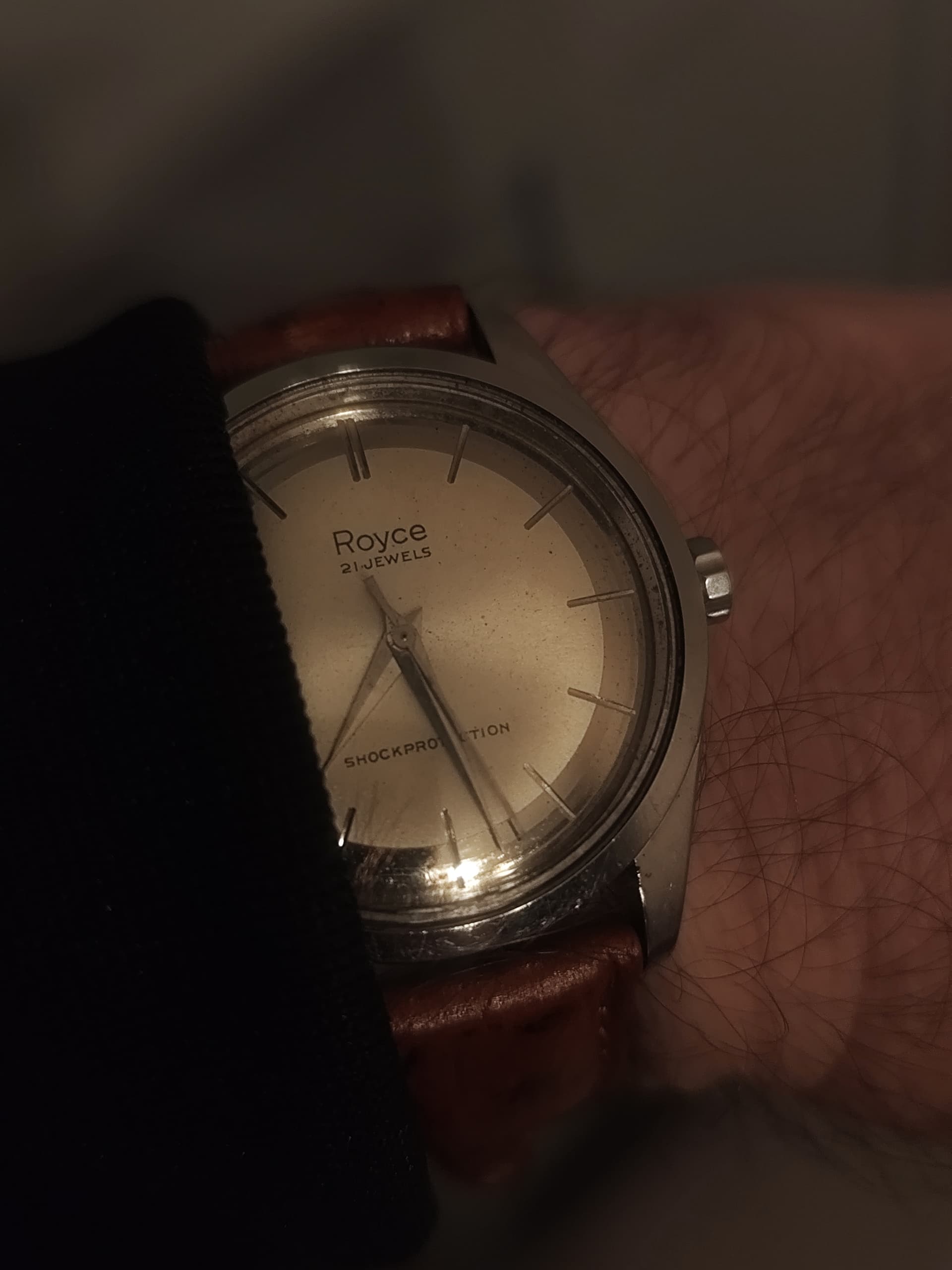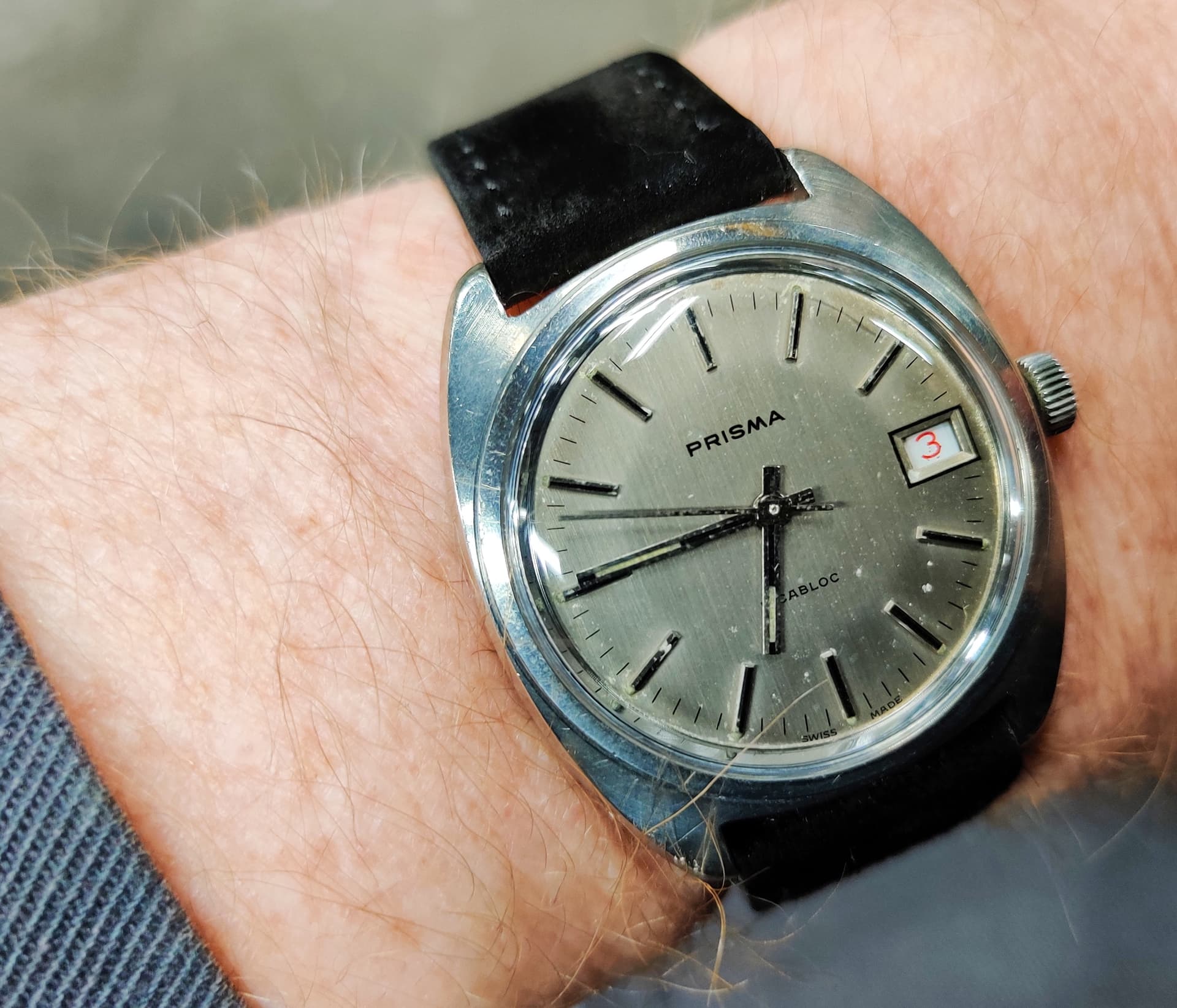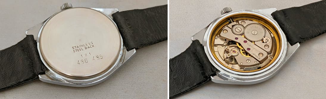 Zoals je kunt zien is het geen chique dress watch of dikke chronograaf of een ingewikkelde duikert, maar gewoon een lekker simpel handopgewonden horloge voor alle dag met een prima en voor mij comfortabel maatje van 36 mm en 40 mm over de lugs. Het heeft een paar leuke ontwerp trekjes, zoals een mooi klassiek cijferfont, zwarte wijzers en, vrij ongebruikelijk voor Europese horloges uit die tijd (ik schat eind jaren '60 ) een vlak mineraalglas en geen plexi, wat het horloge een enigszins Japans karakter geeft. Gezien het Franse Lorsa uurwerk is het echter geenszins een product uit het verre oosten.