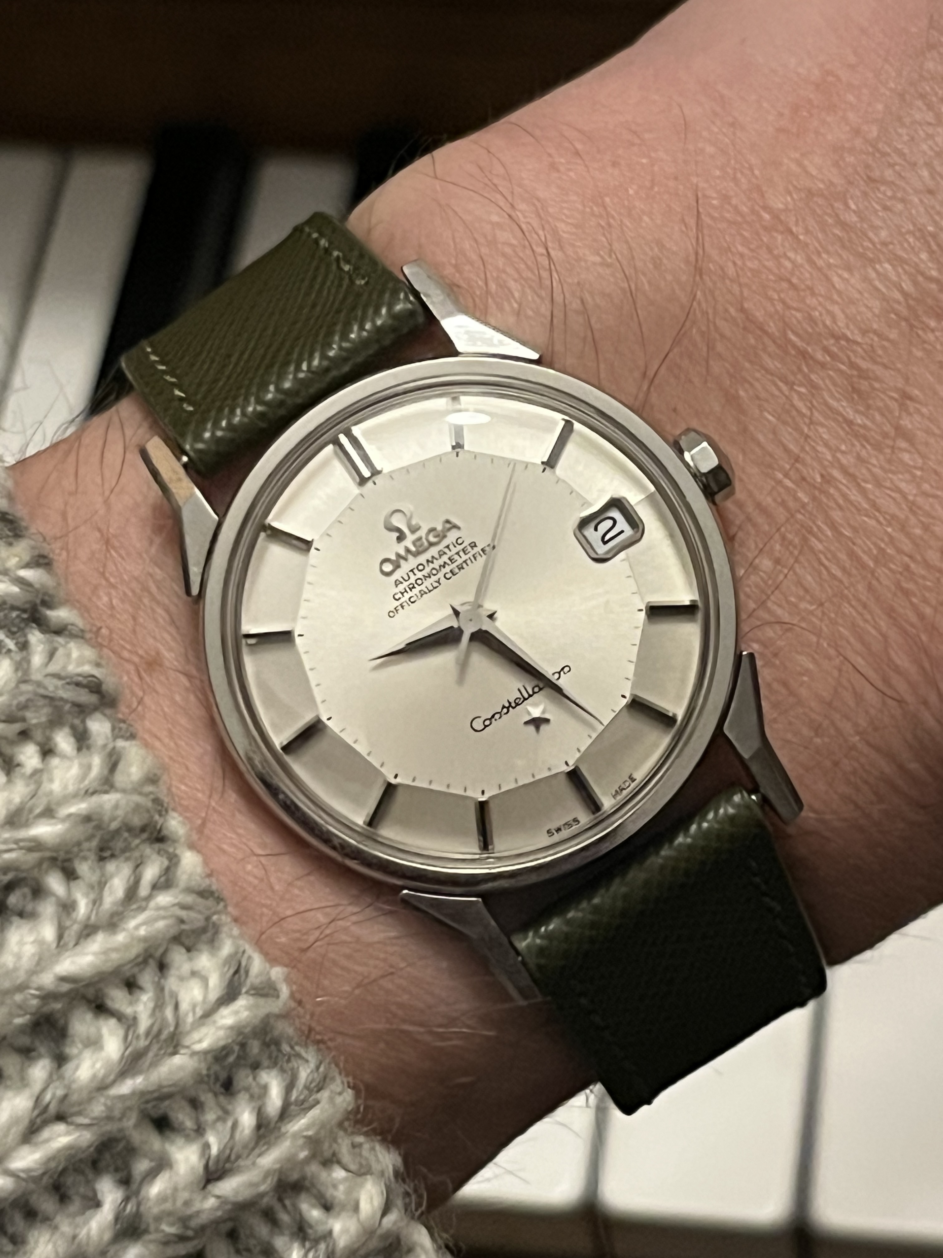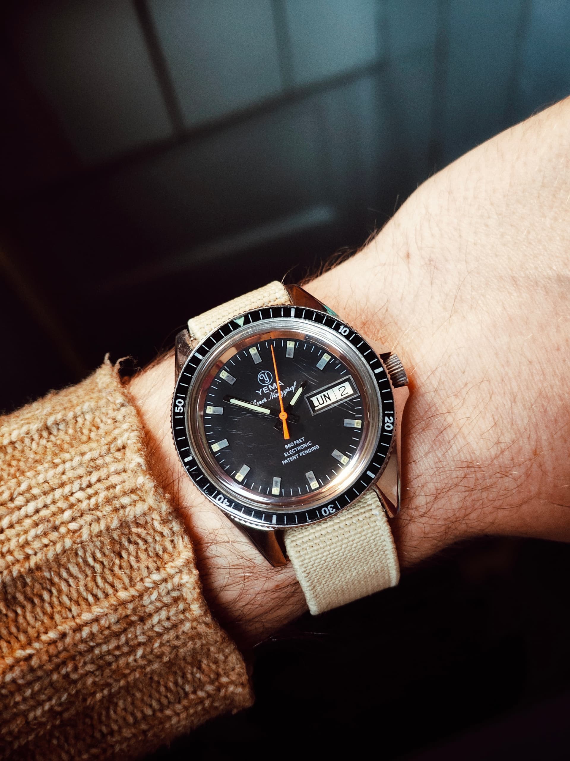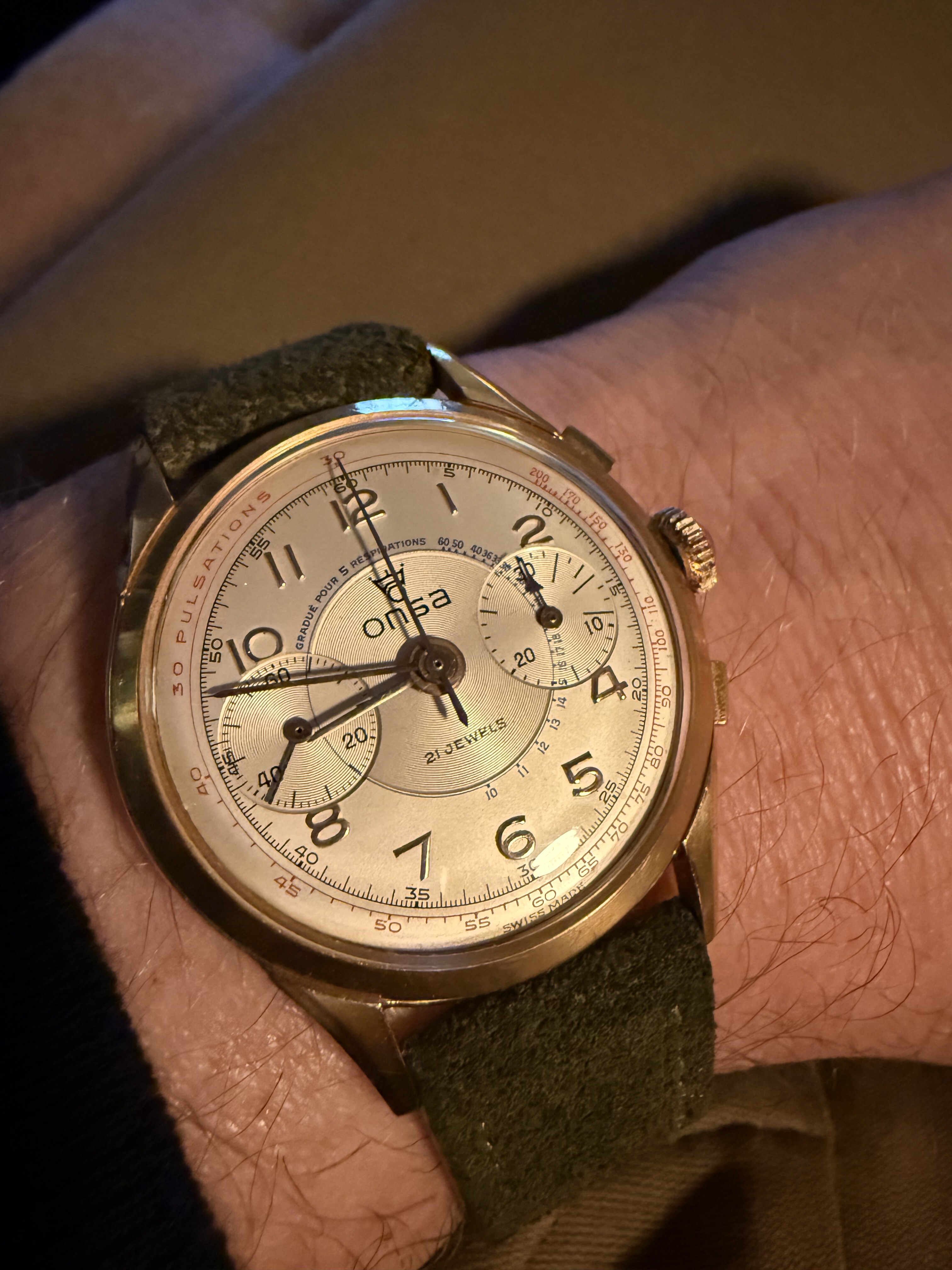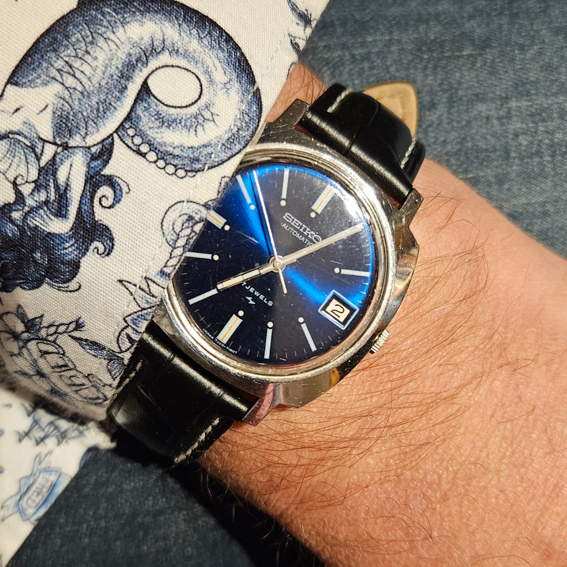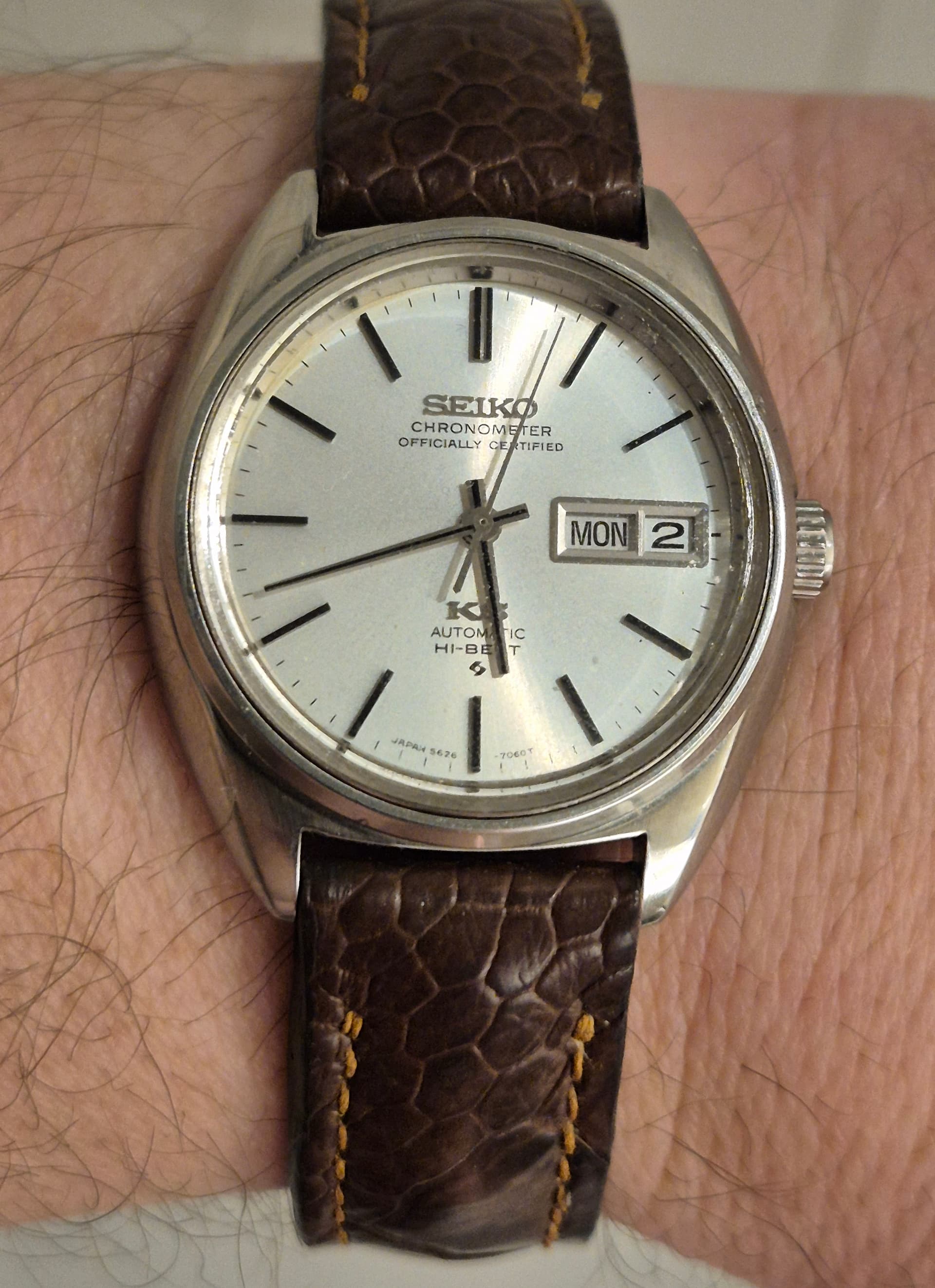 Zoals je kunt zien is het geen chique dress watch of dikke chronograaf of een ingewikkelde duikert, maar gewoon een lekker simpel handopgewonden horloge voor alle dag met een prima en voor mij comfortabel maatje van 36 mm en 40 mm over de lugs. Het heeft een paar leuke ontwerp trekjes, zoals een mooi klassiek cijferfont, zwarte wijzers en, vrij ongebruikelijk voor Europese horloges uit die tijd (ik schat eind jaren '60 ) een vlak mineraalglas en geen plexi, wat het horloge een enigszins Japans karakter geeft. Gezien het Franse Lorsa uurwerk is het echter geenszins een product uit het verre oosten.
