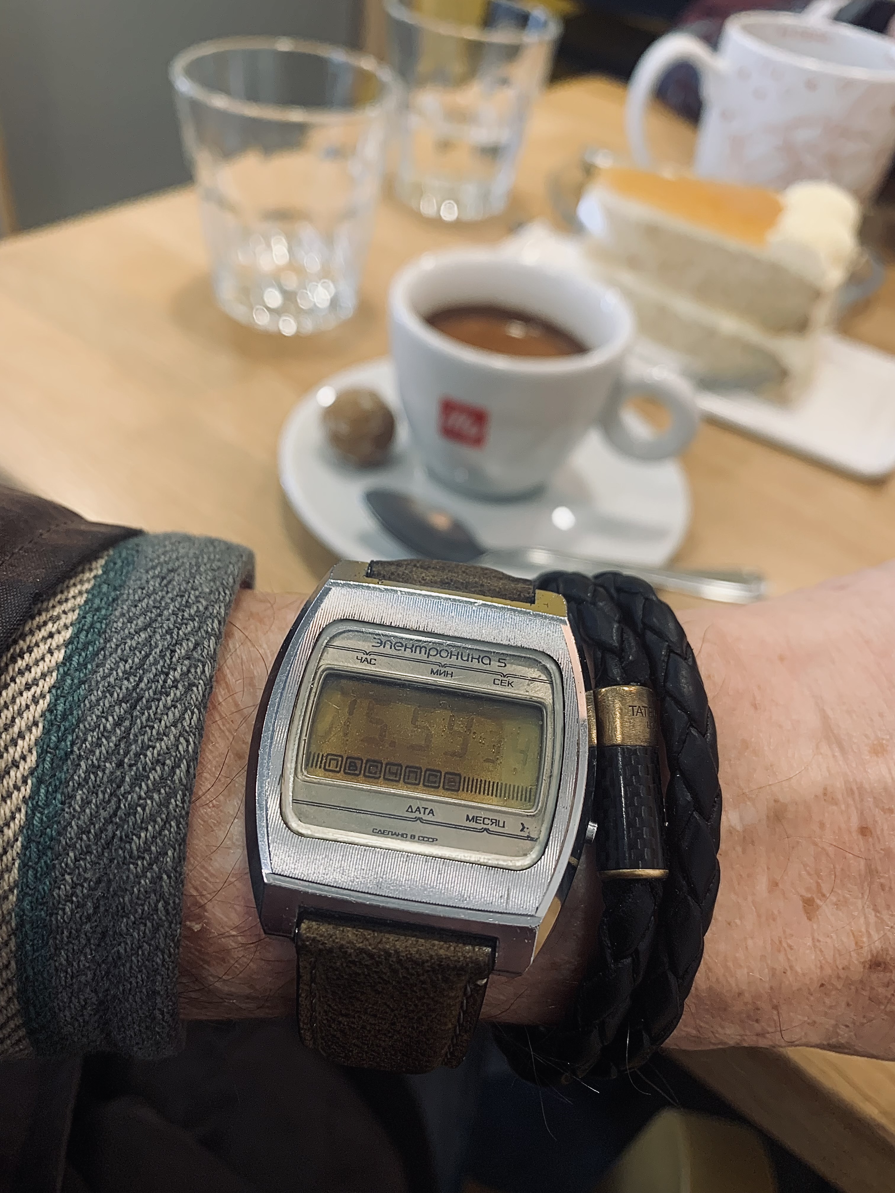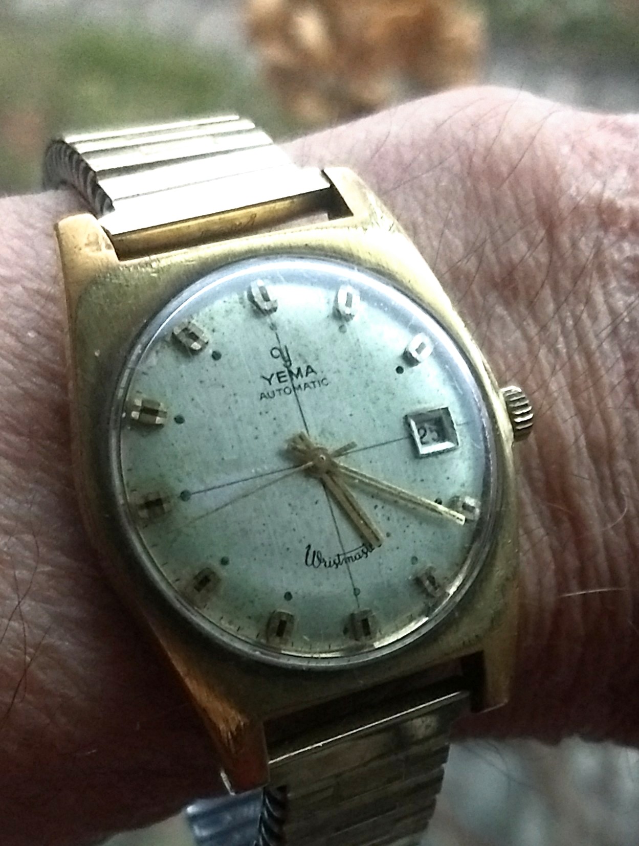 Klein regiefoutje: toen ik het ding ging fotograferen (vanmiddag) had ik nog niet het idee om er iets over te schrijven en heb dus de datum niet op vandaag gezet… Om hem hier te posten bedacht ik pas toen ik 'm vanavond nog steeds aan de pols had. Maar die datum werkt prima, zij het met het enigszins ouderwetse, maar gebruikelijk voor die tijd, snelverzet door de wijzers heen en weer te draaien tussen de 12 en de 9 uur.