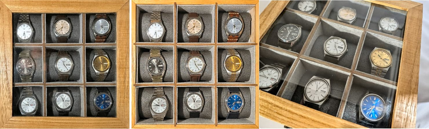 In het kader van de inventarisatie kwam vandaag ook de theedoos waarin mijn Seiko 5-jes wonen en meestal slapen, weer eens tevoorschijn.