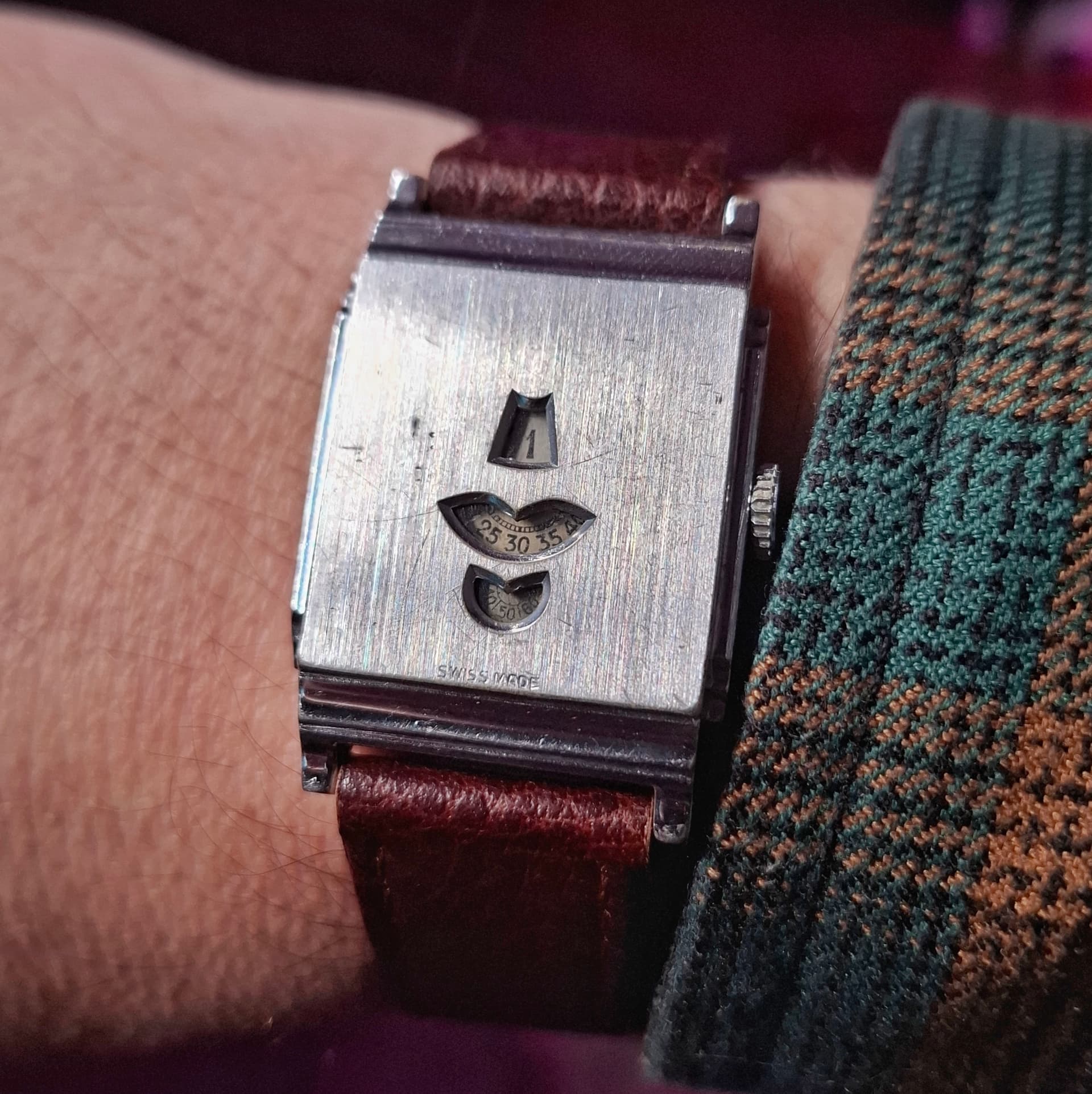 Hieronder de mooie groene aan de pols met eveneens de verkeerde dag en datum. Lastig instellen deze, want niet het systeem van voor de dag de ene kant op draaien en de datum de andere kant op. Deze 7009 stel je in door op de kroon te drukken, diep drukken voor de dag en zachtjes drukken voor de datum… of andersom… of zo iets. Dat hebben ze bij Seiko later gelukkig veranderd.