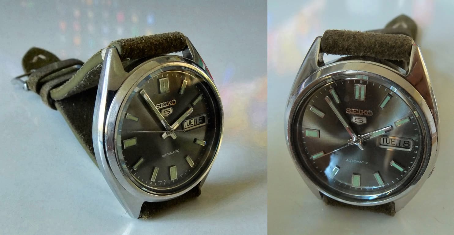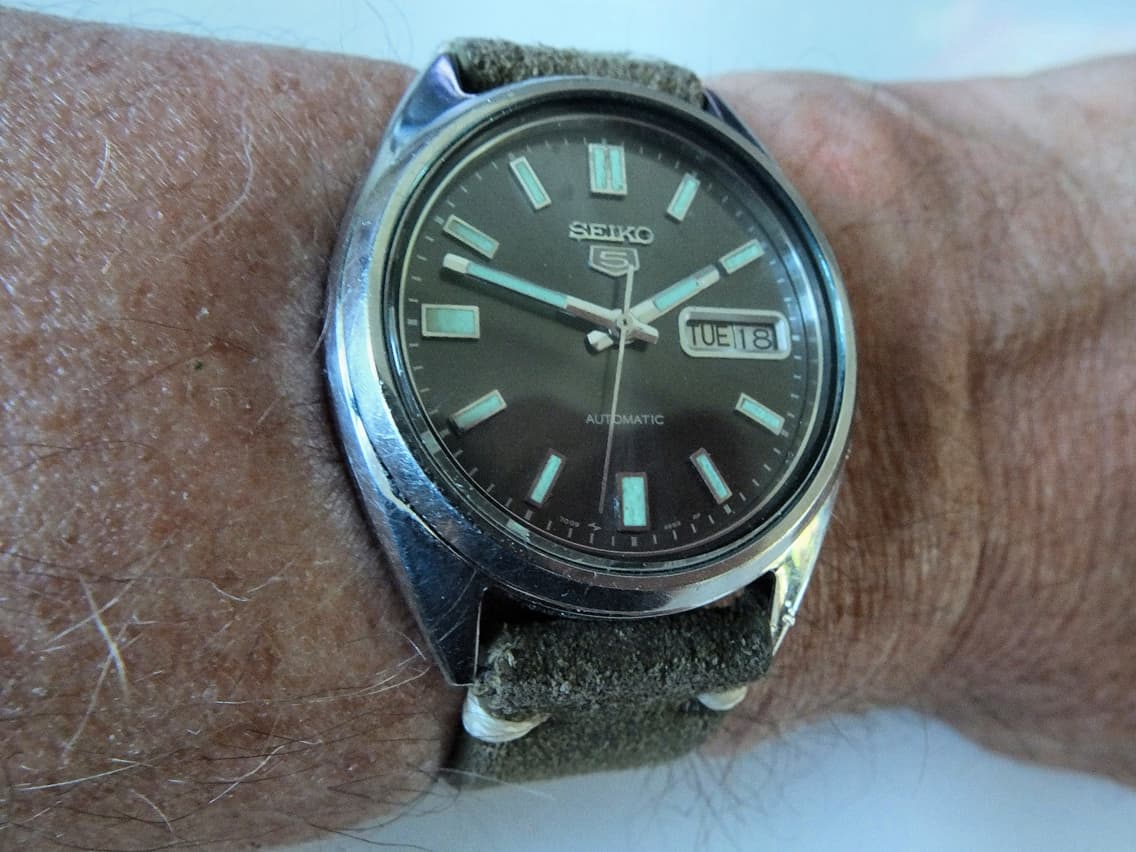 Toen ik inmiddels al weer een paar jaar actief was op het Forum kon ik ergens in, ik meen 2020, van een Forumlid een leuke oude Seiko 5 overnemen, waarbij ik met name gecharmeerd was door de mooie donker grijs-groene wijzerplaat. Ik weet helaas niet meer van wie, want dat heb ik destijds vergeten te noteren.