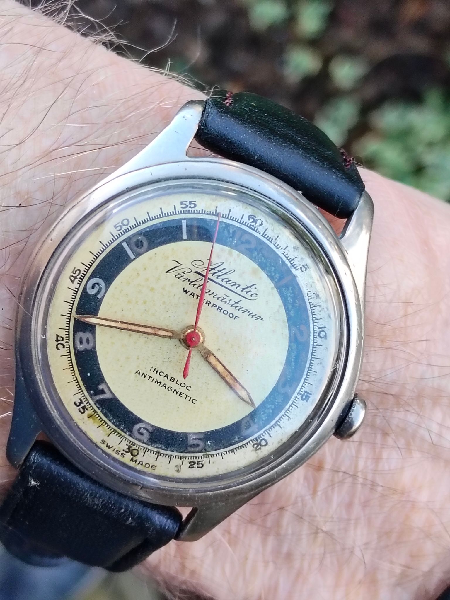 Een paar jaar later, ergens in 2022, ging ik voor de eerste keer op bezoek bij het meest illustere horloge-echtpaar van HF, namelijk @fredpanarai1 en zijn lieve ega @Assie62. Een voor een uurtje gepland bezoekje liep uit tot enige uren en ik ging flink wat later dan voorzien weer naar huis met een enorme boodschappentas vol spullen, waar Ferry mee aan het hobbyen had willen gaan, maar waar hij door de technische implicaties toch maar vanaf had gezien. Ik mocht het hele handeltje dus voor een lief prijsje van 'm overnemen. Ik ga hier niet vertellen wat die tas vol allemaal behelsde, maar één object uit de boodschappentas kwam na veel prutsen en klussen uiteindelijk in mijn Seiko theedoos terecht. Het was een los uurwerkje, zonder wijzers en zonder kast, maar met een vreselijk mooie blauwe wijzerplaat. Tot mijn verrassing bleek het uurwerk springlevend en kon ik met wat zoekwerk (deels uit de spullen van diezelfde boodschappentas) een setje bij het model en het uurwerk passende wijzers vinden.