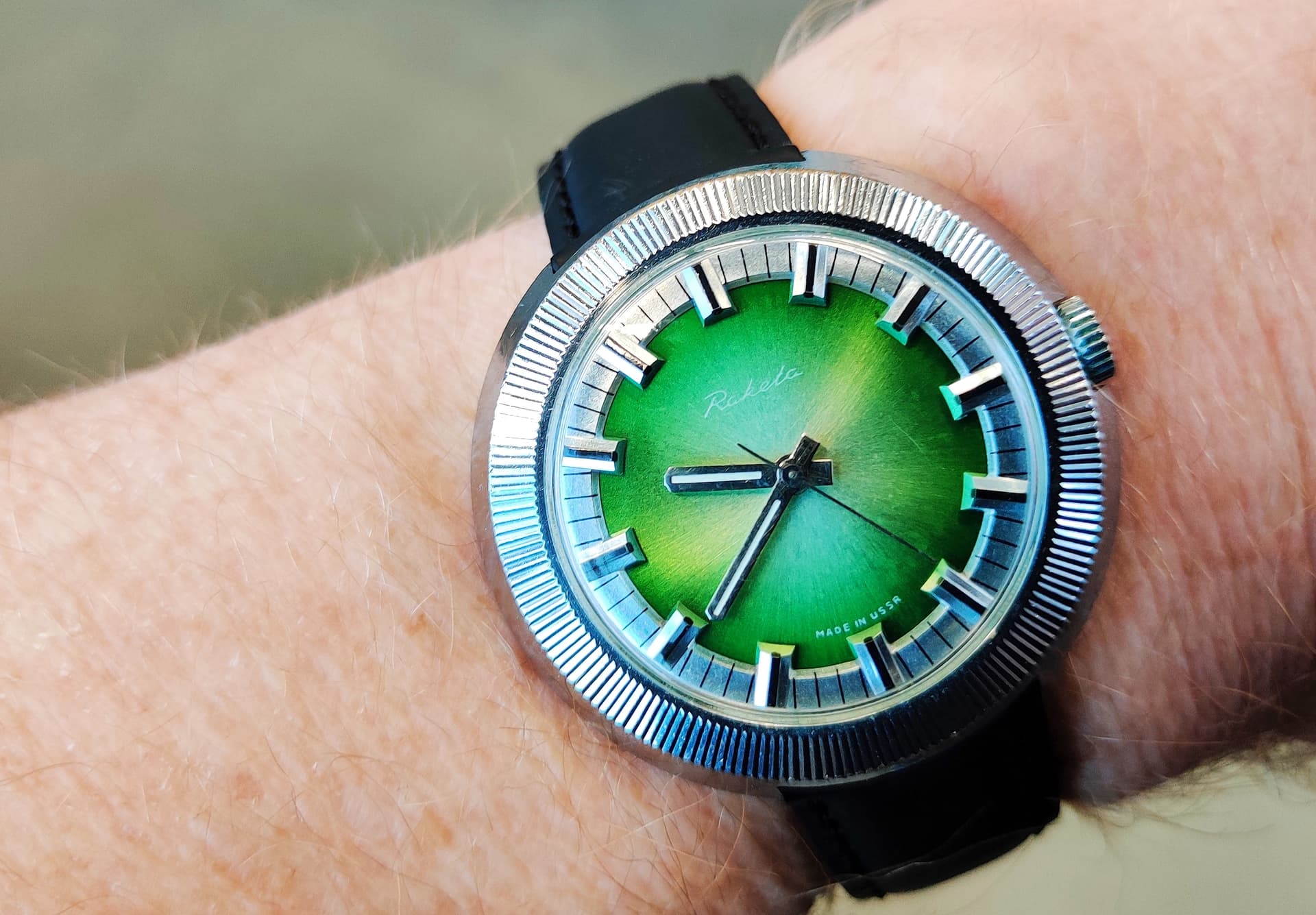 Daarna een gewafelde Slava ‘dresswatch’ met gezellig gekleurde wijzertjes en net zo’n kaliber 2414 aan boord. Dresswatch, wat een rotwoord eigenlijk. Ik kom het ook nog steeds op buitenlandse sites, die automatisch vertaald worden, tegen met de term ‘jurk kijken’. Duhhh!