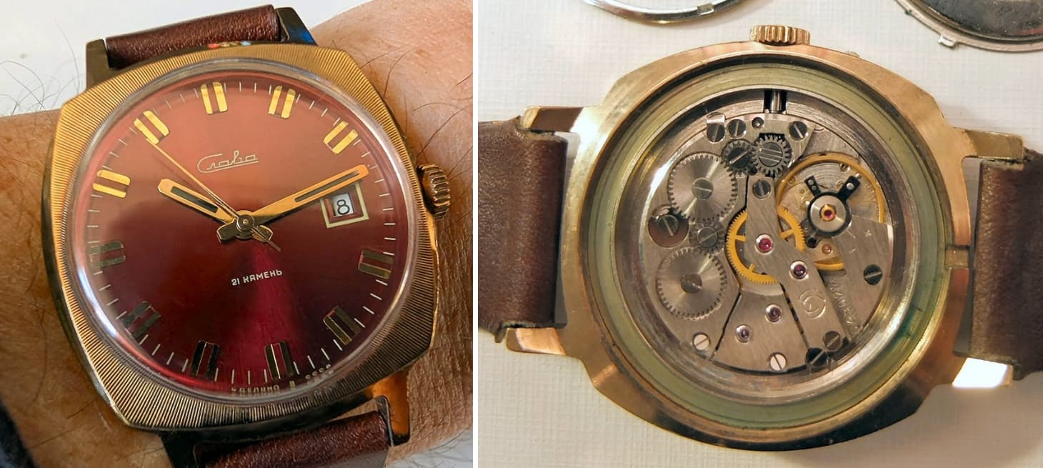 Vanmiddag een Slava handopwinder met het mooie kaliber S2414 met dubbele veerton uit ca. 1980. De wijzerplaat is oranje-rood metallic en wilde zich niet zonder rare reflectie vlekken laten fotograferen.