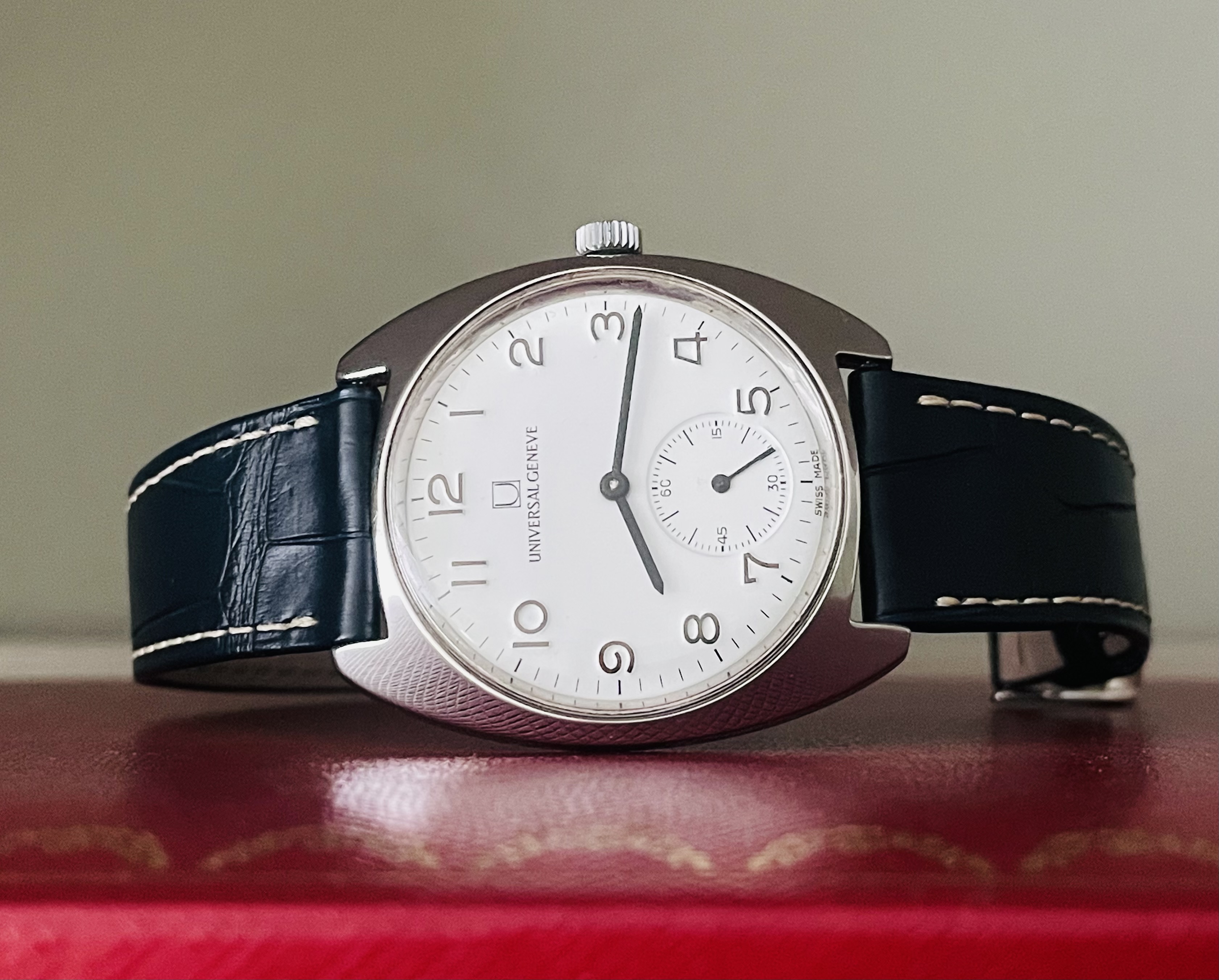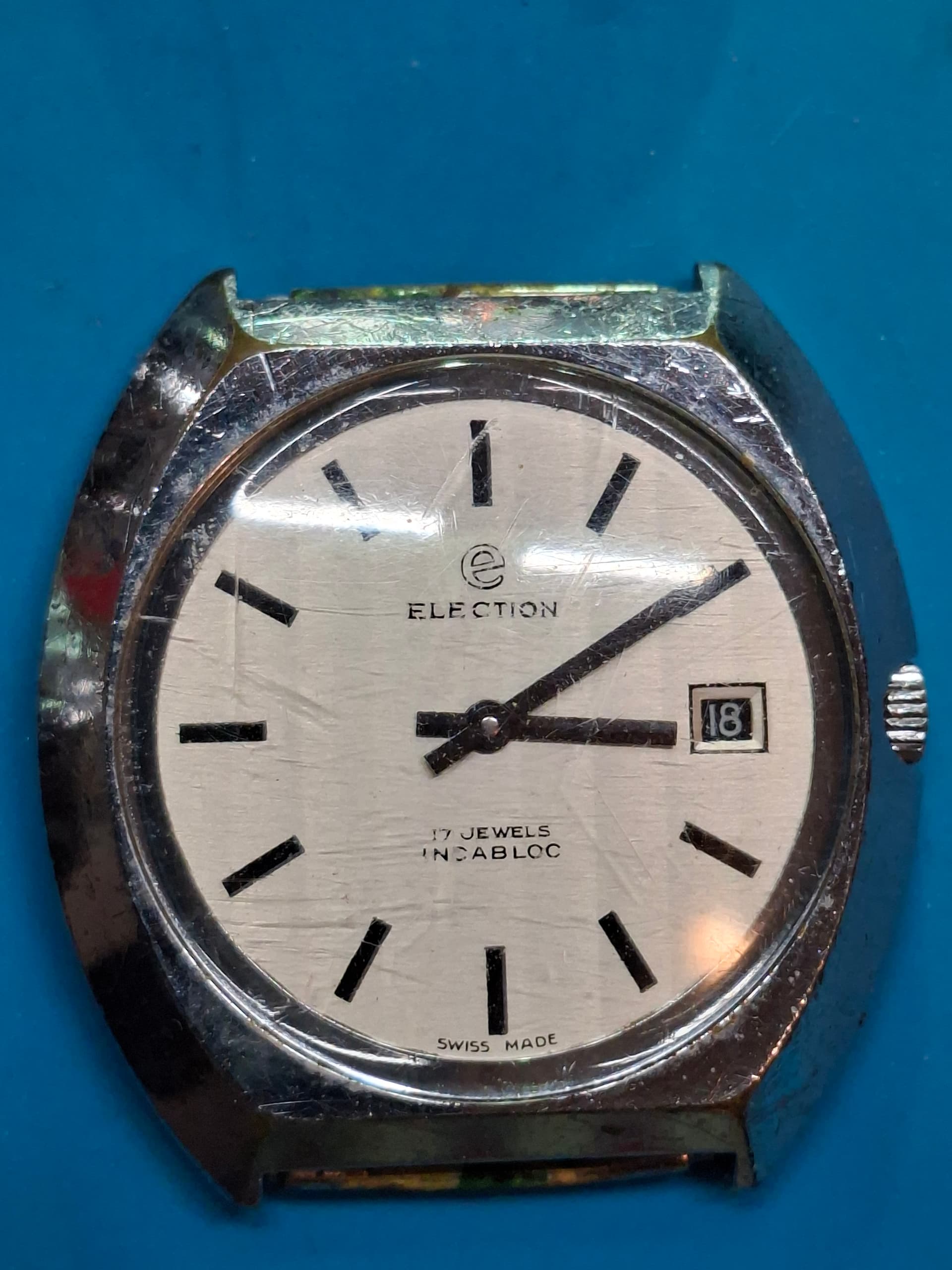 Zit een mooi Peseux 7046 uurwerk in en loopt prachtig. Heb enkel de kast moeten reinigen en het glas was gepolijst. Zitten nog twee kleine plekjes in het glas, maar laat het maar. Is een spanring glas welke heel laag is en die heb ik niet op voorraad.