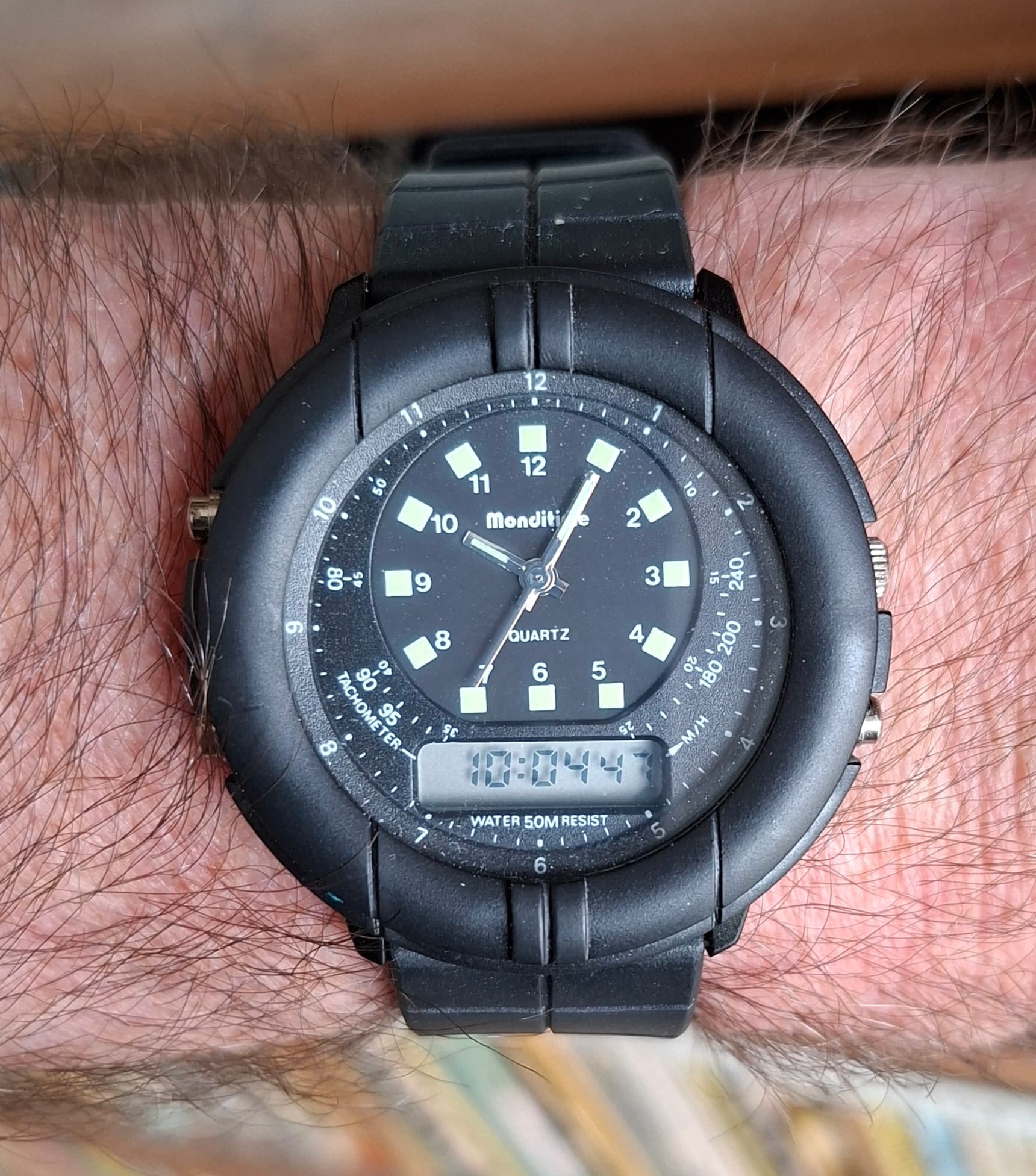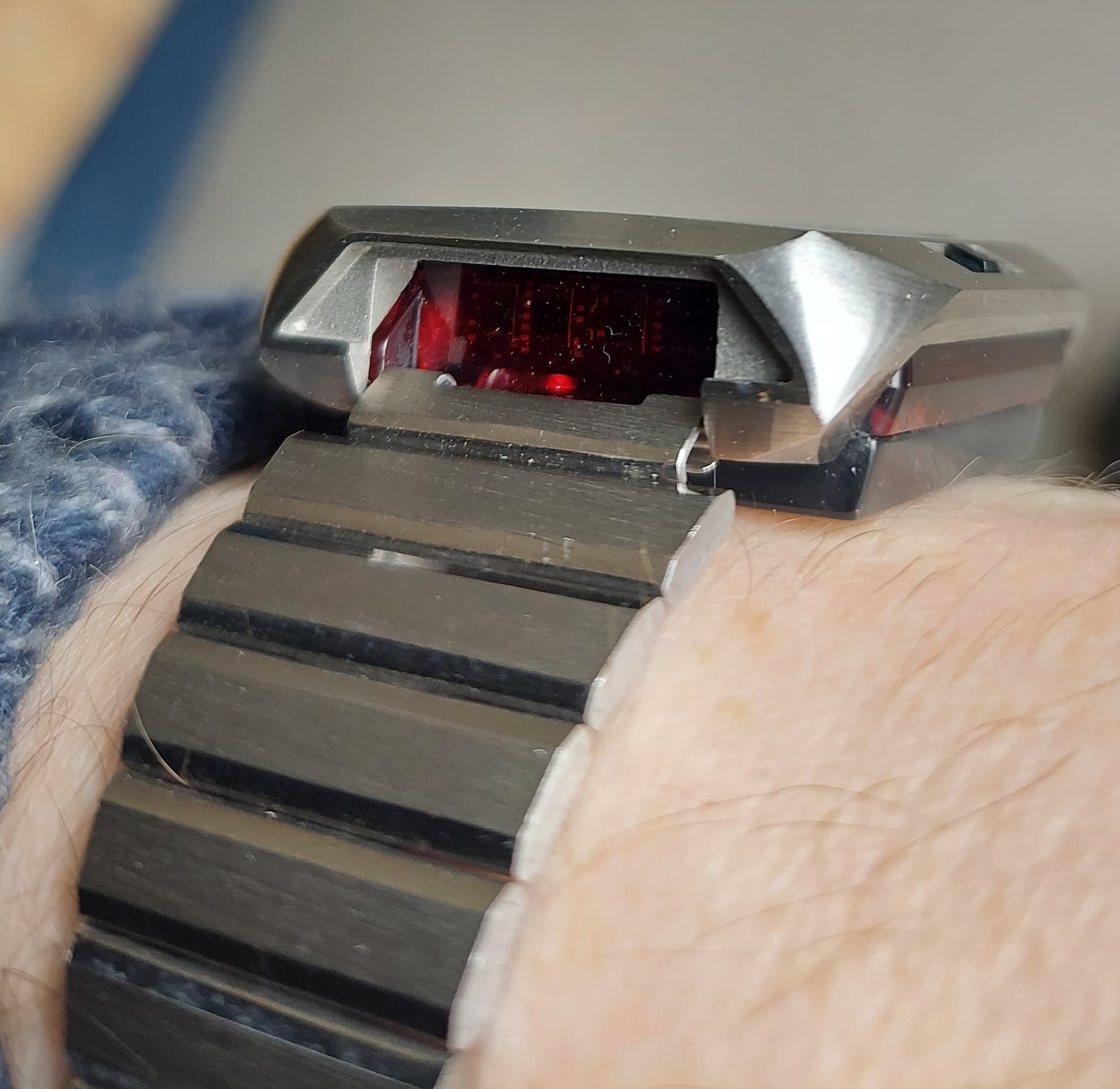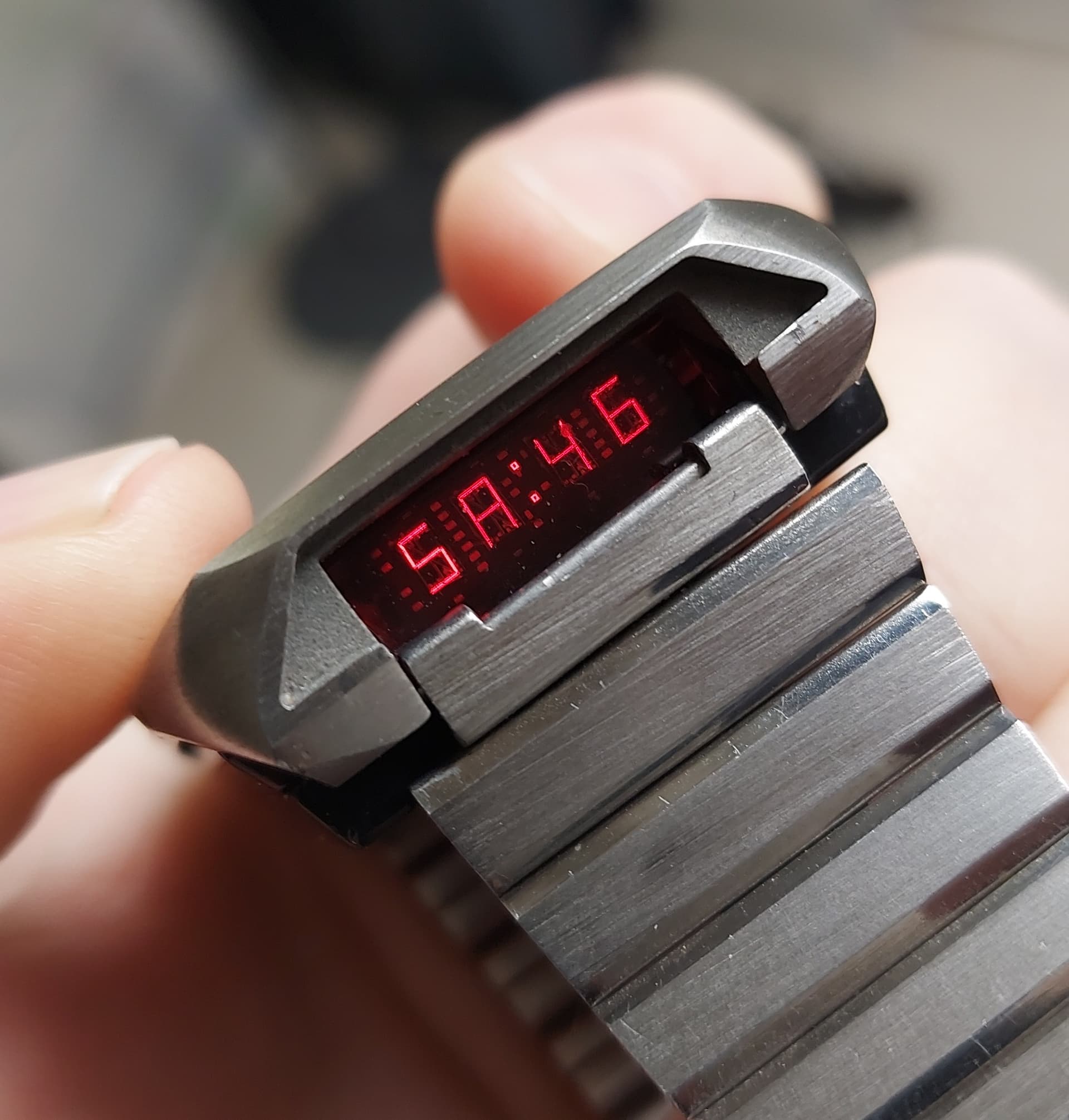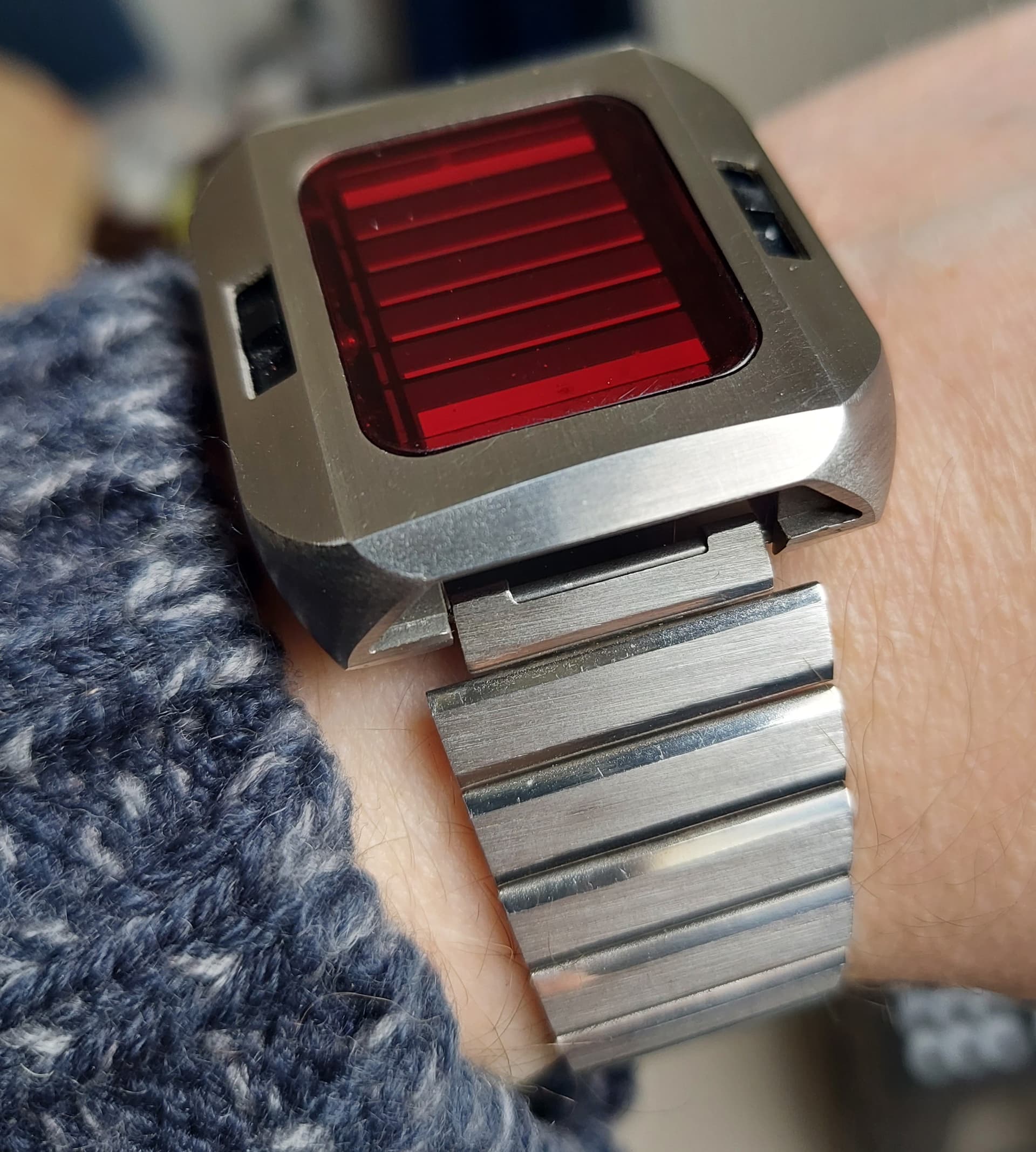 “Synchronar” led horloge op zonne energie. Cool ding. Wel onpraktisch. Er had zo’n “flick wrist switch” op moeten zitten, dat ie met een snelle polsdraai de tijd aan geeft. (Had Pulsar in de jaren 70 al)
