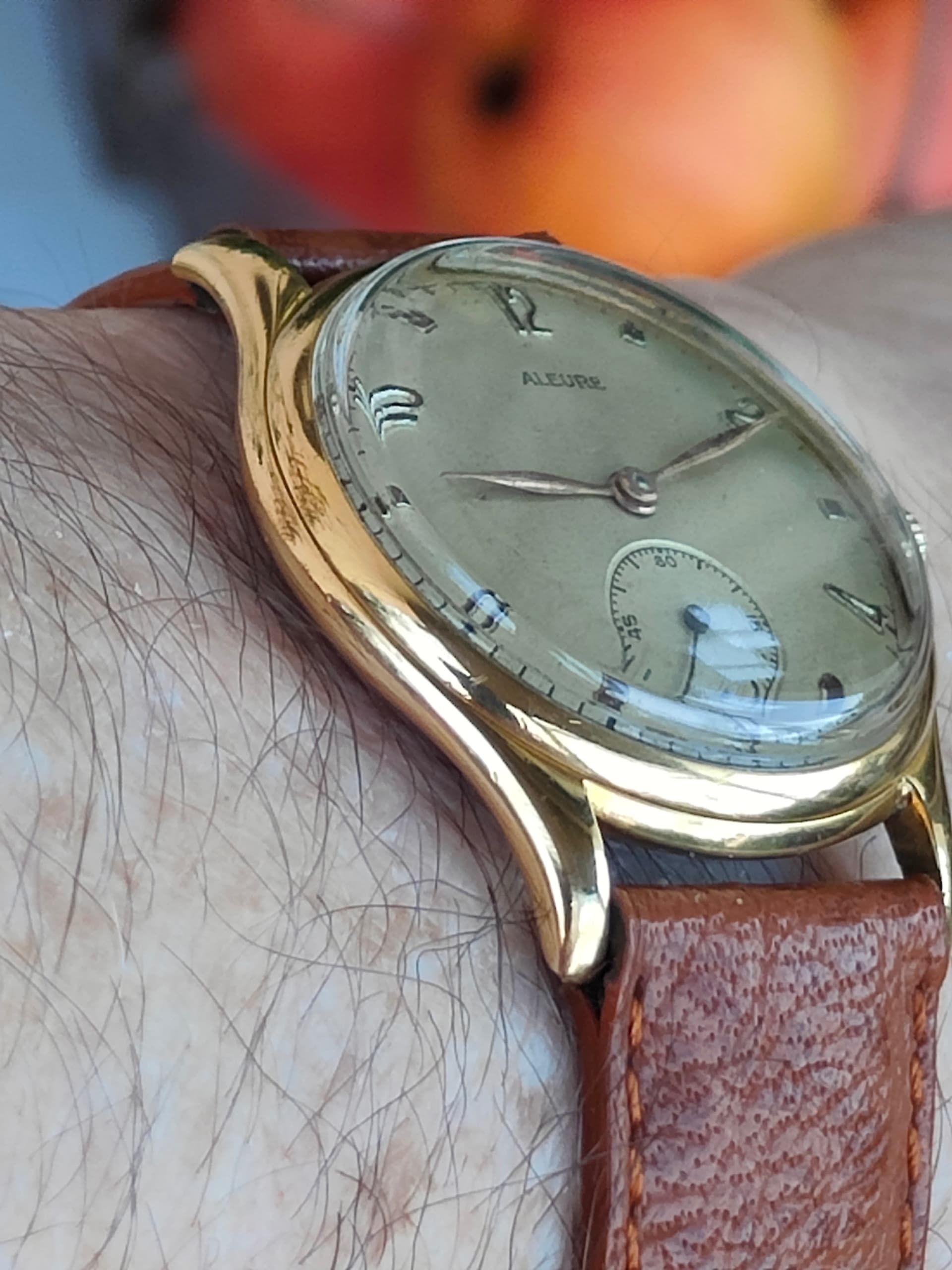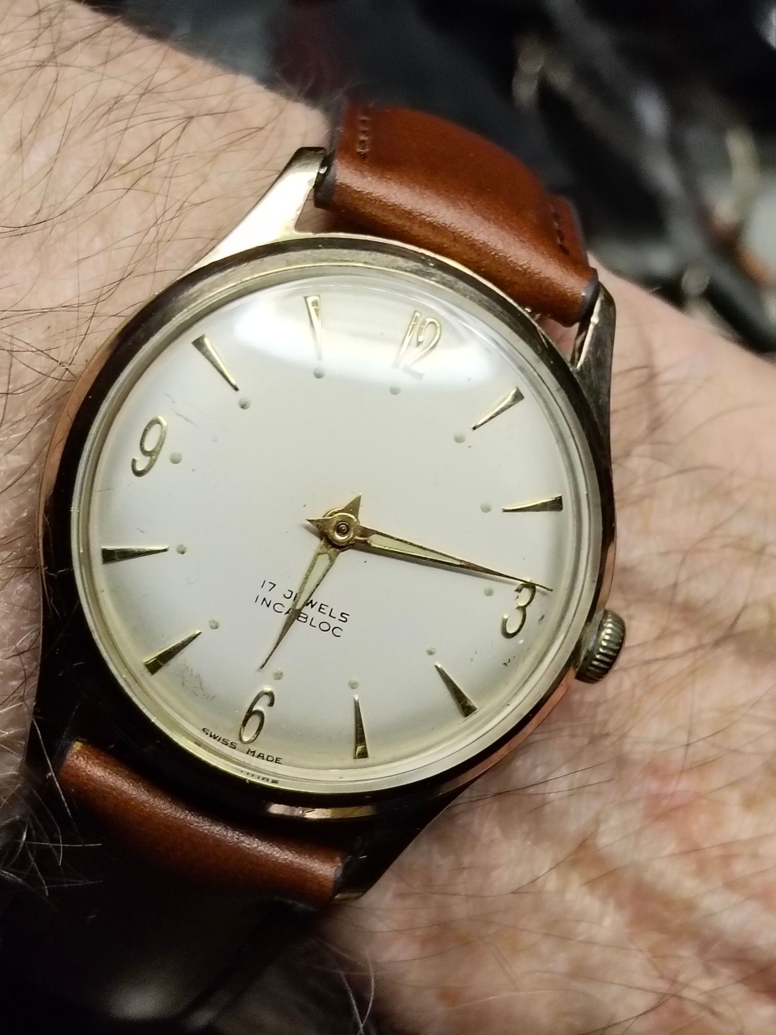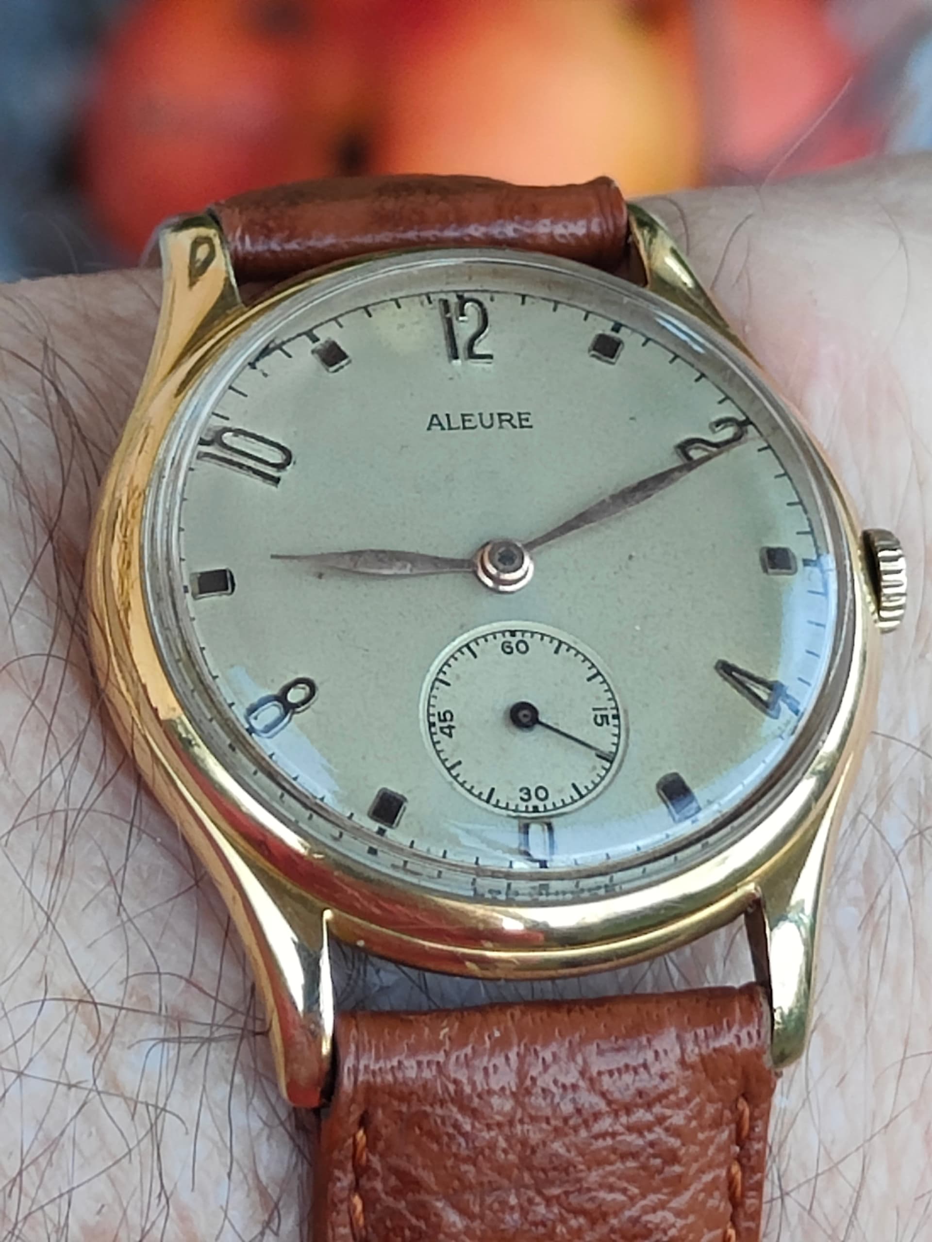 Merk is onbekend, lag al anderhalf jaar in een doos met een stalen band en zonder glas. Ik heb er zojuist een nieuw glas opgezet en een nieuw leren bandje, en een beetje opgepoetst.