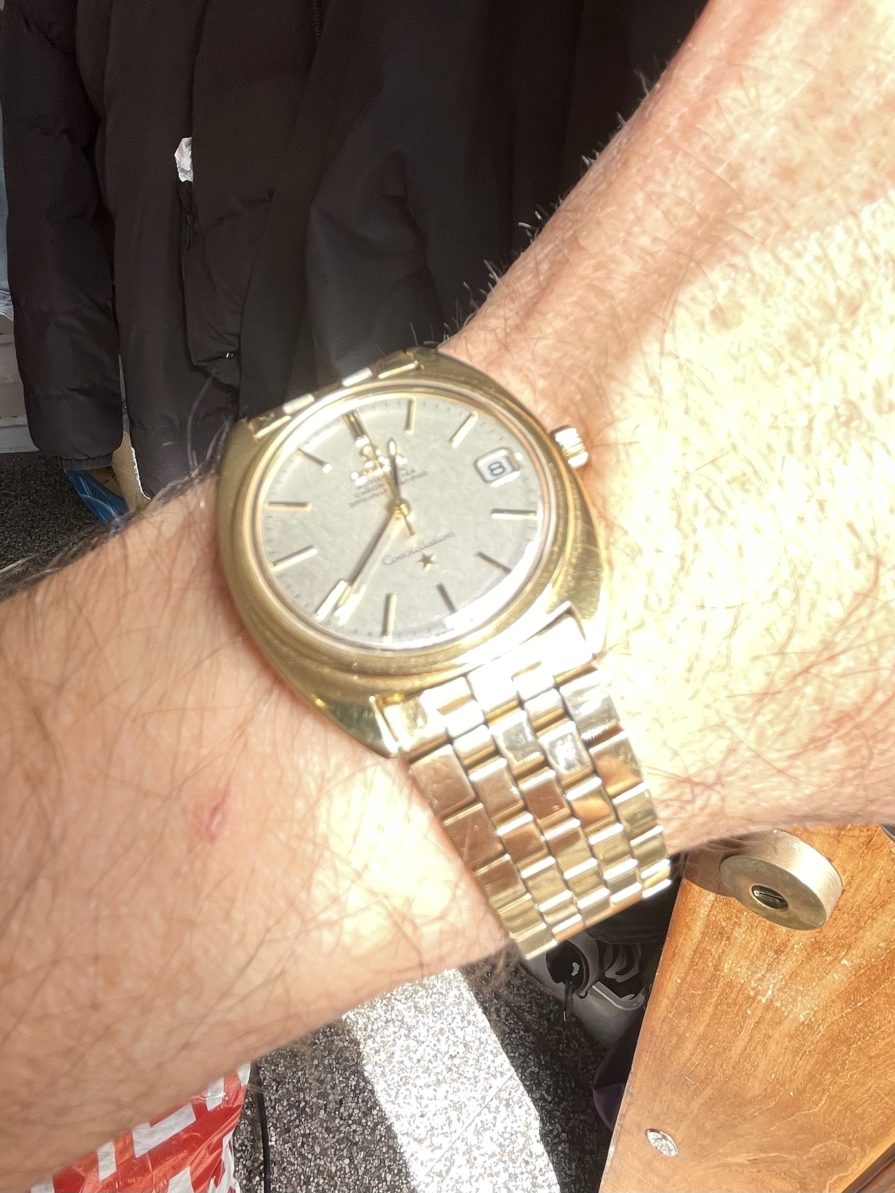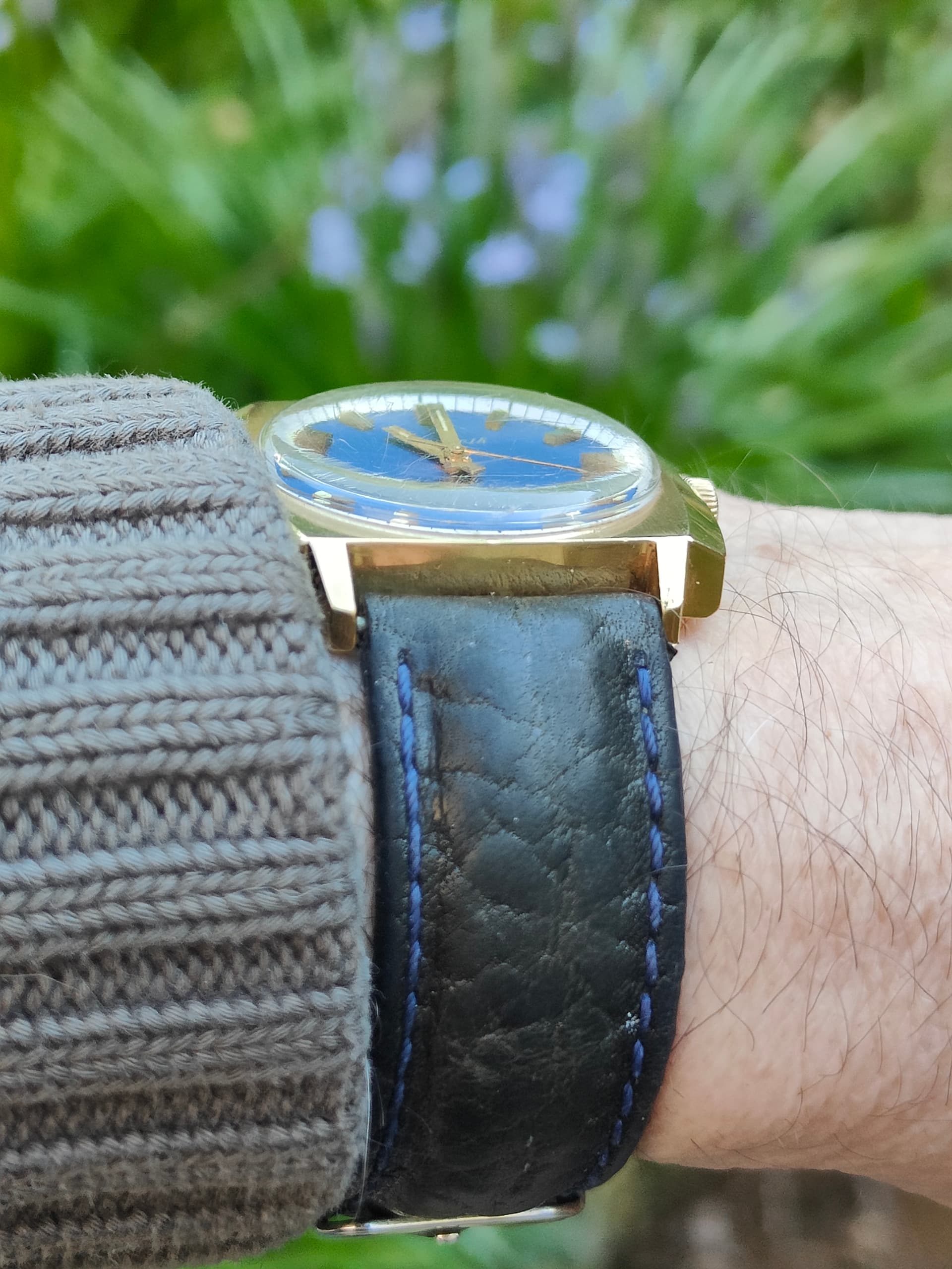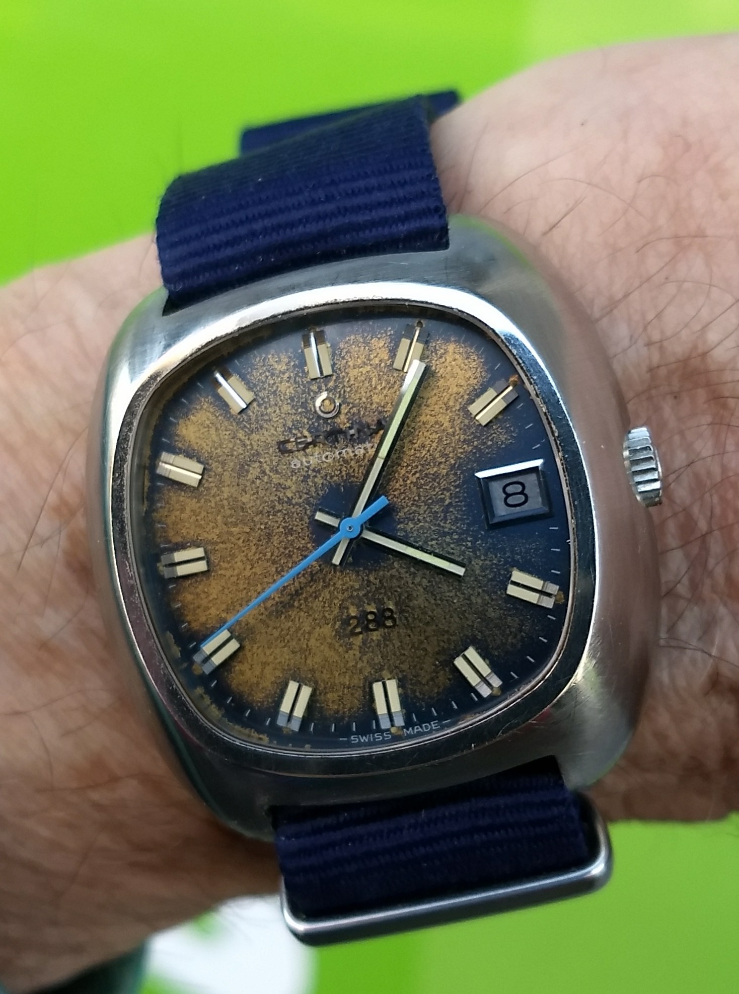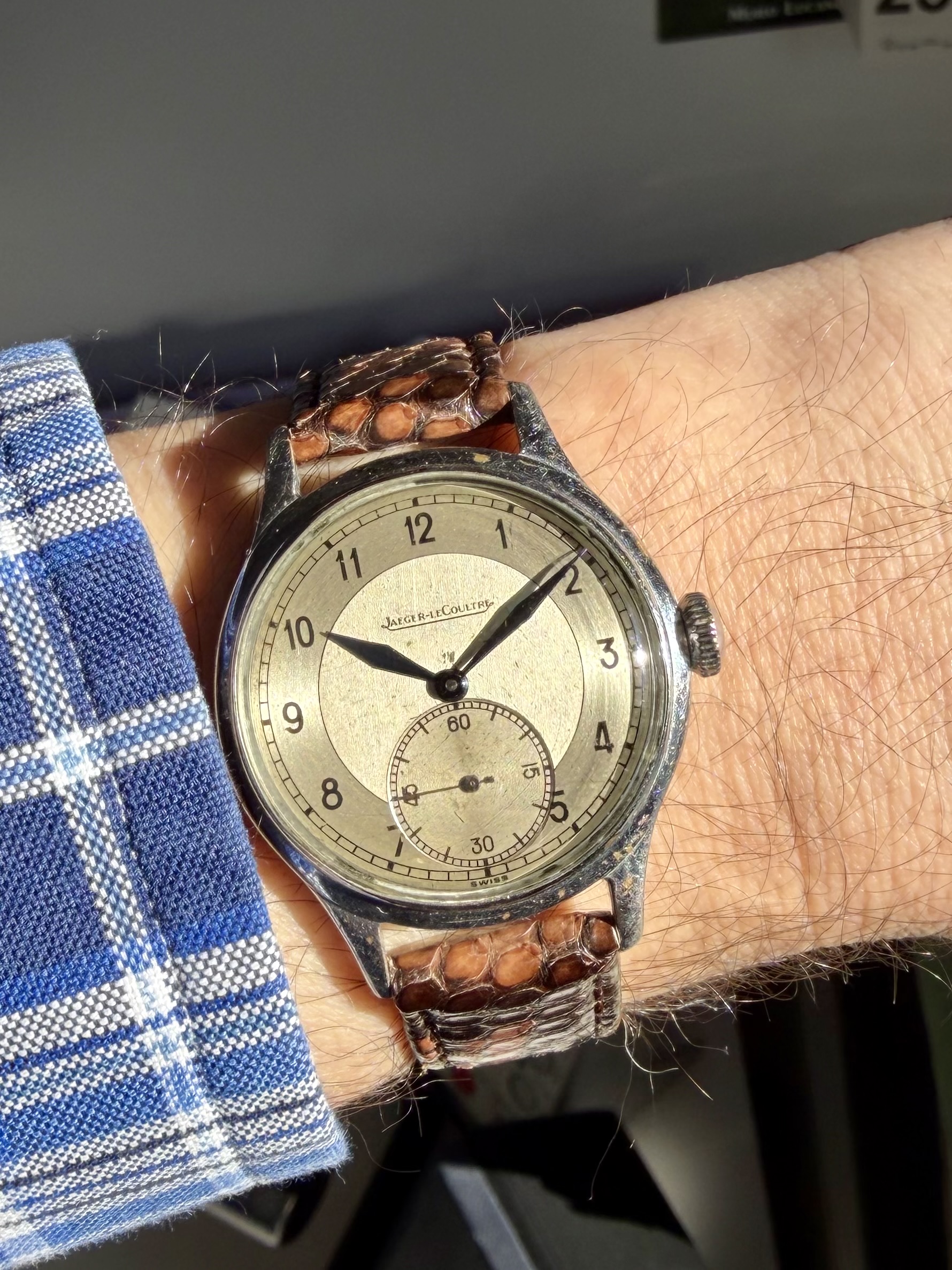 Mooi klassiek model met die tweekleurige wijzerplaat en kleine seconde op 6. De wijzers en cijfers hebben inmiddels een mooie, geleefde uitstraling gekregen, wat het geheel juist wat extra charme geeft.