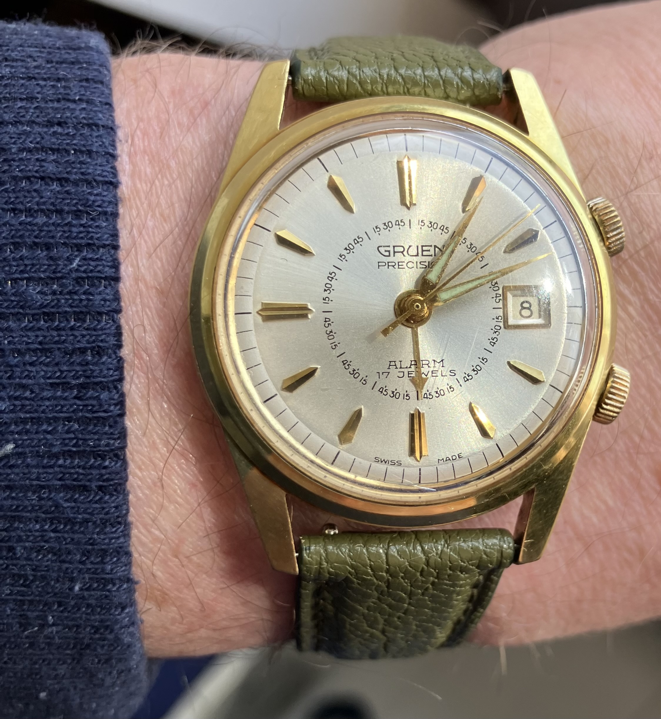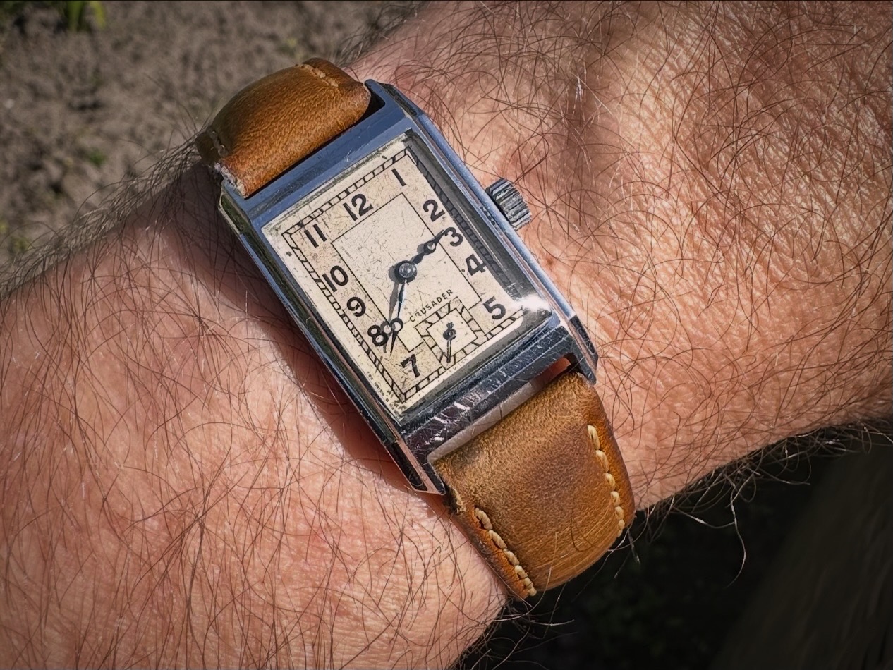 Wat dit horloge voor mij bijzonder maakt, is de wijzerplaat. Mooi gelijkmatig verouderd met een fijne patina, die precies genoeg karakter geeft zonder dat het storend wordt. In combinatie met de kleine seconde heeft het echt die typische jaren ’50 uitstraling.
