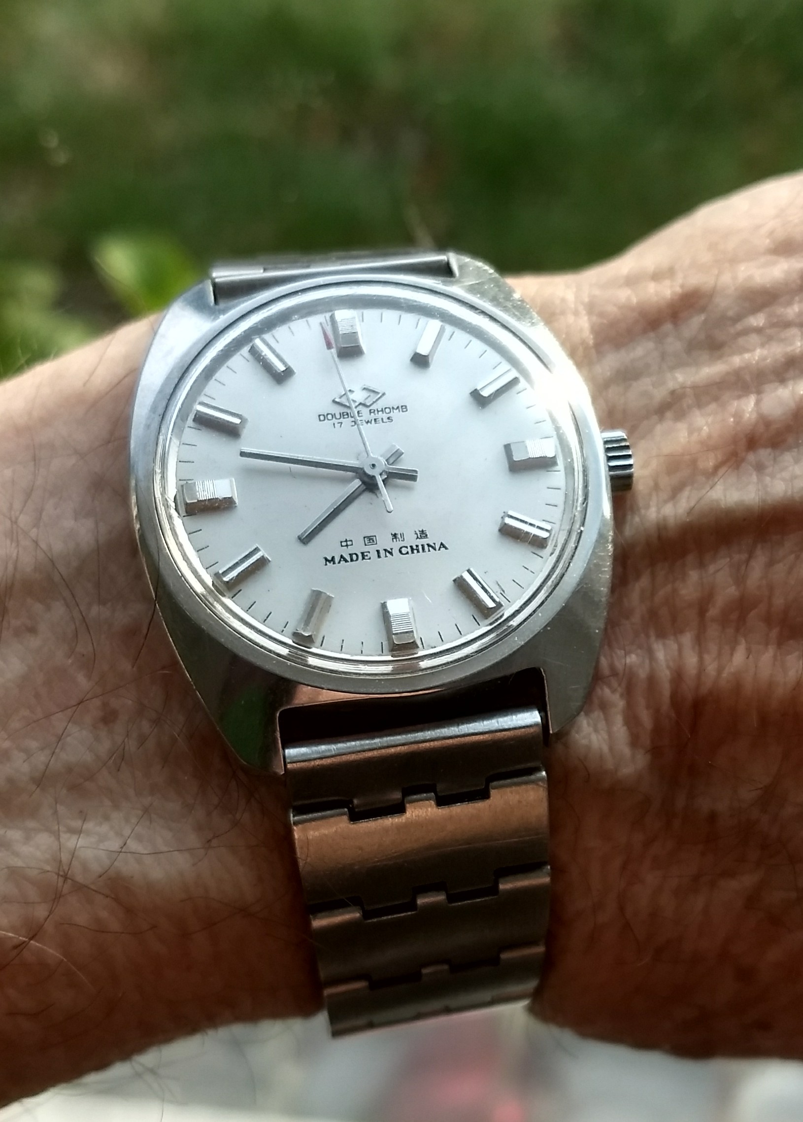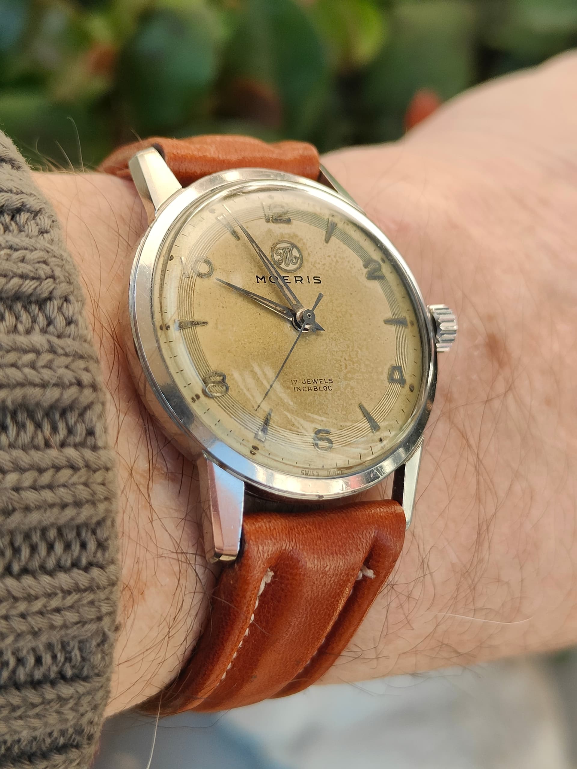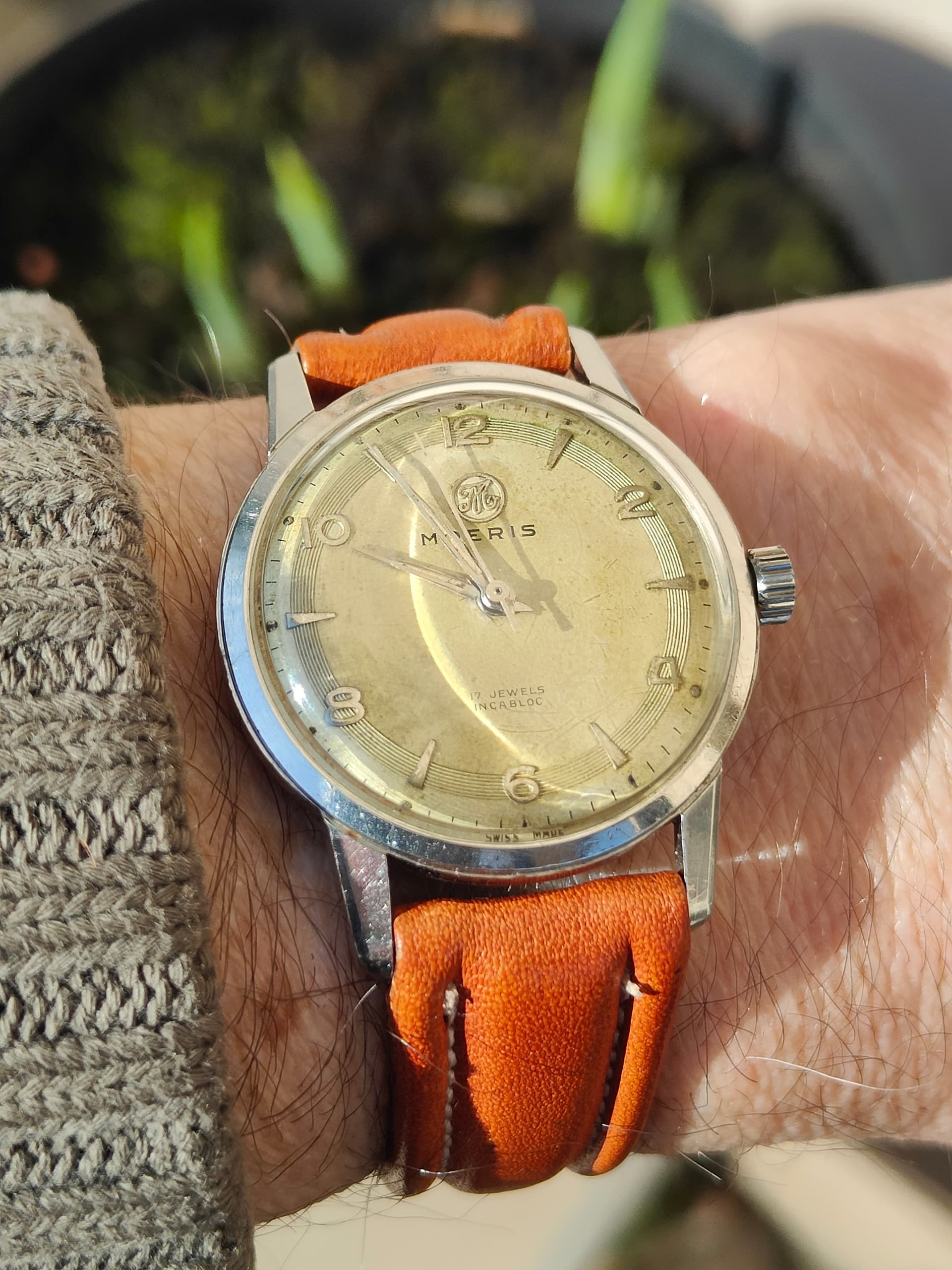 Robijntjes, diamantjes en veel slijtage. Modelnaam onbekend, maar iig een dames veri-thin. Gegraveerd F.M.E. 12-5-42, dus een sinterklaashorloge ![]()