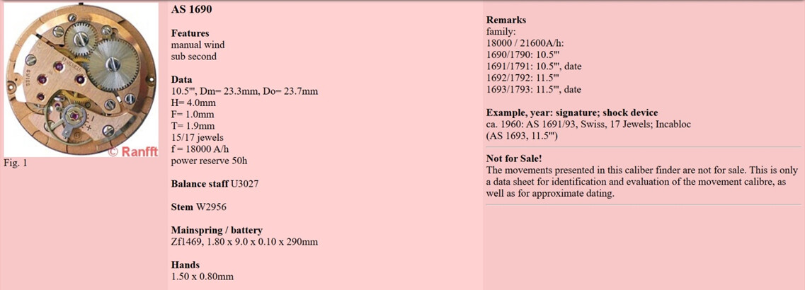 Klein, want het heeft een kast doorsnede van slechts 30 mm. Echter, destijds beslist bedoeld als herenhorloge en door mij nog steeds niet als bezwaarlijk gevonden om te dragen. Binnenin tikt een mooi, degelijk A. Schild AS 1690 uurwerkje. De door Dr. Roland Ranfft (RIP) geschatte productieperiode van dit uurwerk is geschat op rond 1960, wat daarmee ook het horloge op ca. hetzelfde jaar dateert.