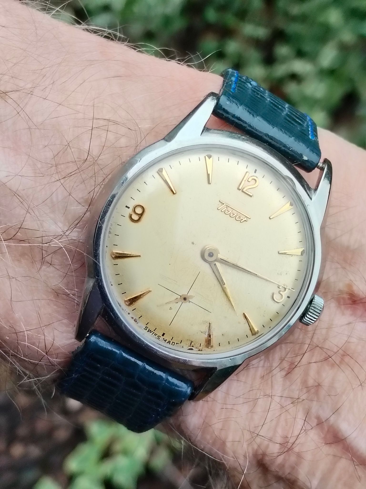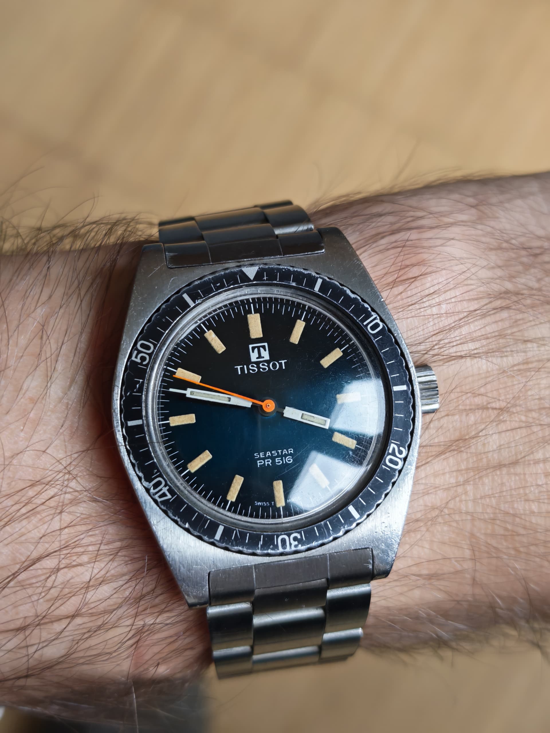 2 jaar geleden gekocht. Andere kast bij gevonden met strakke bezel. Zelfs een andere wijzerplaat. Band uit Japan, origineel Tissot. Service gehad van de Tissot expert himself. Ik heb er nog eens een NA over geschreven geloof ik.