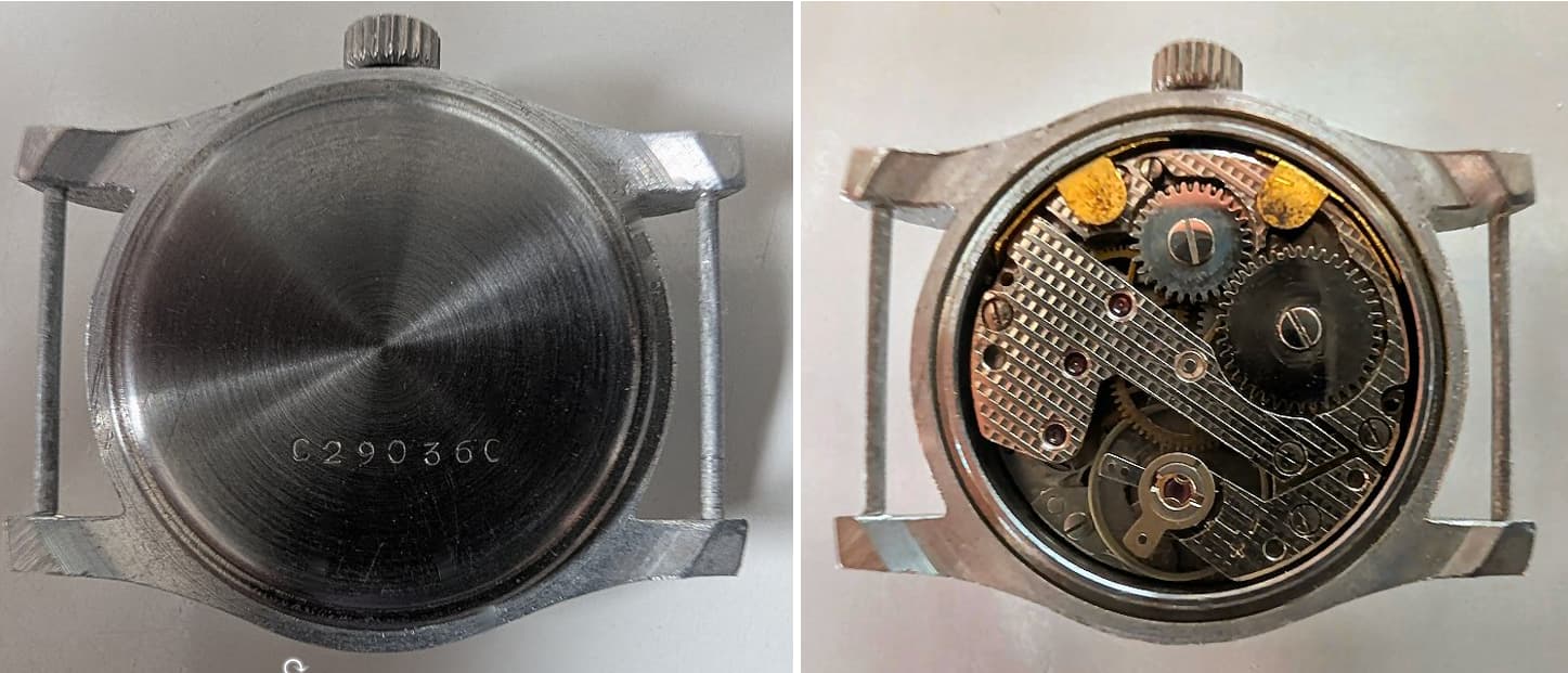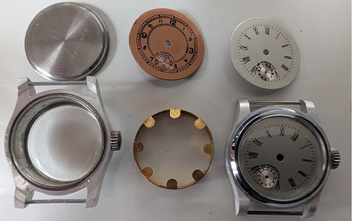 Ik had een heel lotje van die kastjes gekocht, een keer op Vinted, uit Frankrijk. Eigenaardig soort metaal. Geen Zamak, te zacht voor staal en te hard voor aluminium… Misschien Staybright (een vroege soort RVS legering)? Kastjes zijn waarschijnlijk vooroorlogs. Er zit ook geen plexiglas in, maar mooie bolle mineraalglaasjes. Er zaten ook gloednieuwe bullseye merkloze (virgin) wijzerplaatjes in, met helaas de verkeerde as afstand voor de kleine secondenwijzer zoals bijvoorbeeld de FE 233.