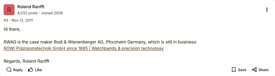 Ik weet het ook niet. Misschien is Rodi & Wienenberger AG, een horlogekastenmaker (“Rowi”) uit Pforzheim, een aanknopingspunt?