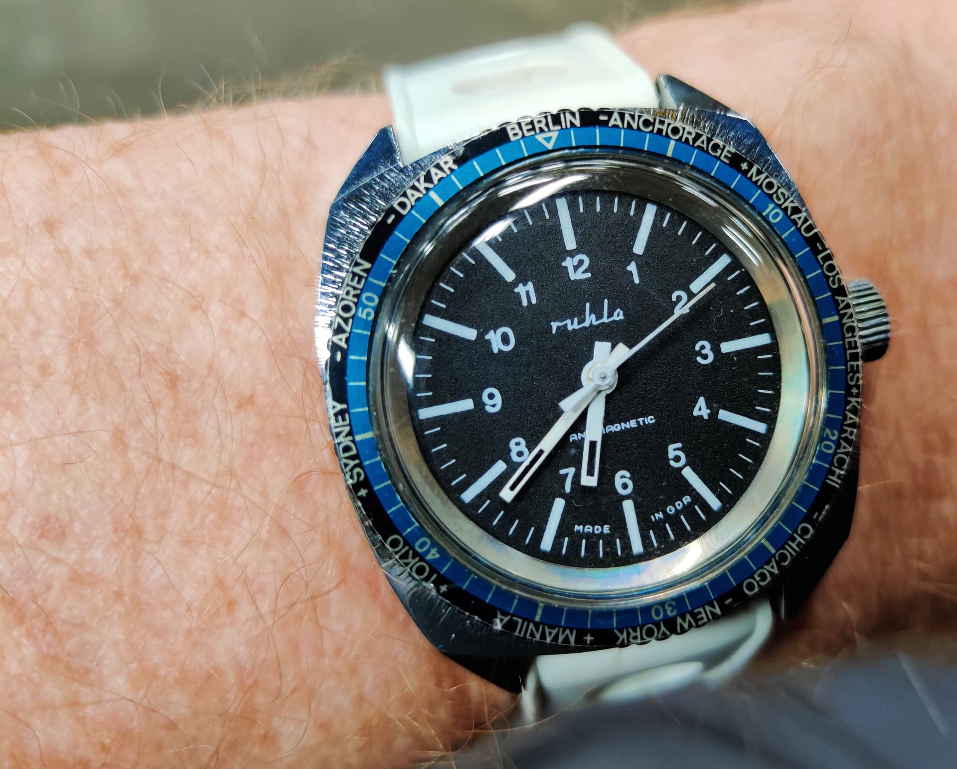Vandaag weer een Ruhla. Deze keer de worldtimer. De meeste DDR burgers hadden er niets aan want ze mochten toch niet de wereld over, maar een mooi design is het wel vind ik.