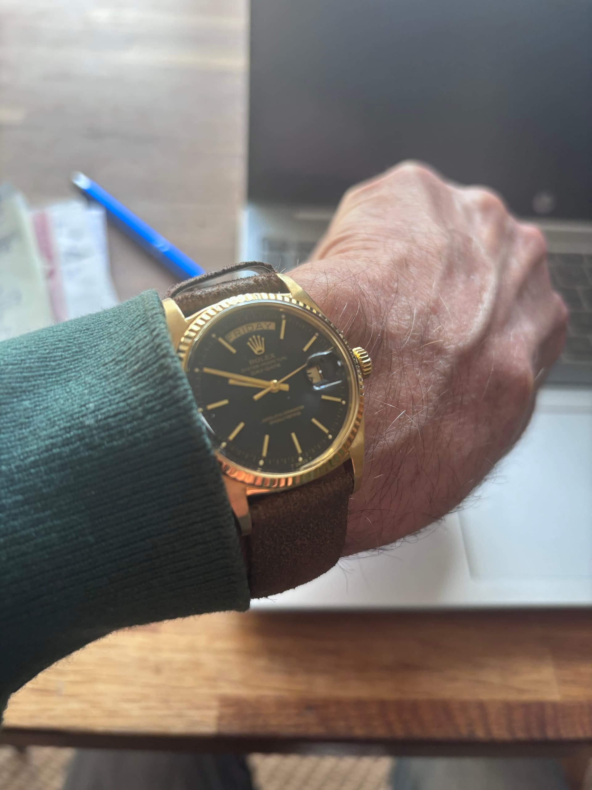 Wat een avontuur. Het eerste contact over dit horloge dateert van 2023, te duur, geen geld. Uiteindelijk dus maar het grootste deel van mijn collectie verkocht. Ik kon de eigenaar duidelijk maken dat dit gewoon mijn horloge is; de eerste Daydate in 1956 op de markt (mijn geboortejaar), deze serie 225XXXX te dateren 1970, en dit jaar dus ook mijn zeventigste verjaardag. Deze vrijdagochtend om de pols…