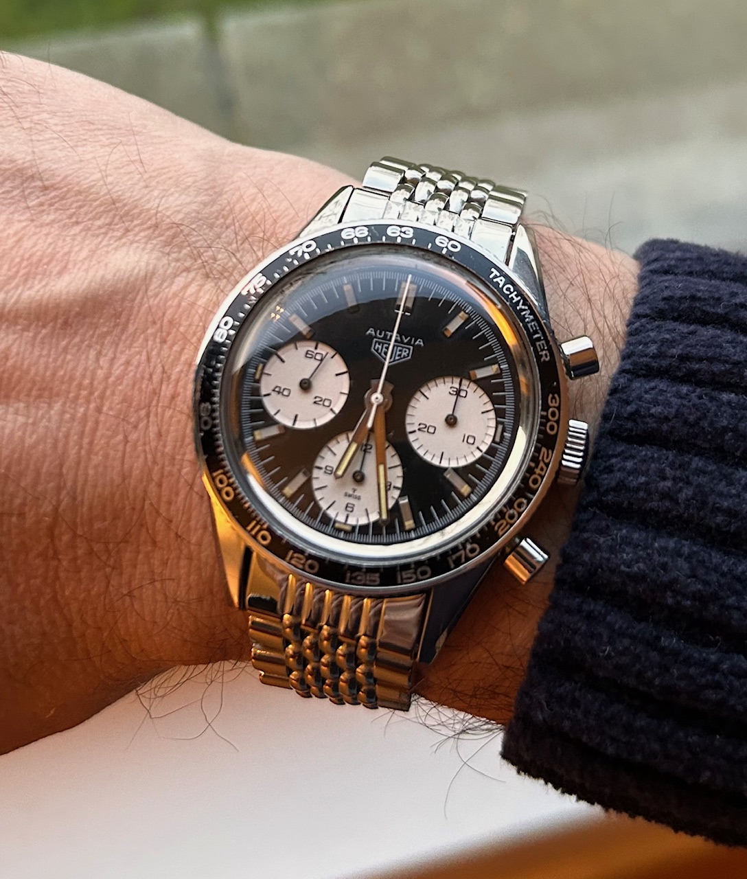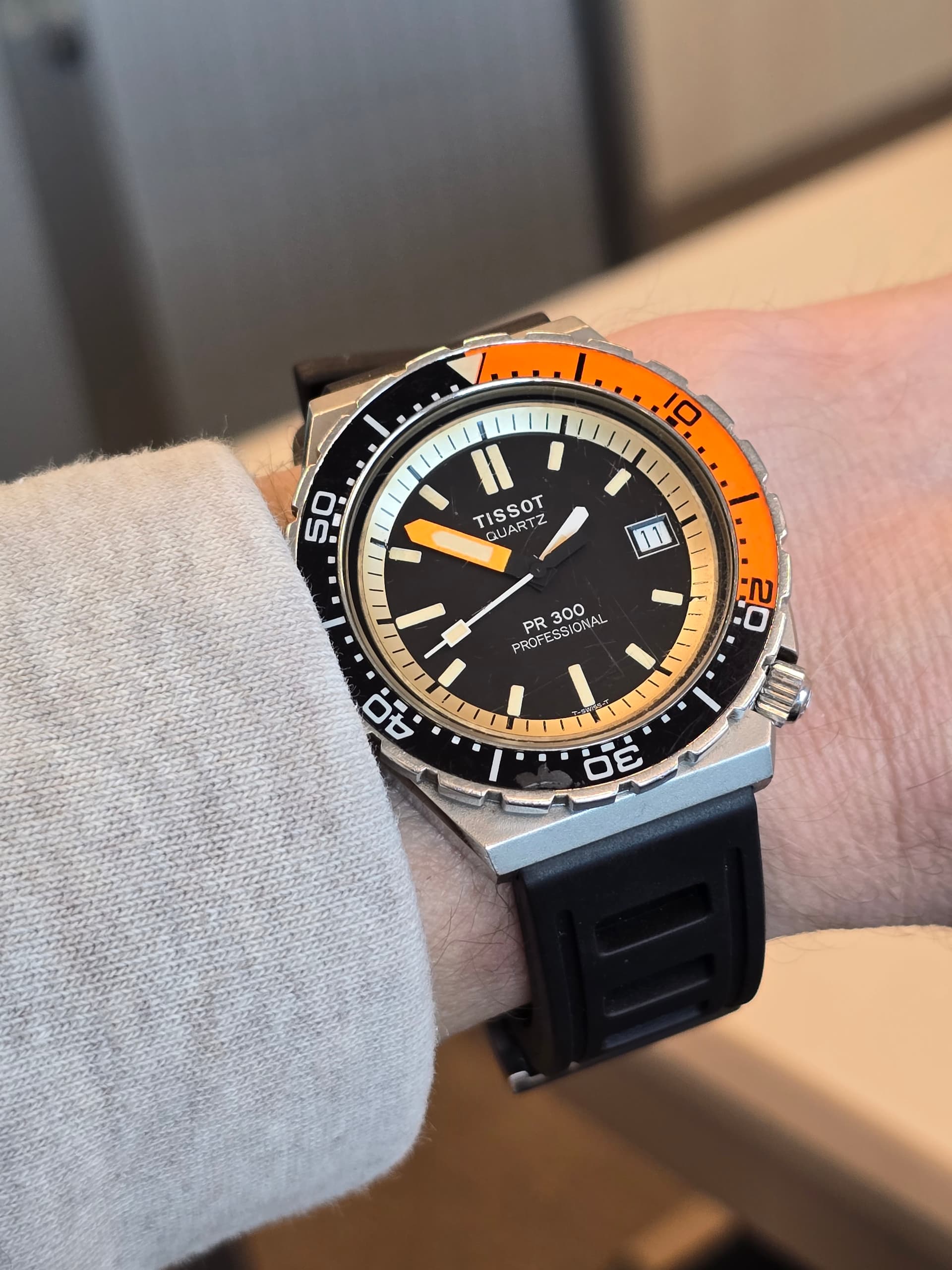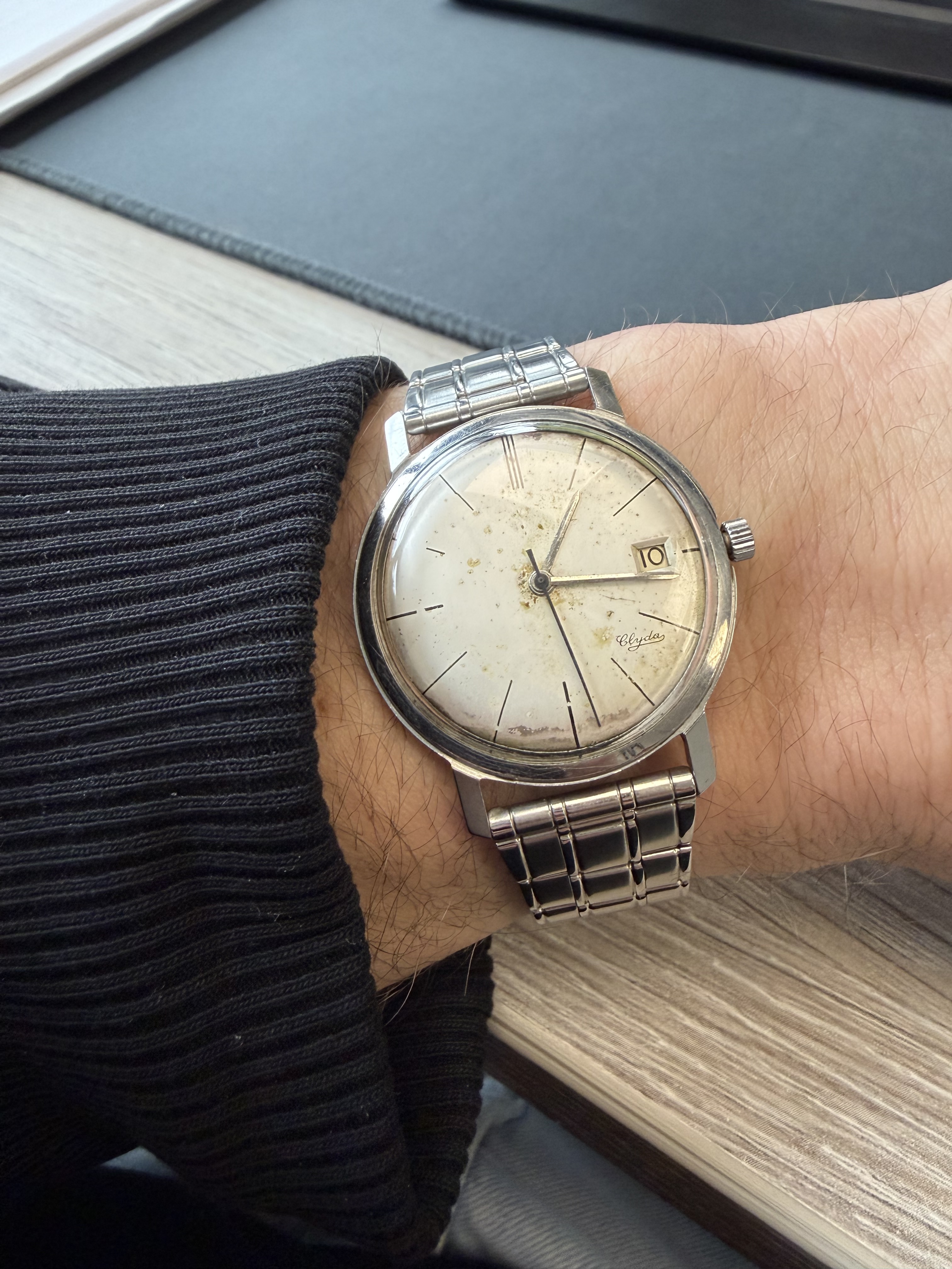 Pie pan dial, perfect vanille verkleurd tritium, vrolijke wijzers, A.Schild automaatuurwerkje, ongepolijste kast met heerlijke hoeken nog, bezel die langzaam grijs wordt, helemaal lekker.