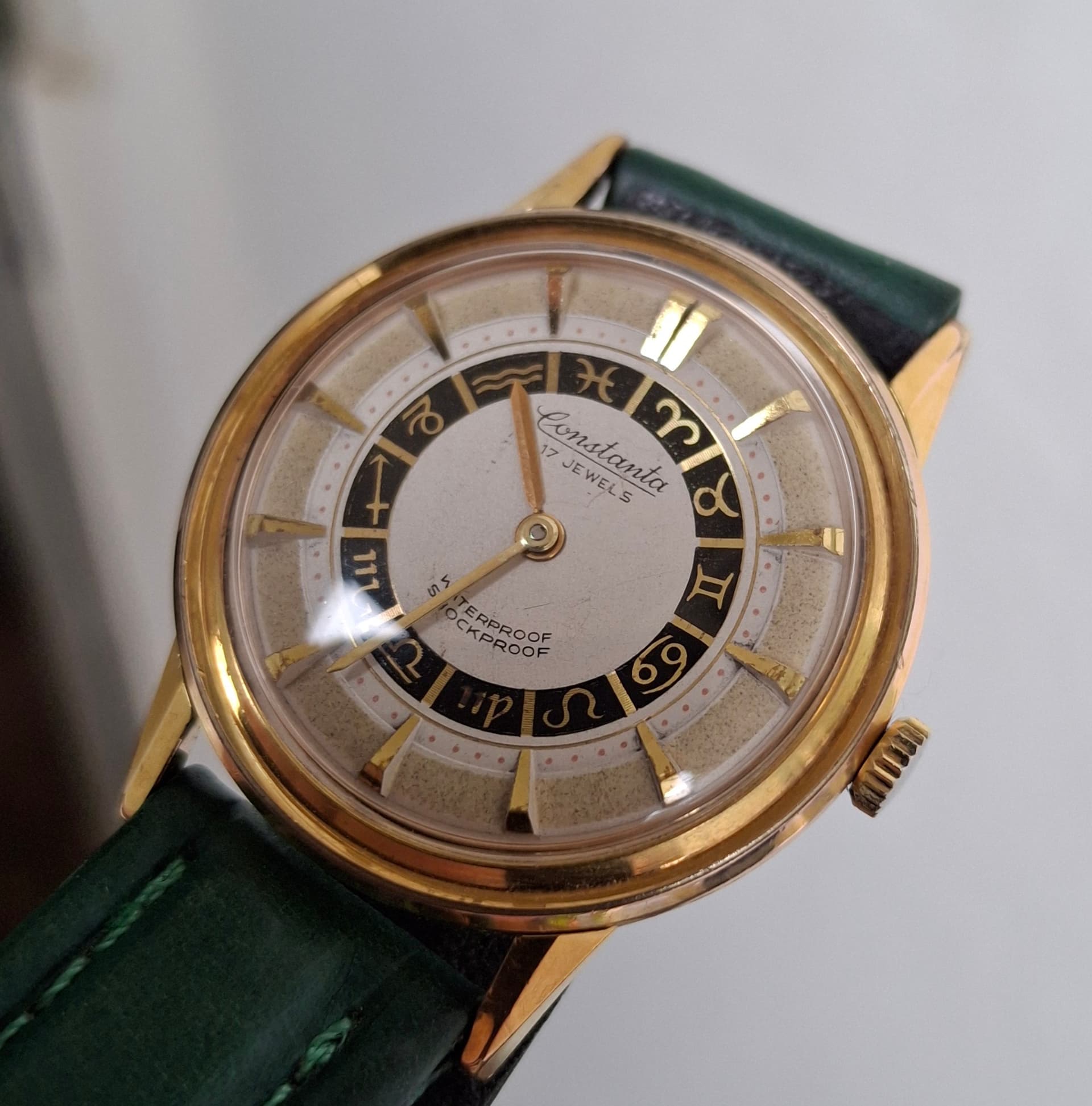 Bij daglicht zie je hoe mooi de wijzerplaat van de CONSTANTA bewaard is gebleven. De dierenriem/zodiac heel apart.