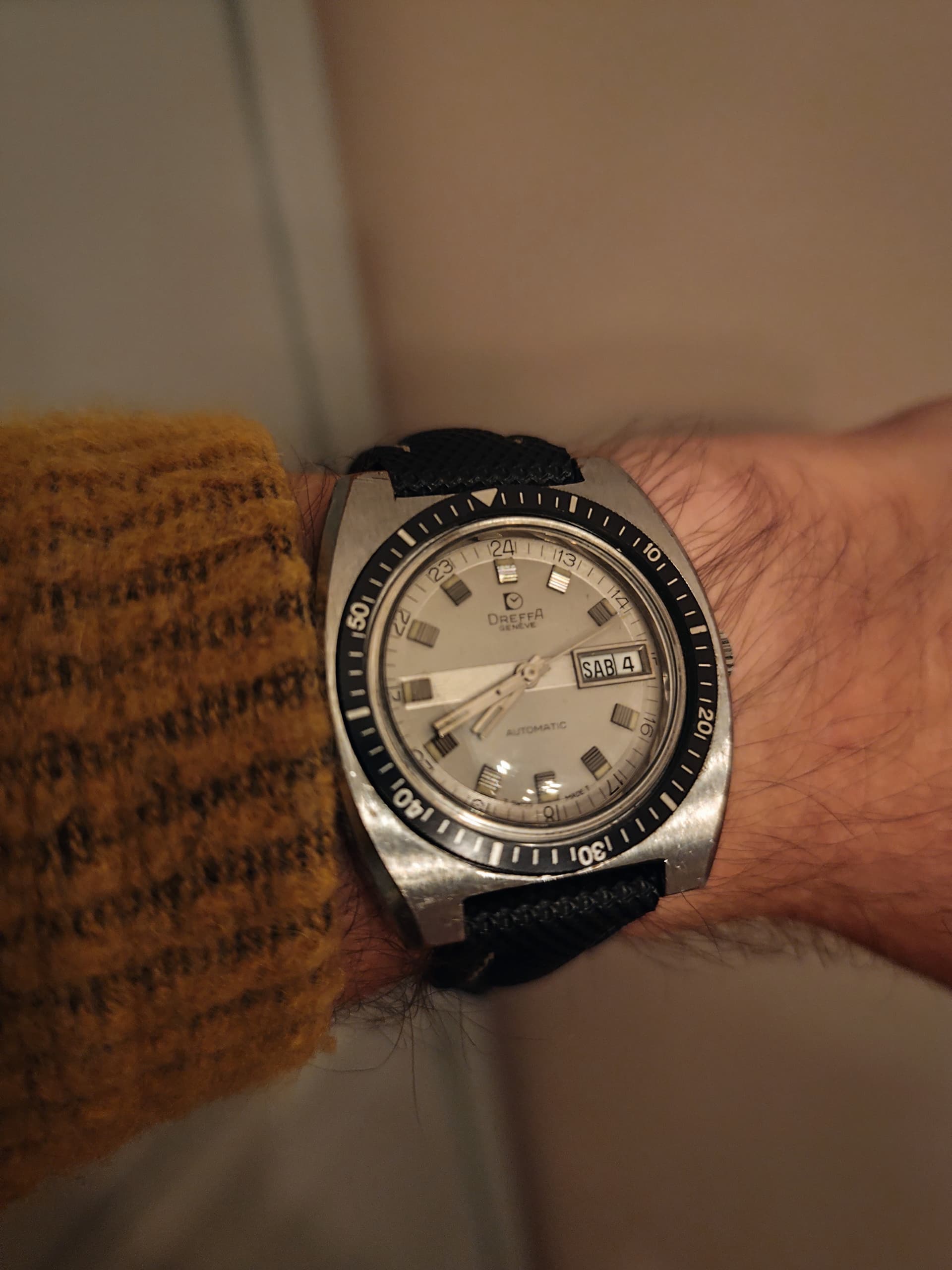 Deze DreffA kreeg weinig draagtijd, waarschijnlijk door het Flieger/Fieldwatch bandje dat ik er de vorige keer op had gedaan. Nu gewisseld naar een oude Sailcloth (met Breitling-achtig logo?).