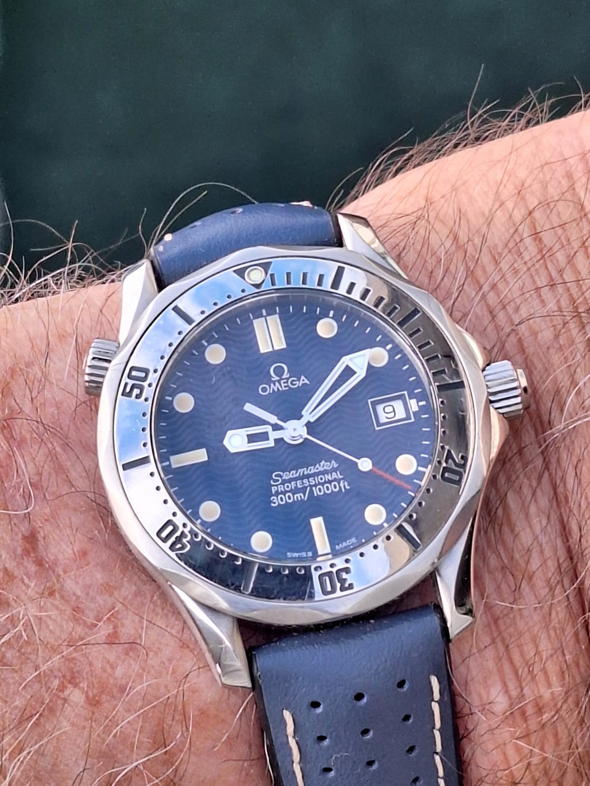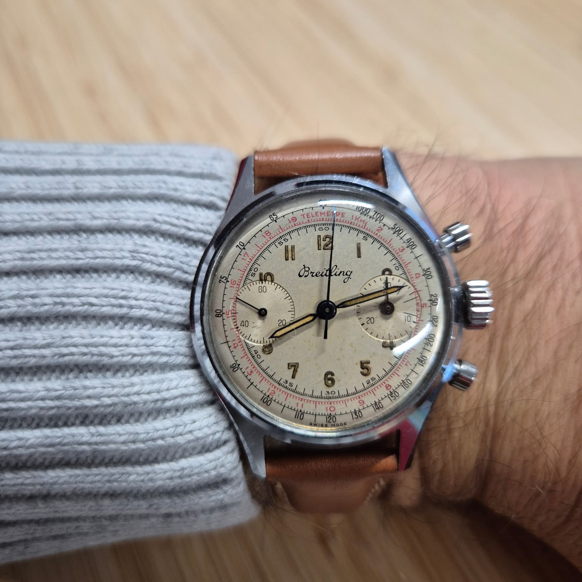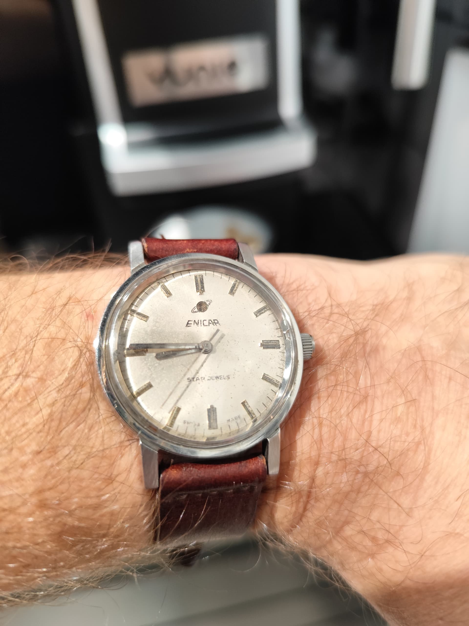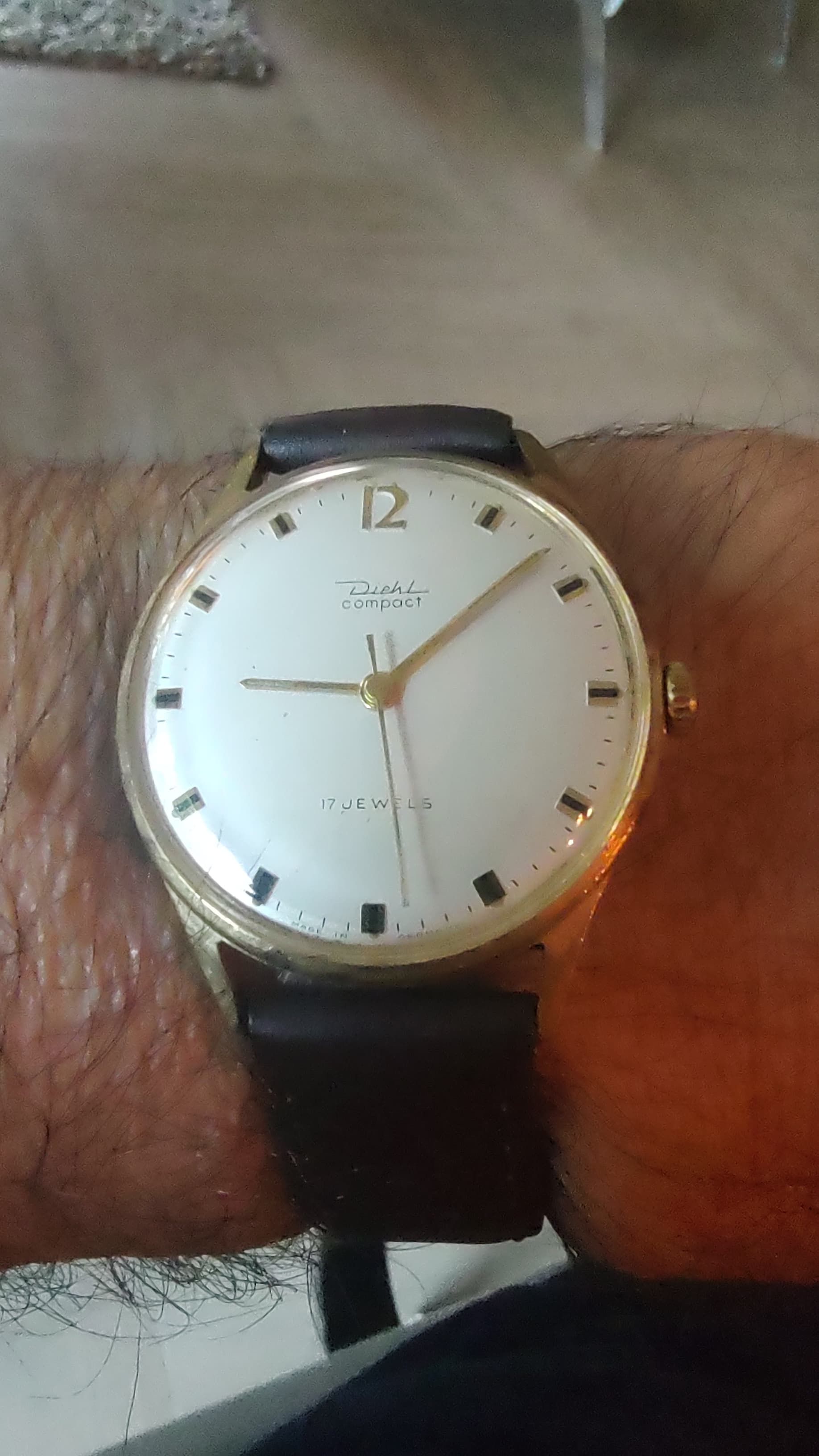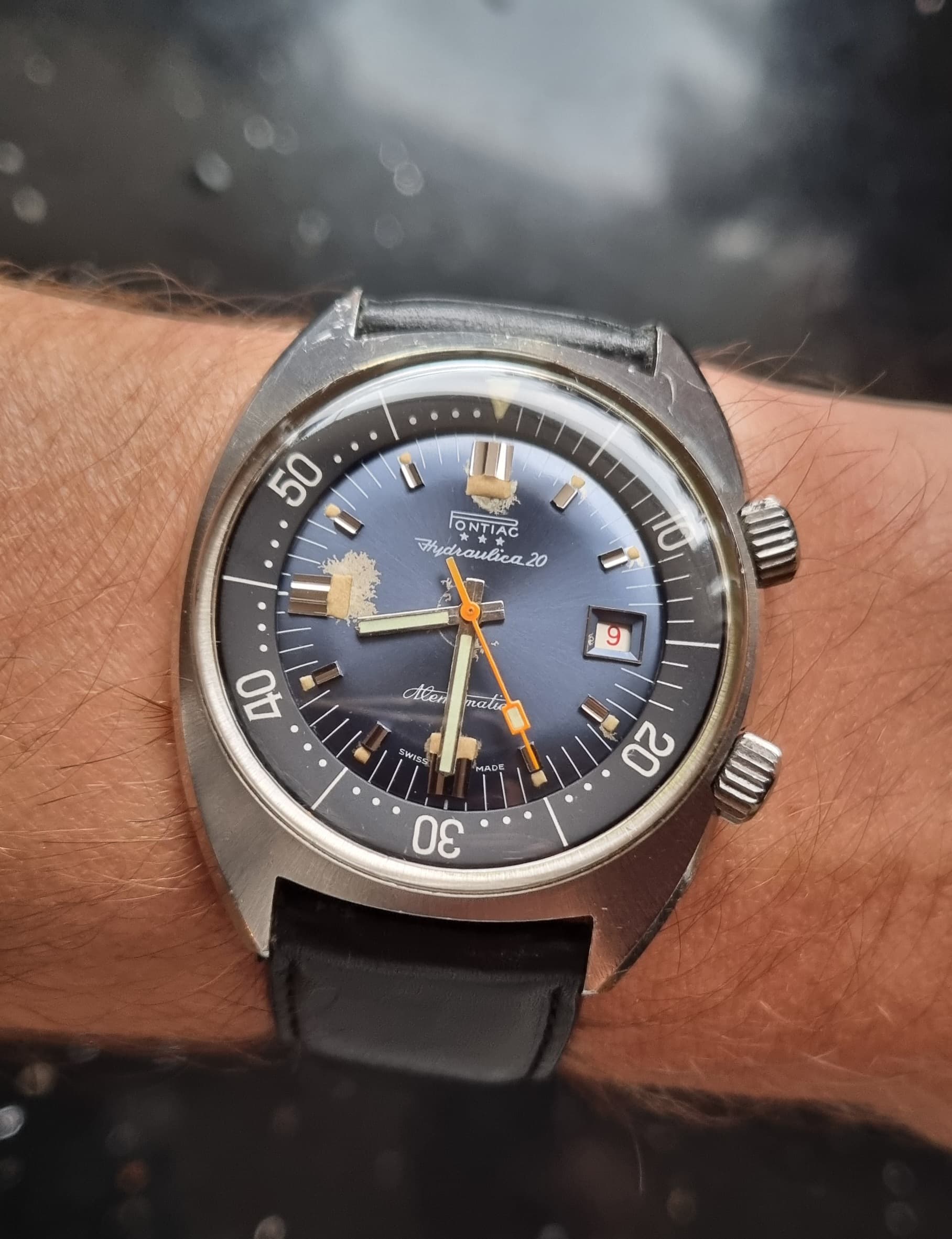 Er moet nog wel een en ander aan dit horloge gebeuren, er moet nog een nieuw glaasje op, een nieuwe kroon met stift en nog een nieuwe pakking. En wellicht vervang ik de wijzers nog, of doe er nieuwe lumen in. Maar tot de onderdelen er zijn, doe ik er even niets aan.