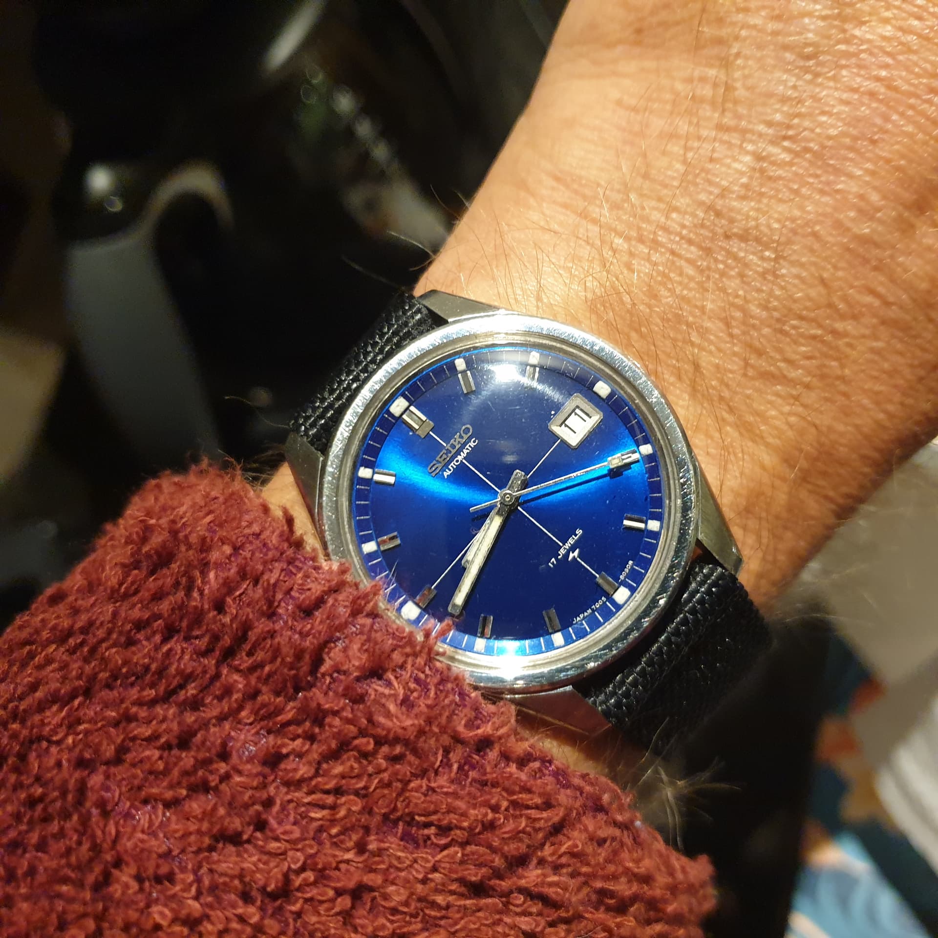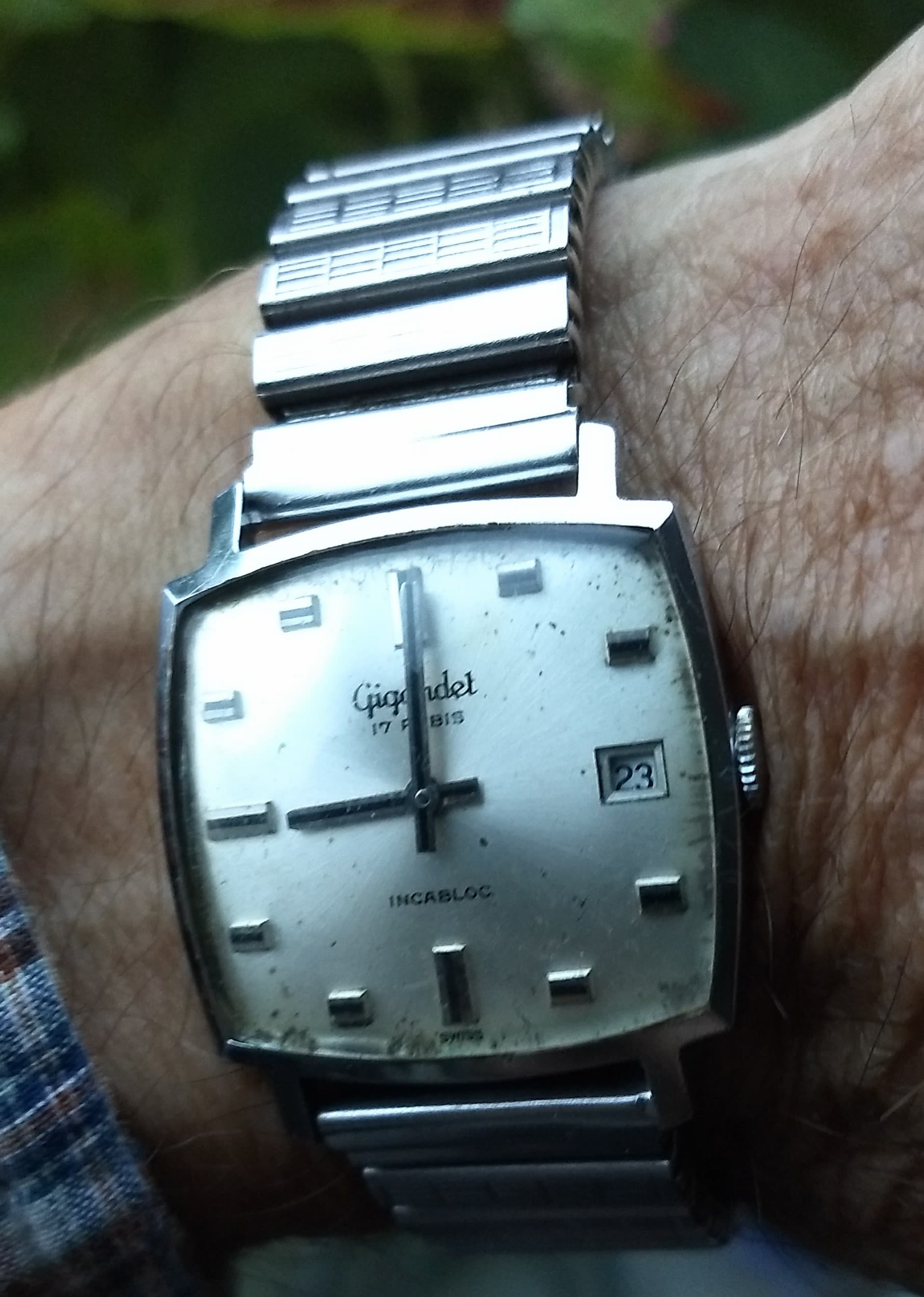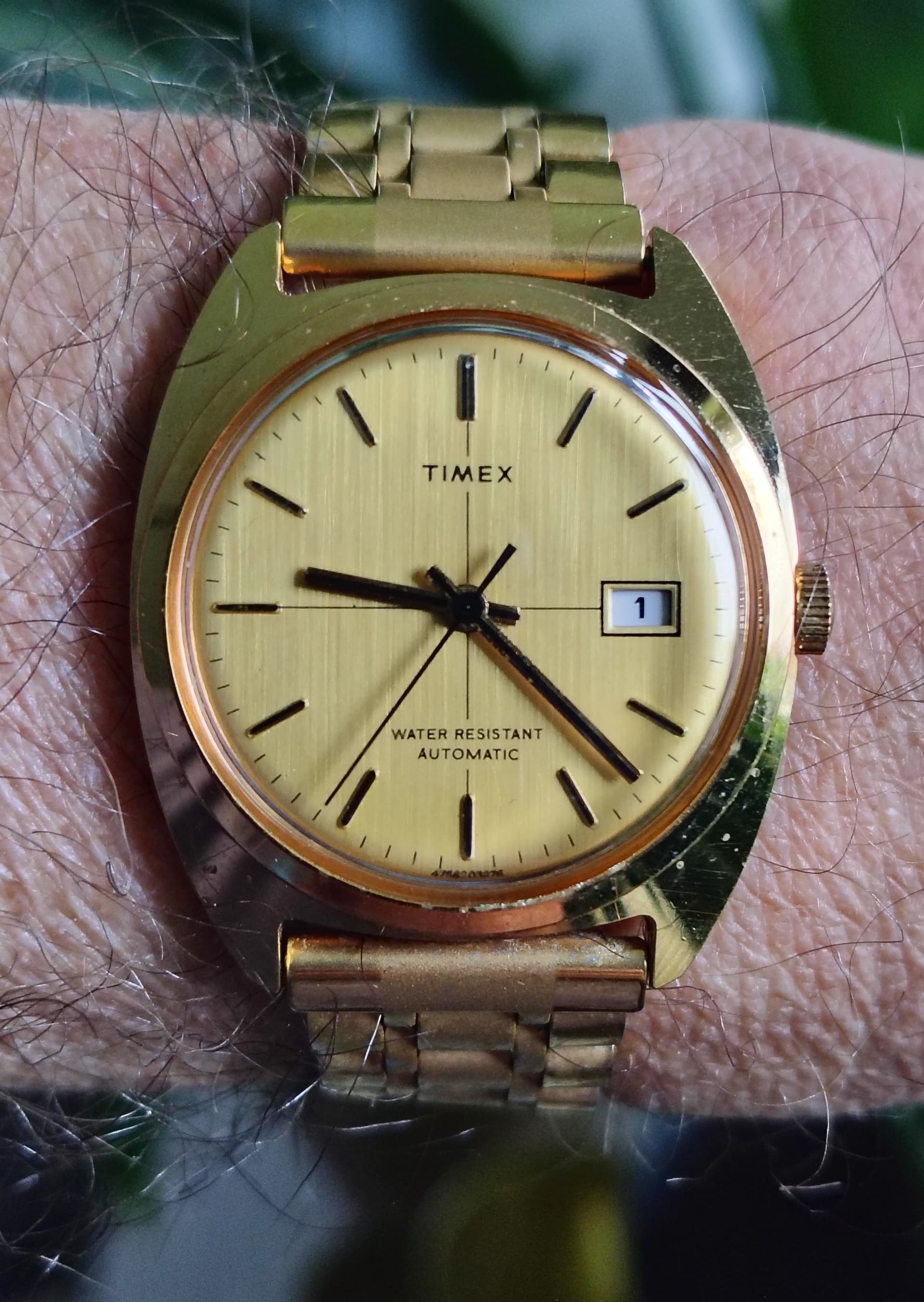 Goedemorgen HF, ook voor het eerst om deze Timex, net terug van @Serge2, goudkleurig en een soort fixoflex bandje, mooier kan het niet