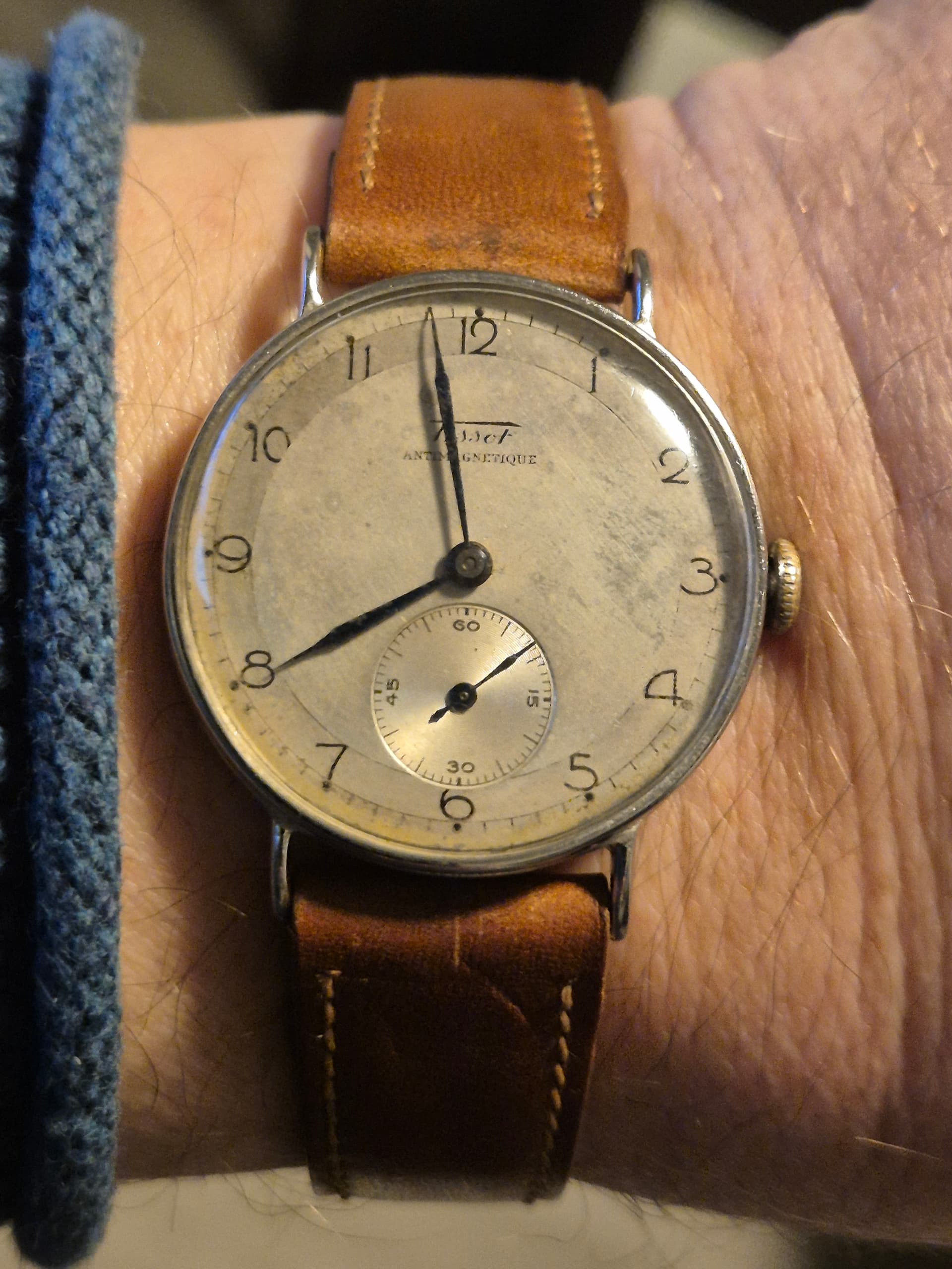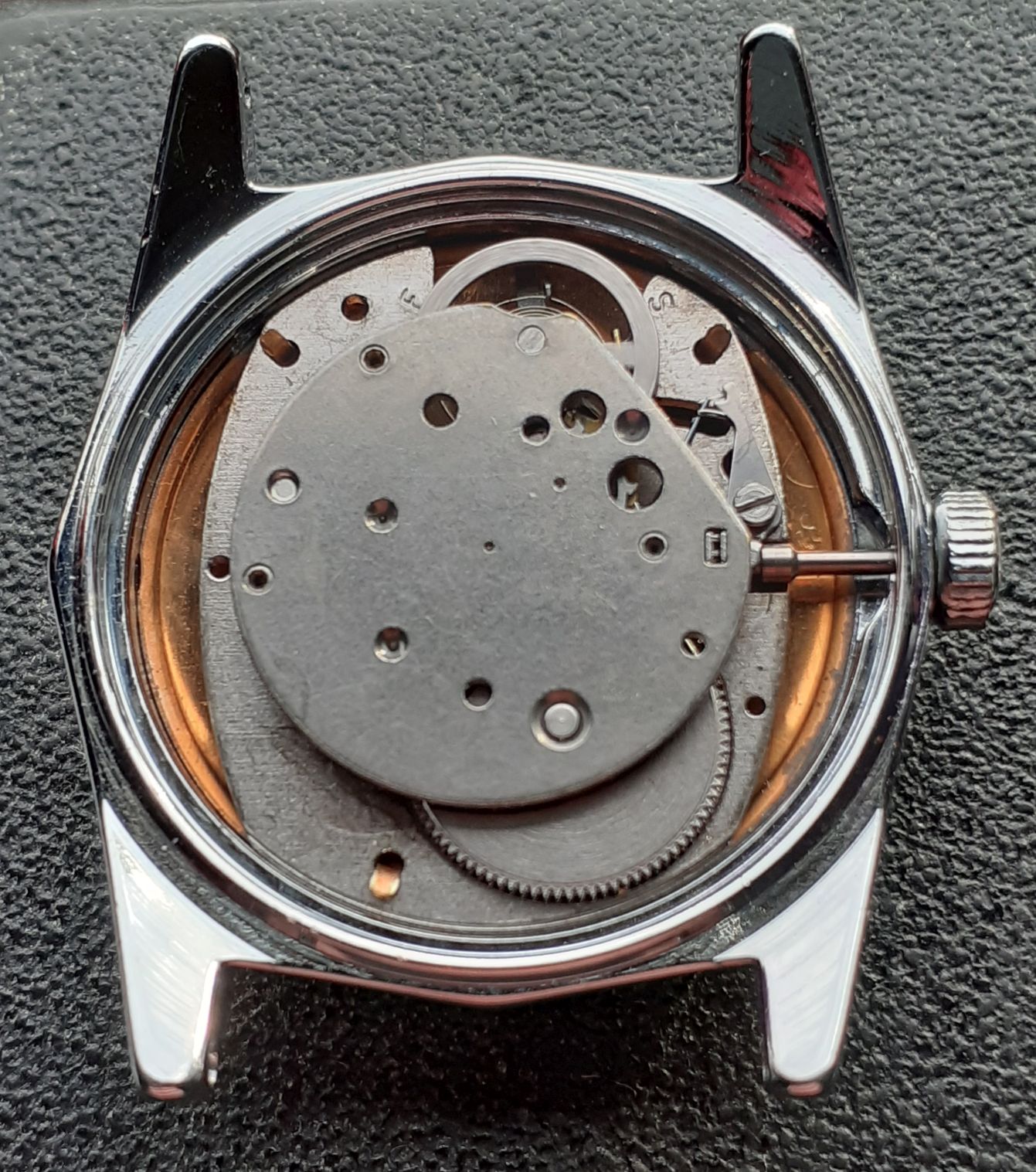 Deze zat in hetzelfde lot als de Longines van gisteren. Ik heb hem volledig opgeknapt: de kast ultrasoon gereinigd, een nieuw glas geplaatst en het tot originele hoogte verlaagd.