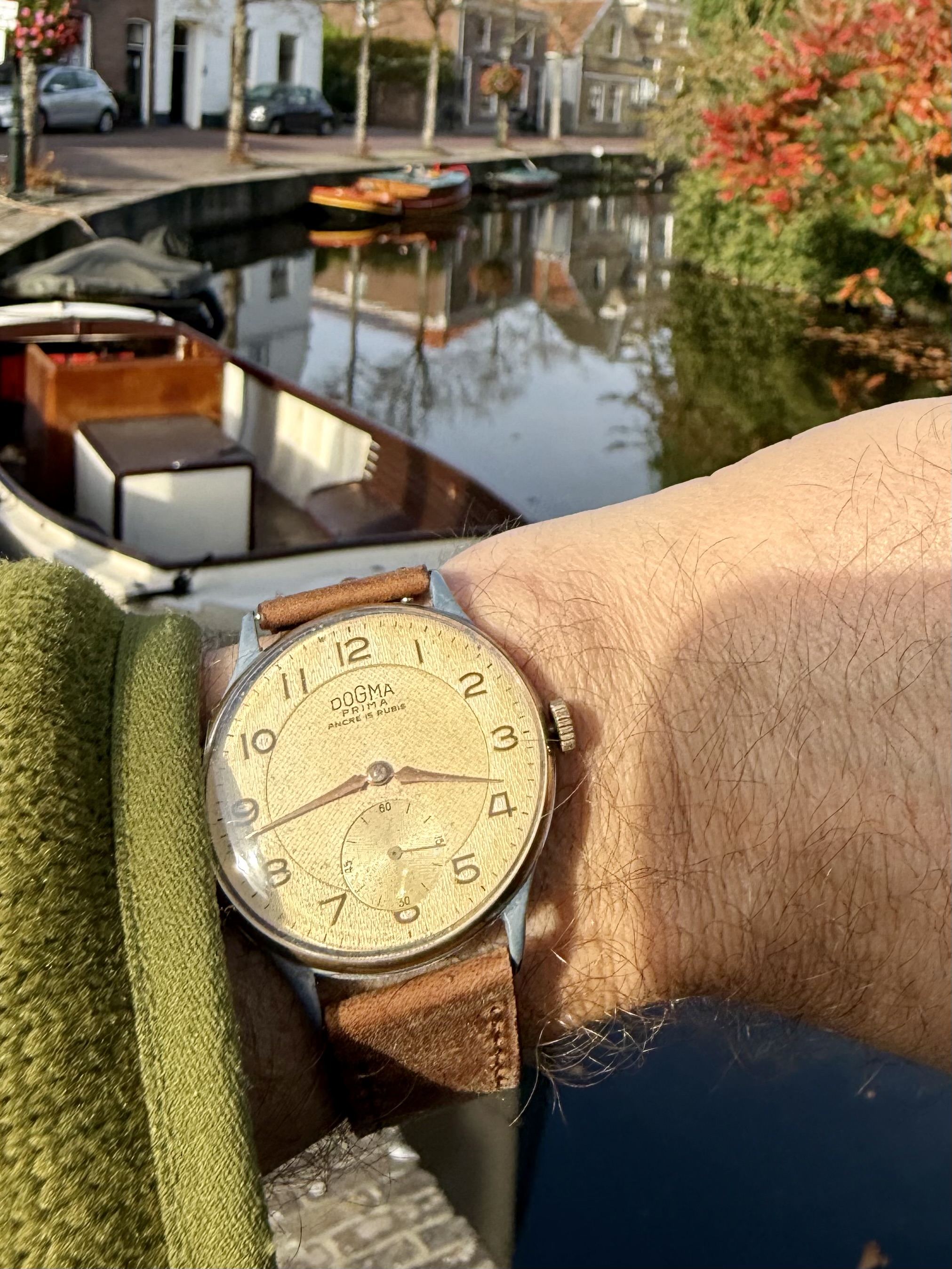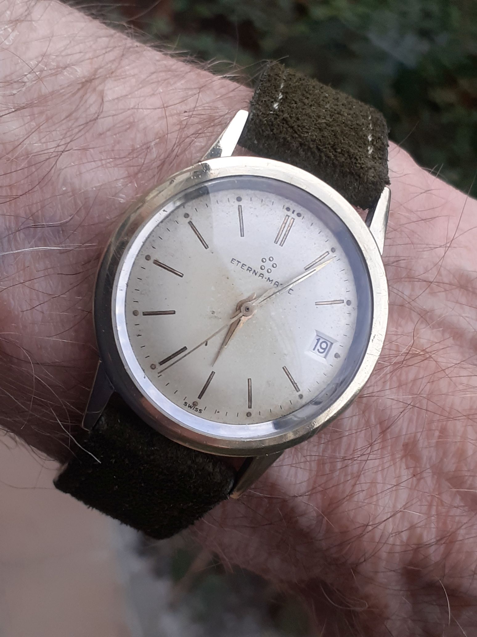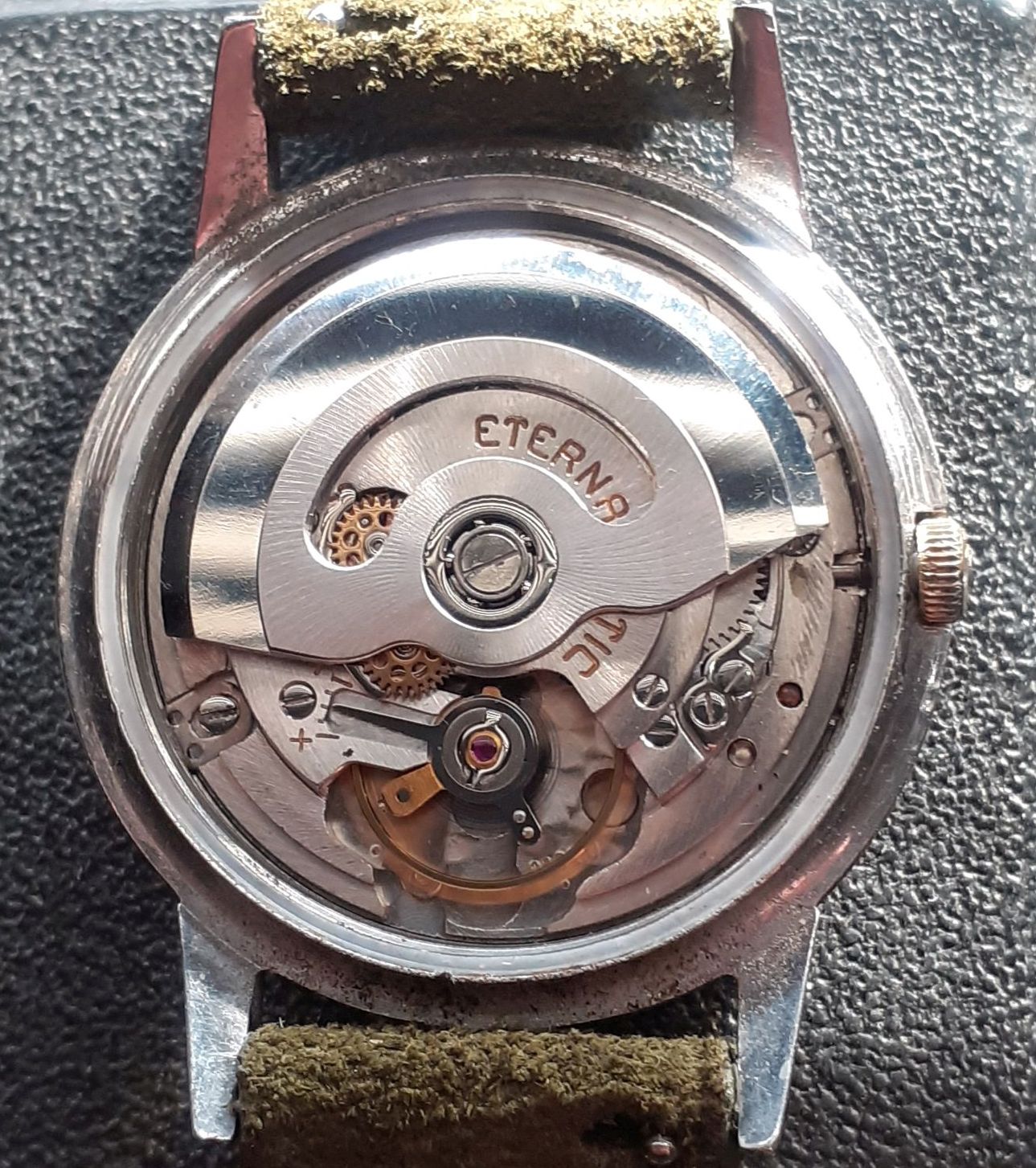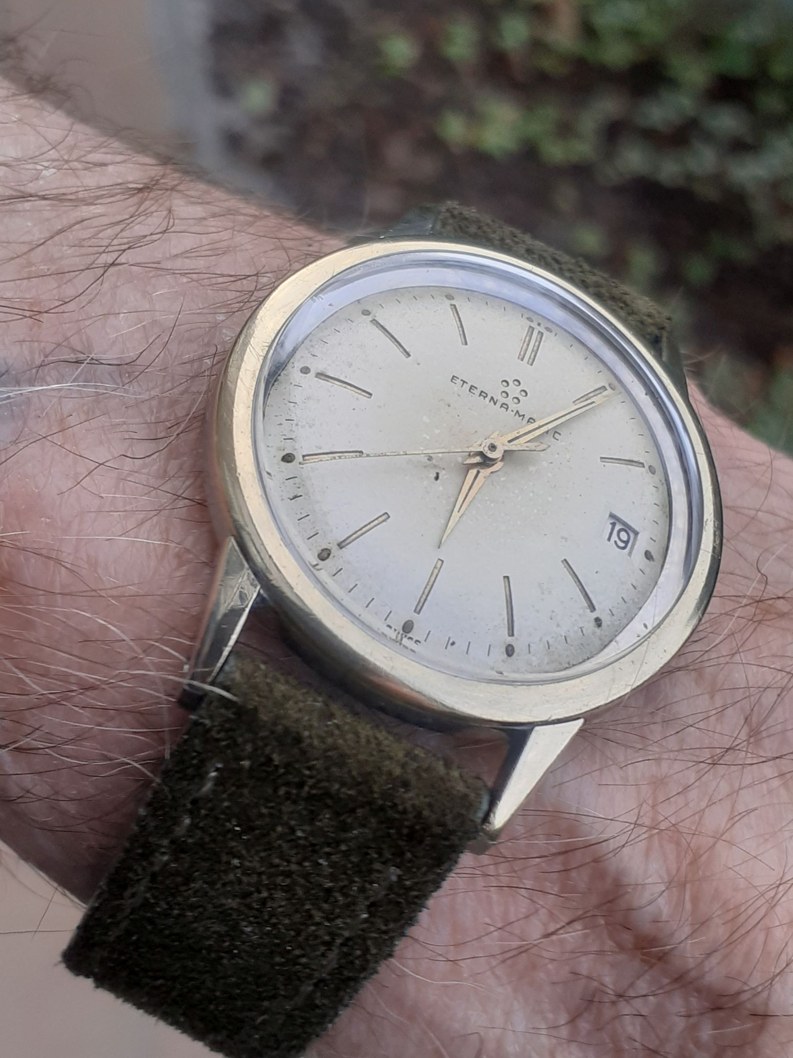 Vandaag de Eterna-Matic uit het lot aangepakt. De kast is ultrasoon gereinigd — niet gepolijst om de vergulde laag te behouden — en ik heb er een nieuw glas ingezet dat ik 1,8 mm heb verlaagd tot de juiste hoogte. Het uurwerk bleek een mooi Eterna cal. 1428U te zijn, nog in uitstekende staat en tikt weer netjes. Voorzien van een olijfgroen suède bandje, wat de vintage uitstraling goed doet. Weer een fijn klein projectje afgerond.