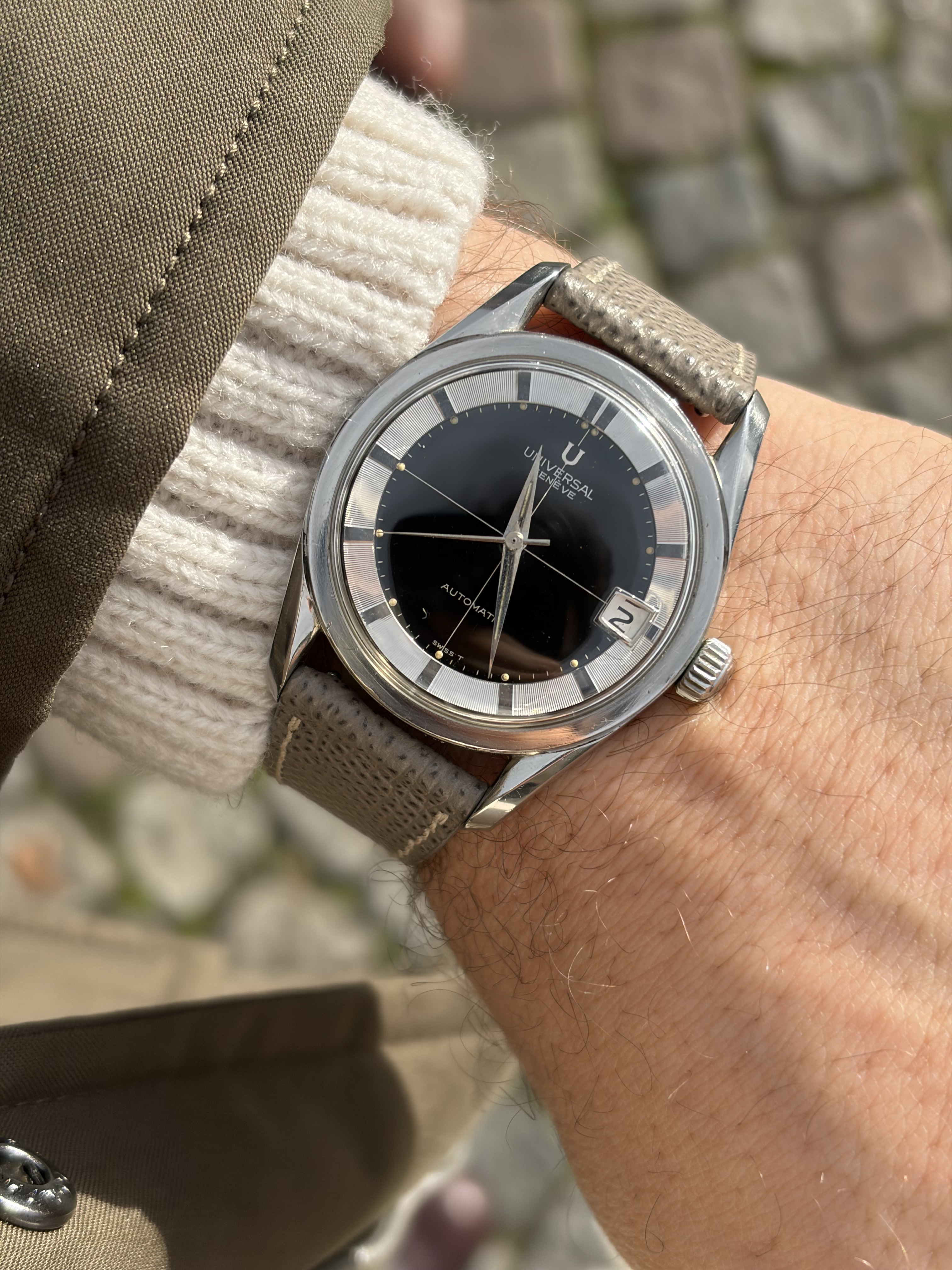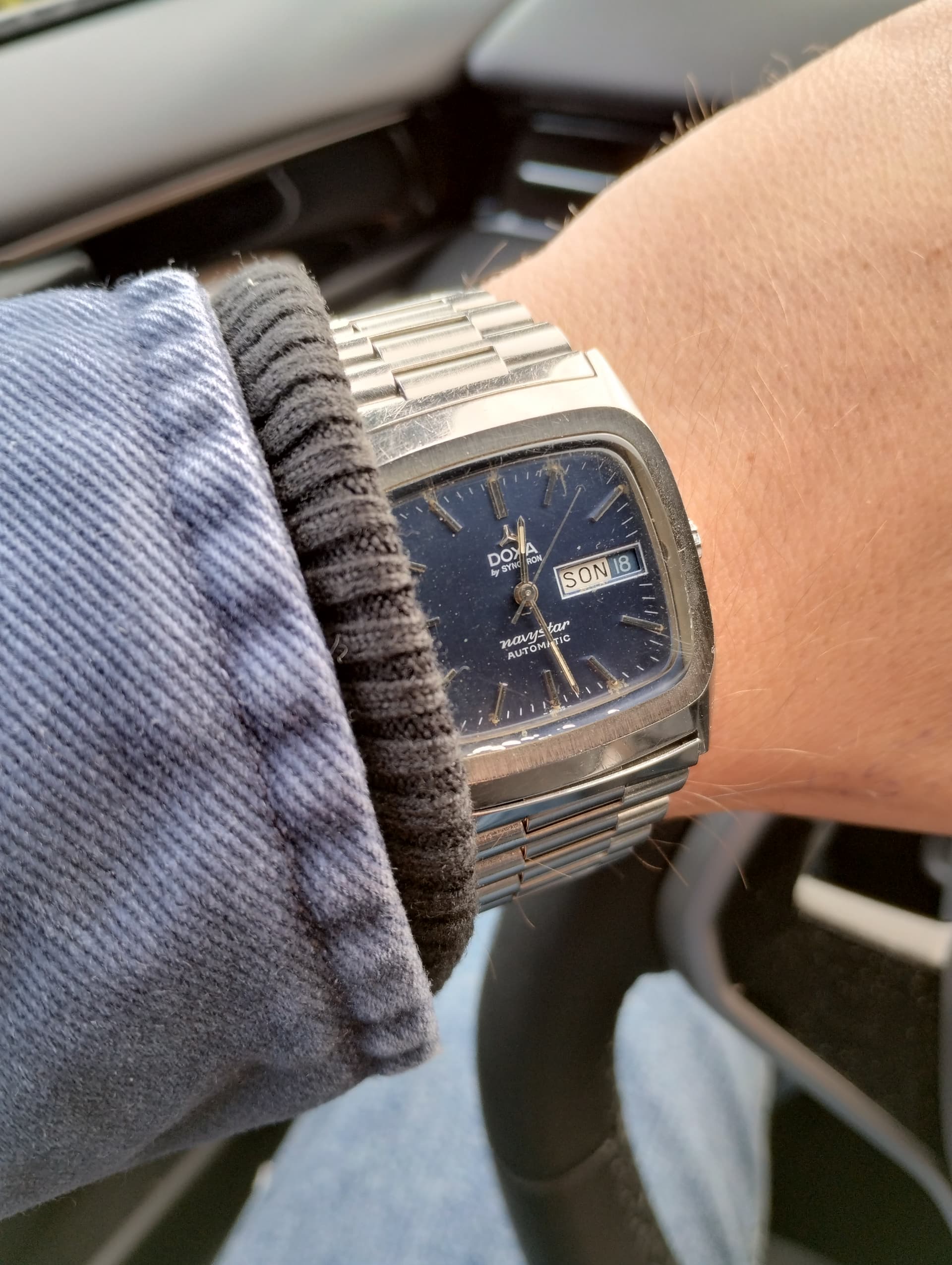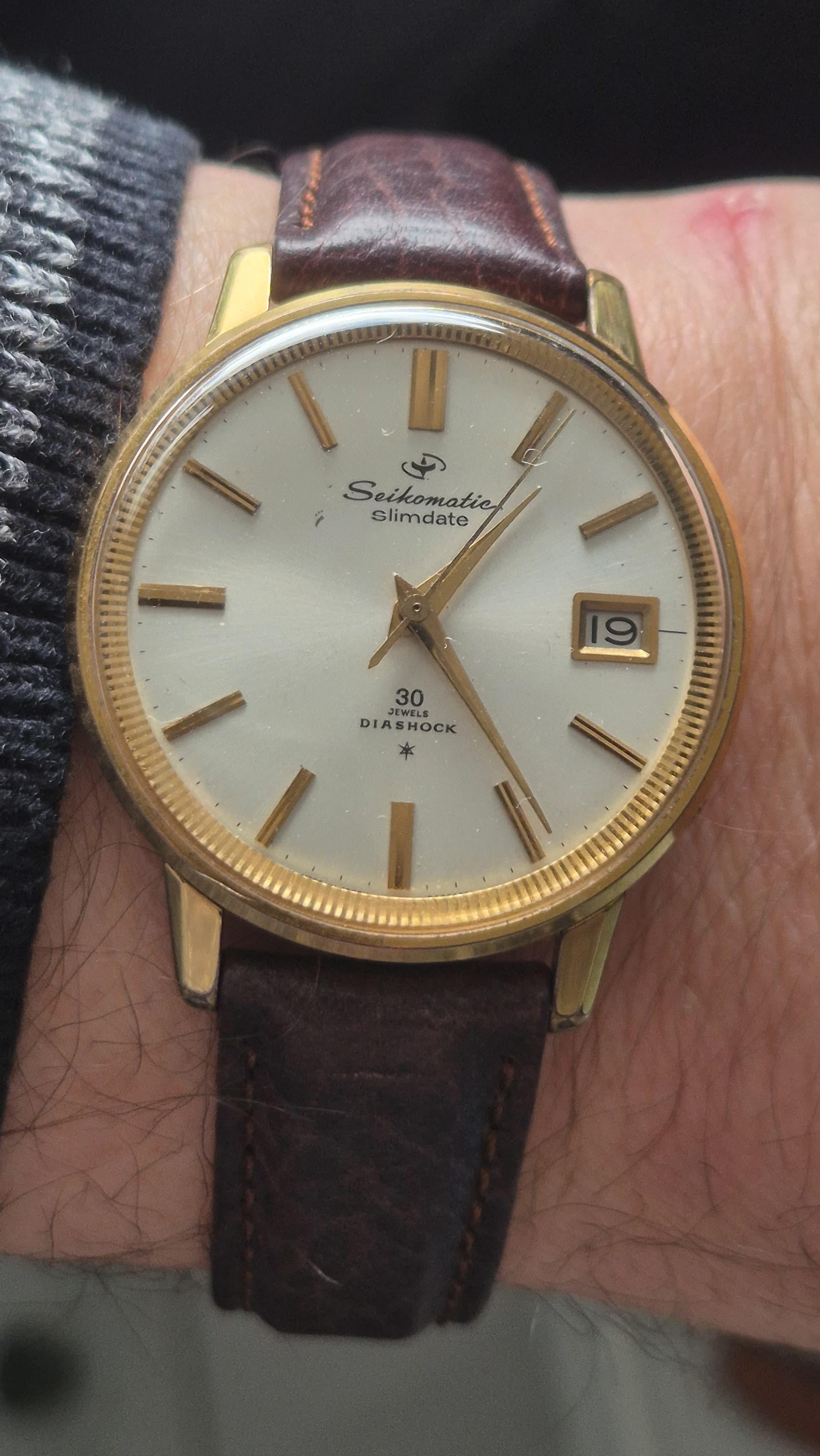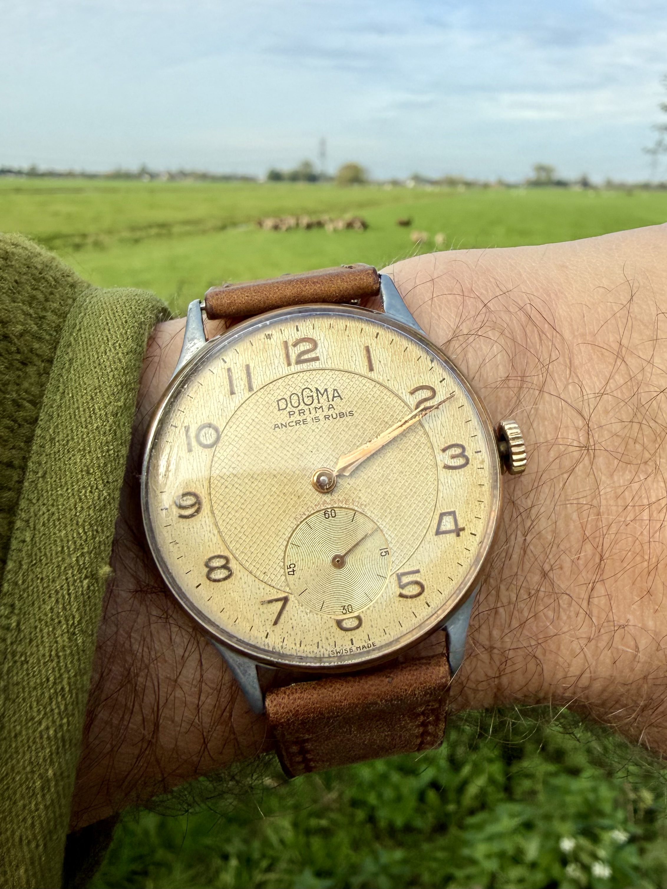 Vandaag de Eterna-Matic uit het lot aangepakt. De kast is ultrasoon gereinigd — niet gepolijst om de vergulde laag te behouden — en ik heb er een nieuw glas ingezet dat ik 1,8 mm heb verlaagd tot de juiste hoogte. Het uurwerk bleek een mooi Eterna cal. 1428U te zijn, nog in uitstekende staat en tikt weer netjes. Voorzien van een olijfgroen suède bandje, wat de vintage uitstraling goed doet. Weer een fijn klein projectje afgerond.
