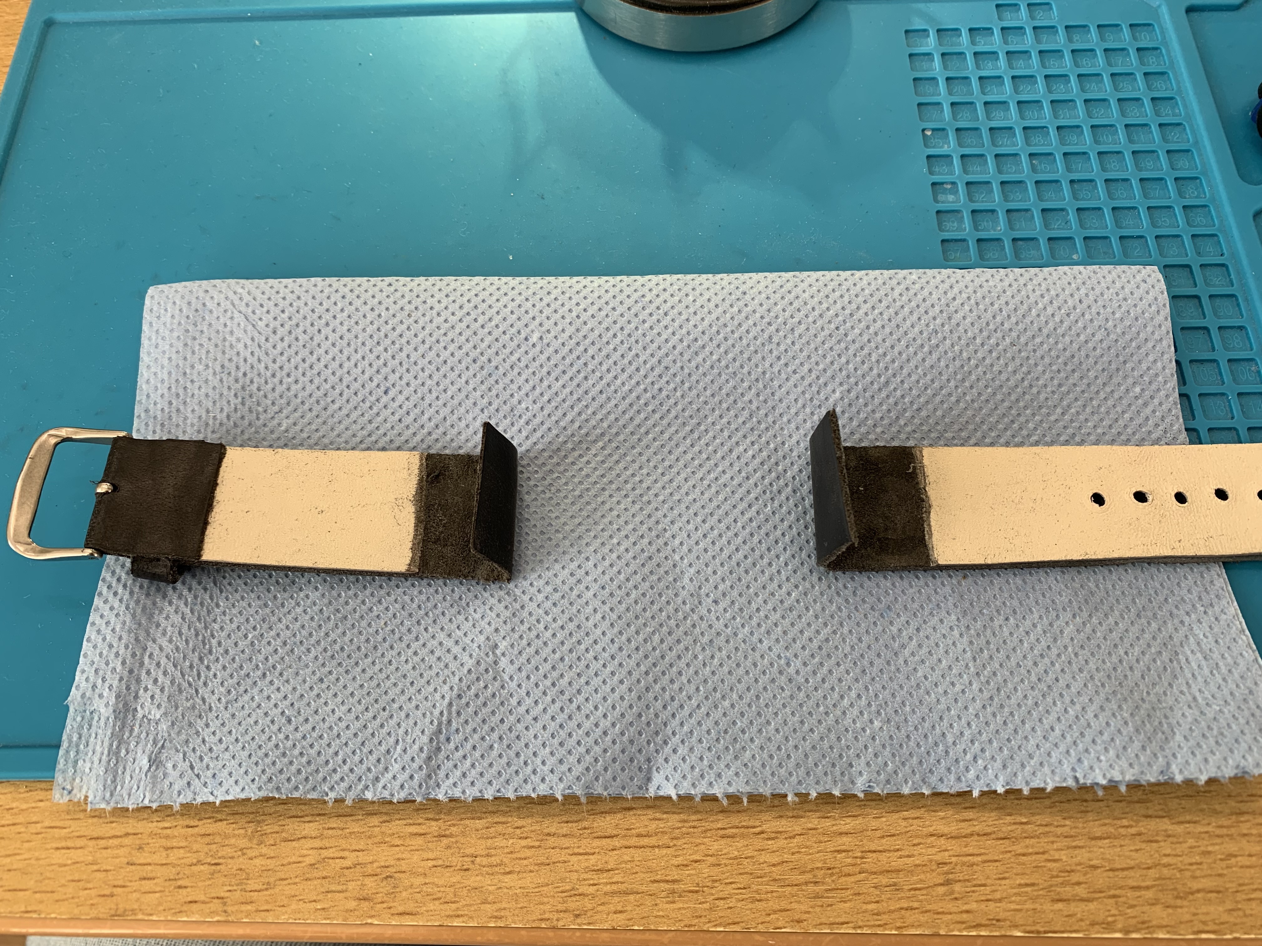 Einde van de middag de band eraan gelijmd met transparante lijm van bison. Eerst een laagje erop gesmeerd en lekker laten intrekken. Vers leer zuigt direct de lijm op. Nadat het mat werd en wat droog een tweede laagje aangebracht.