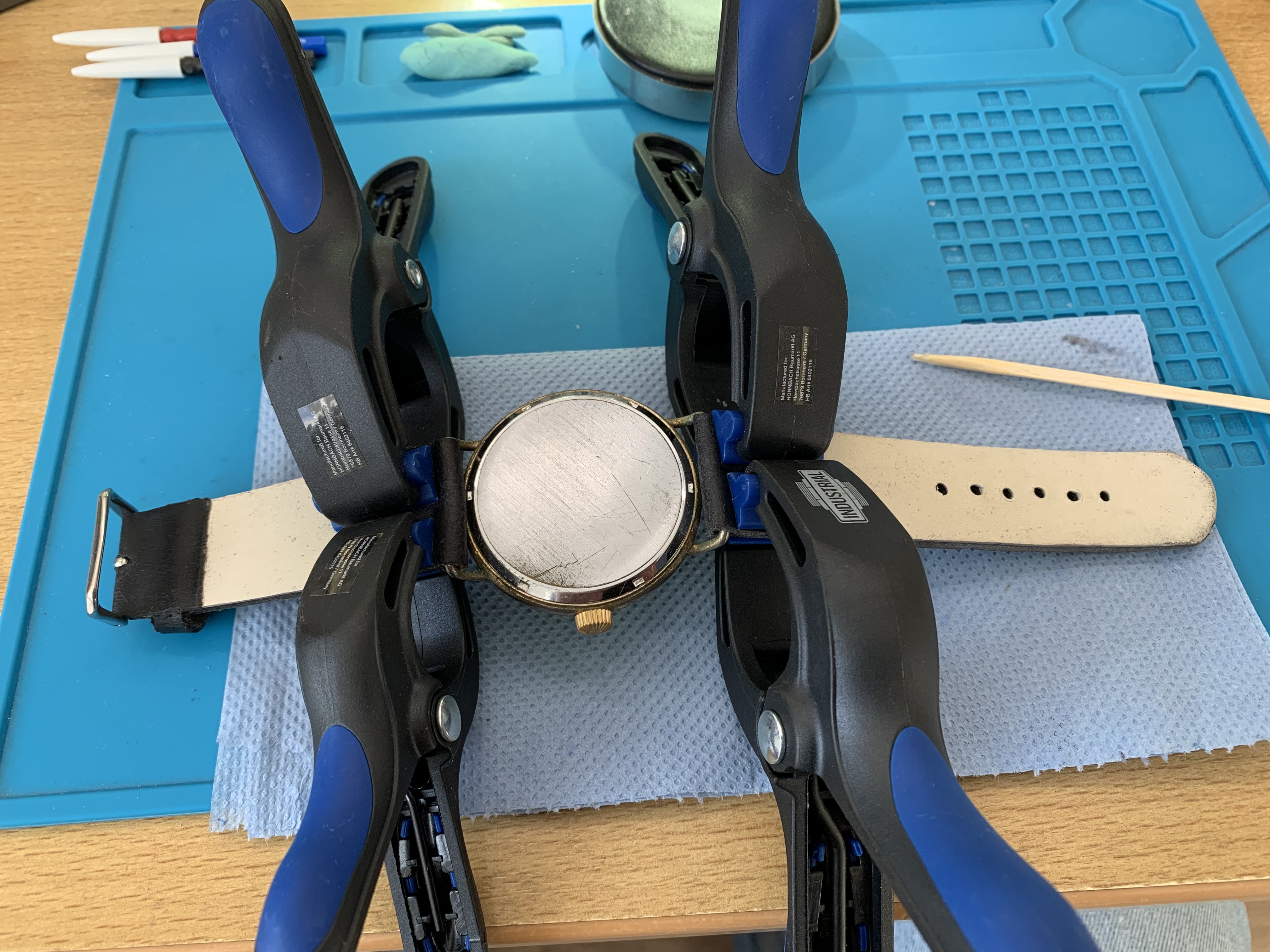 Vervolgens het horloge gemonteerd en met klemmen de contactvlakken met klemmen vastgezet.