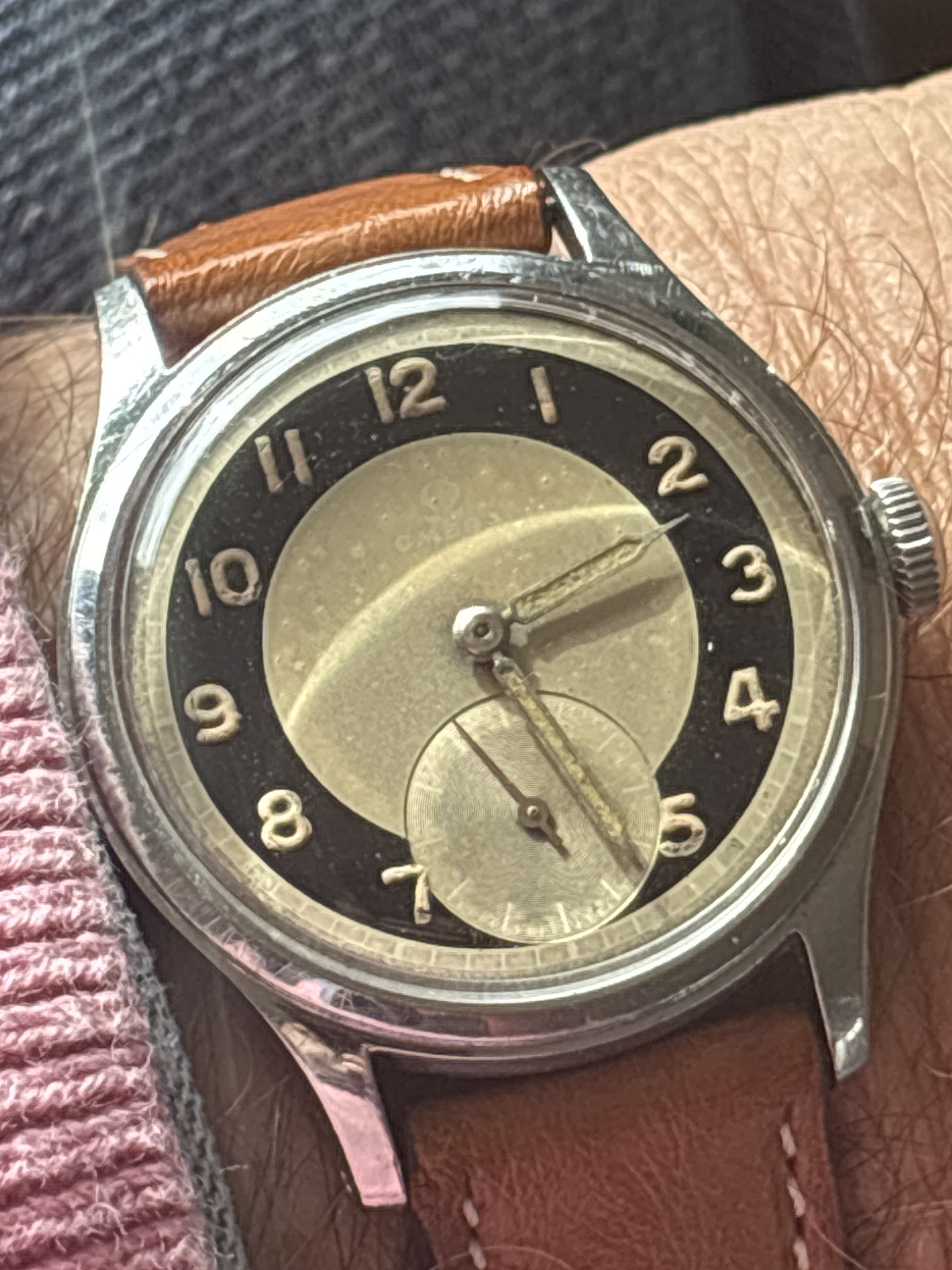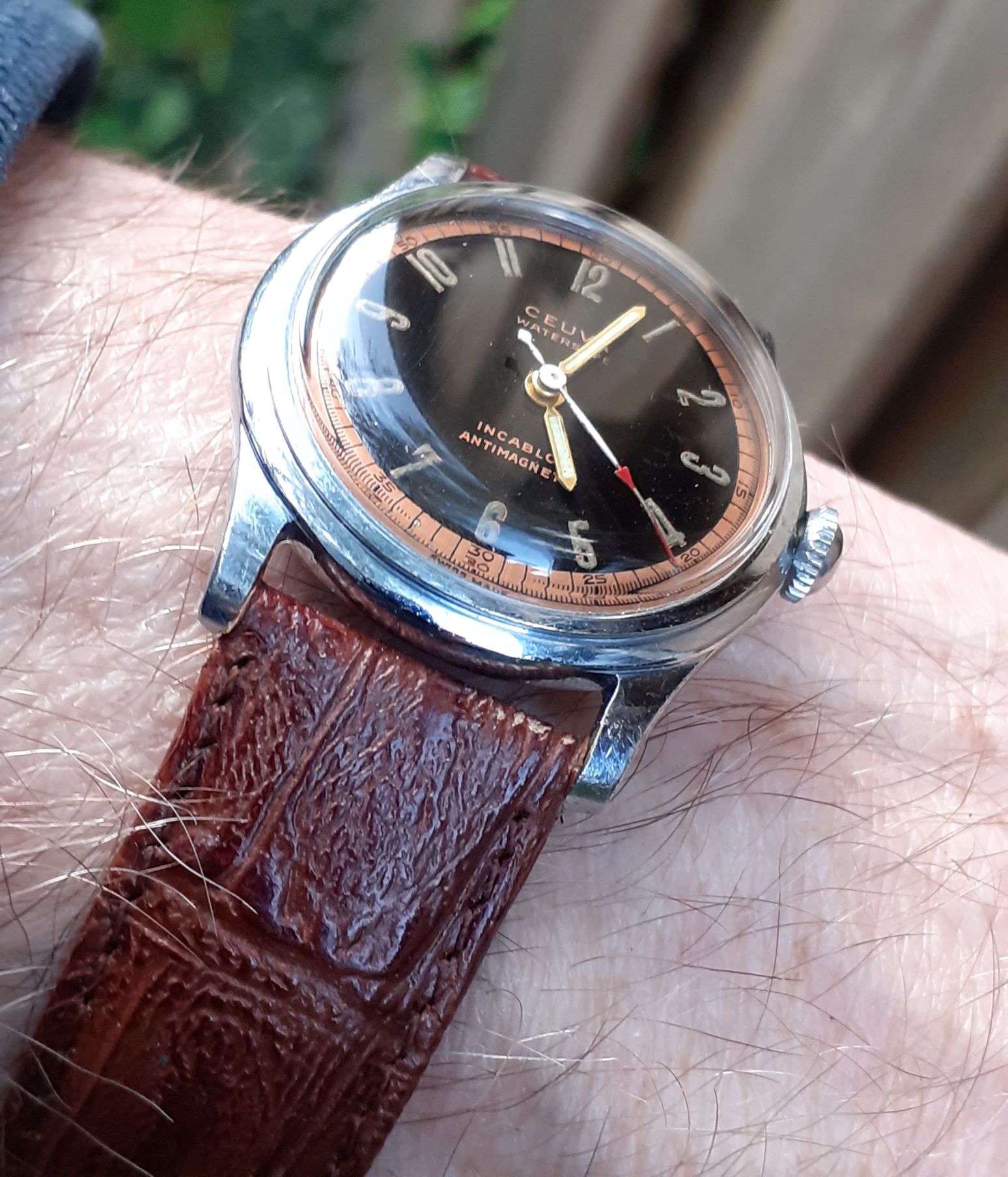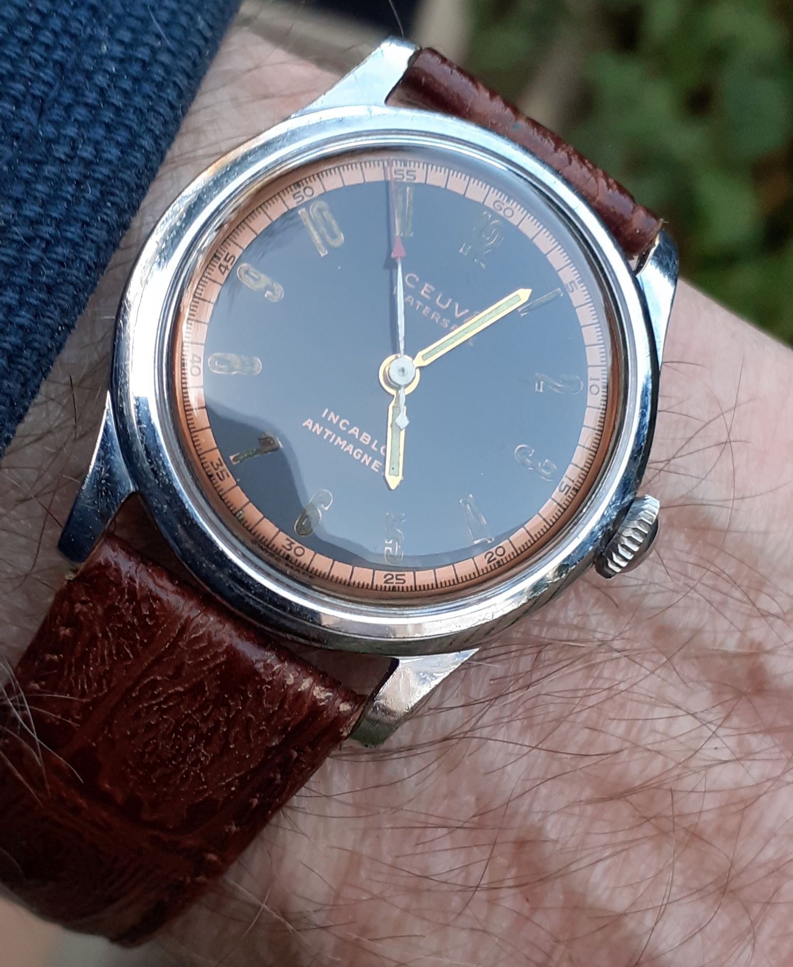 Vandaag draag ik deze Ceuvá uit de jaren ’50. In de kast tikt een FHF 28 H, en de robuuste Spillmann-kast doet zijn werk nog altijd uitstekend. De combinatie van de zwarte wijzerplaat met de koperkleurige rand en vergulde wijzers geeft het horloge een karaktervolle vintage uitstraling.
