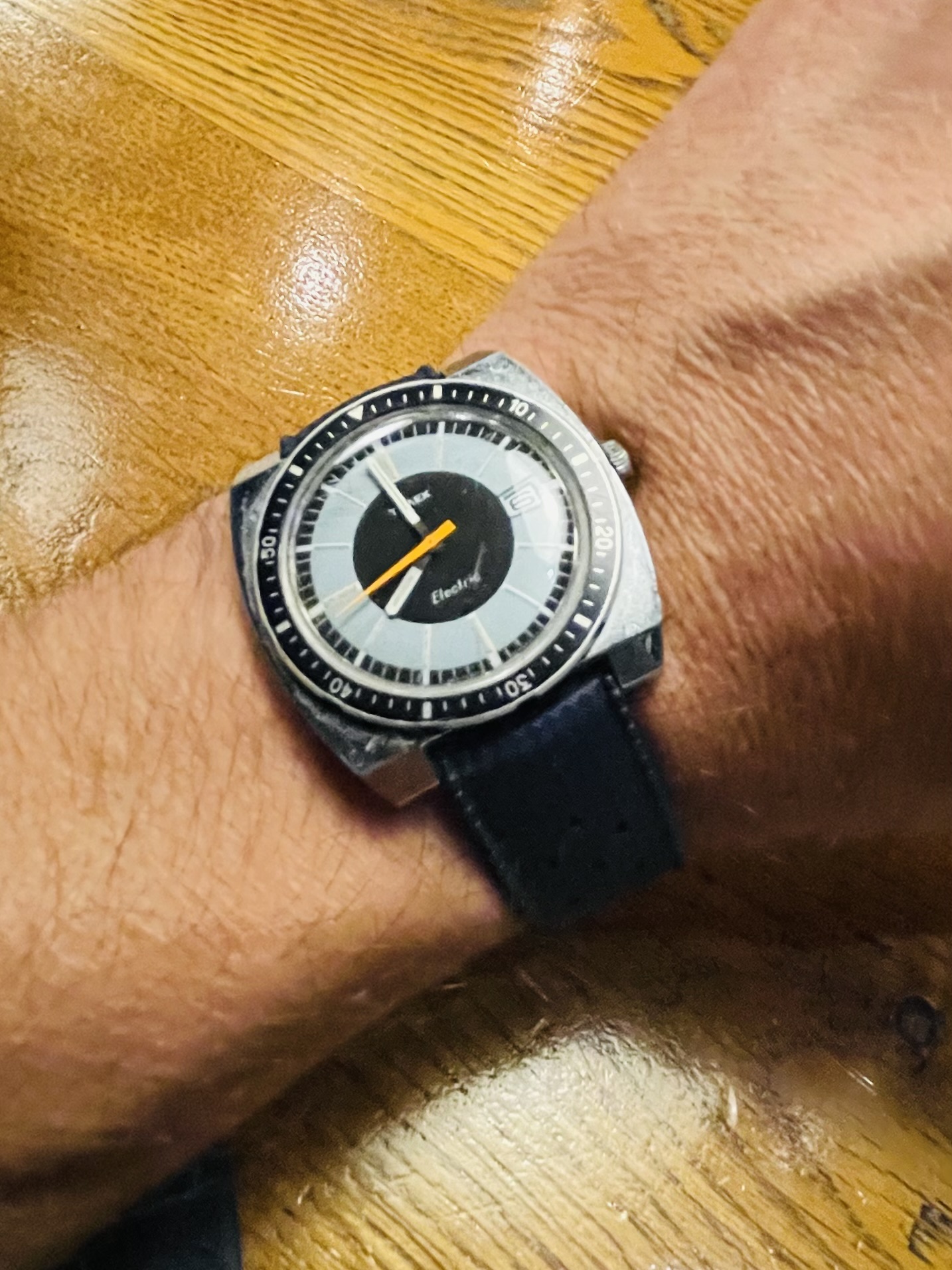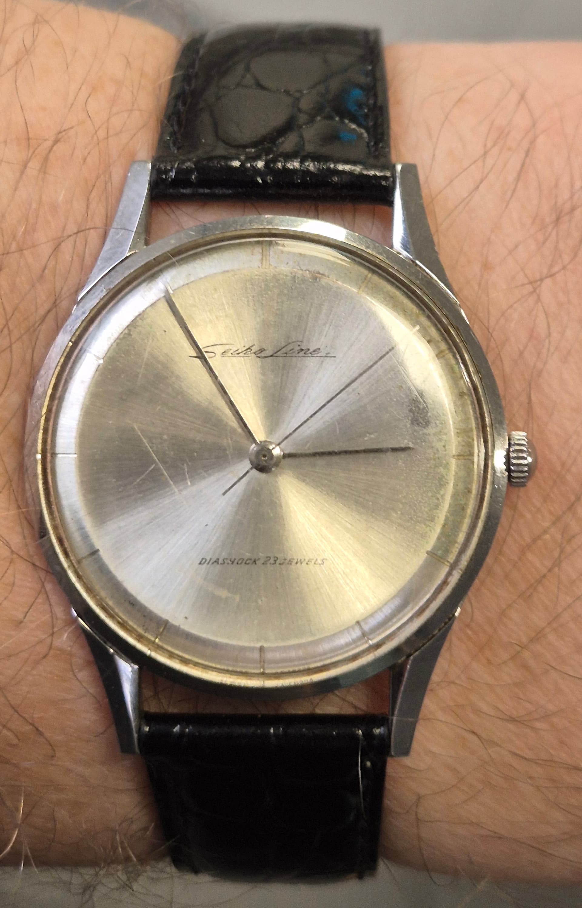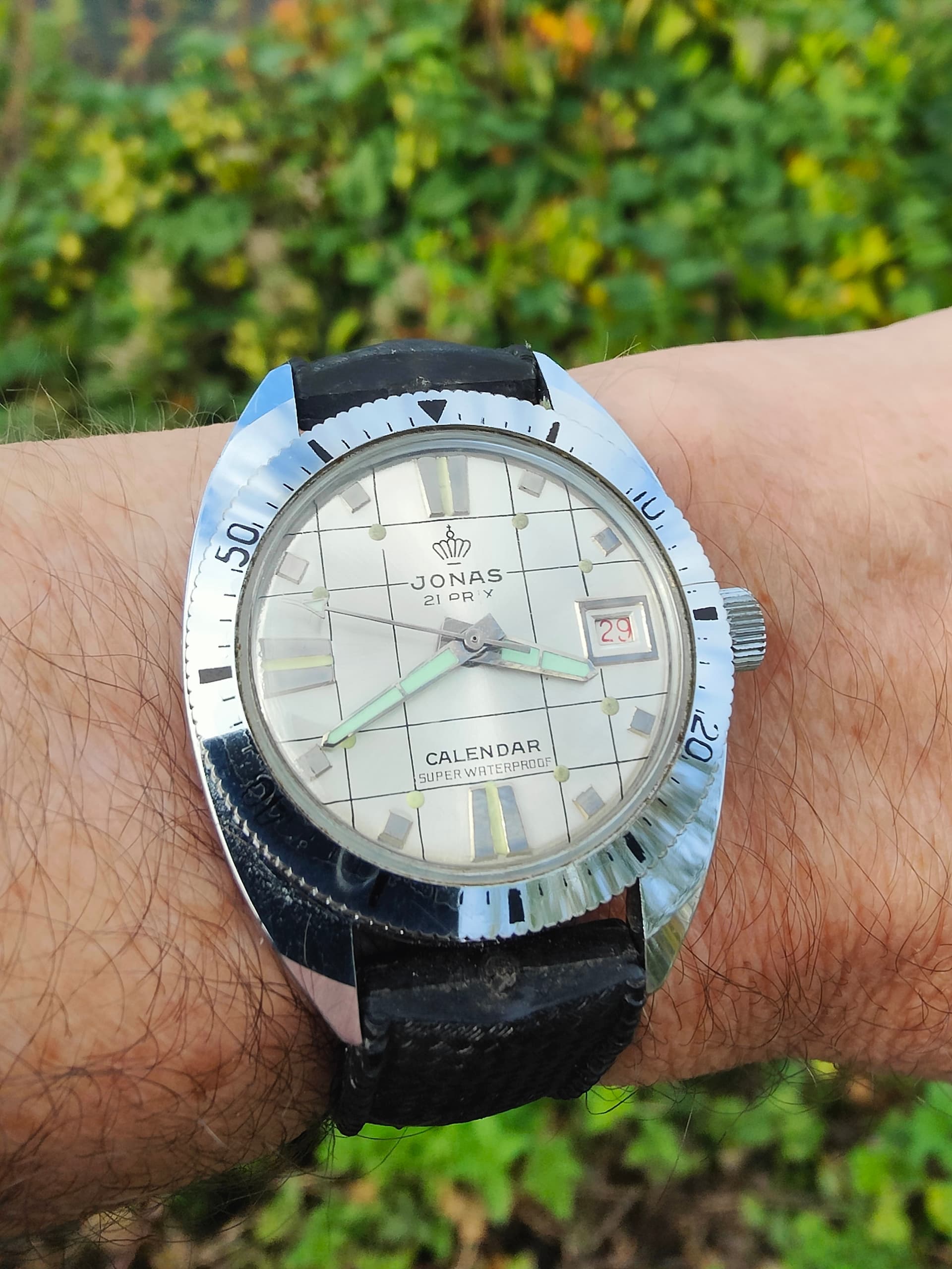 Vandaag draag ik deze Ceuvá uit de jaren ’50. In de kast tikt een FHF 28 H, en de robuuste Spillmann-kast doet zijn werk nog altijd uitstekend. De combinatie van de zwarte wijzerplaat met de koperkleurige rand en vergulde wijzers geeft het horloge een karaktervolle vintage uitstraling.