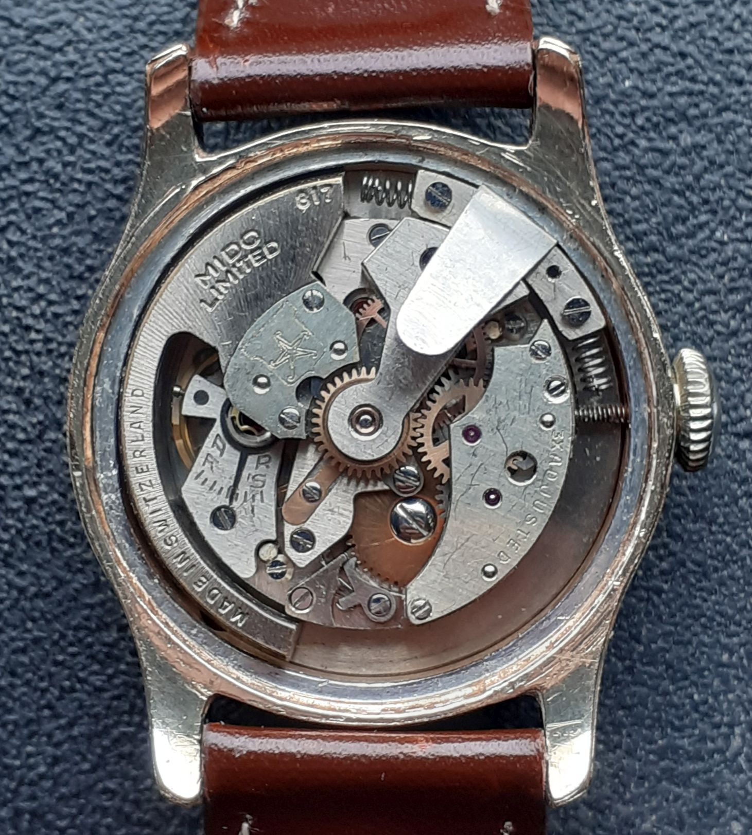 Een bijzonder stukje techniek, want binnenin tikt een zogenaamd bumper-automatic uurwerk, het Mido 817 (gebaseerd op een Felsa-kaliber). Dit systeem was één van de eerste automatische opwindmechanismen, waarbij de rotor niet volledig ronddraait maar heen en weer stoot tegen veertjes.