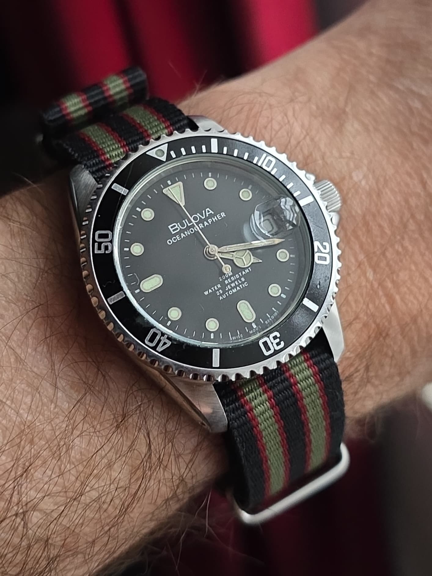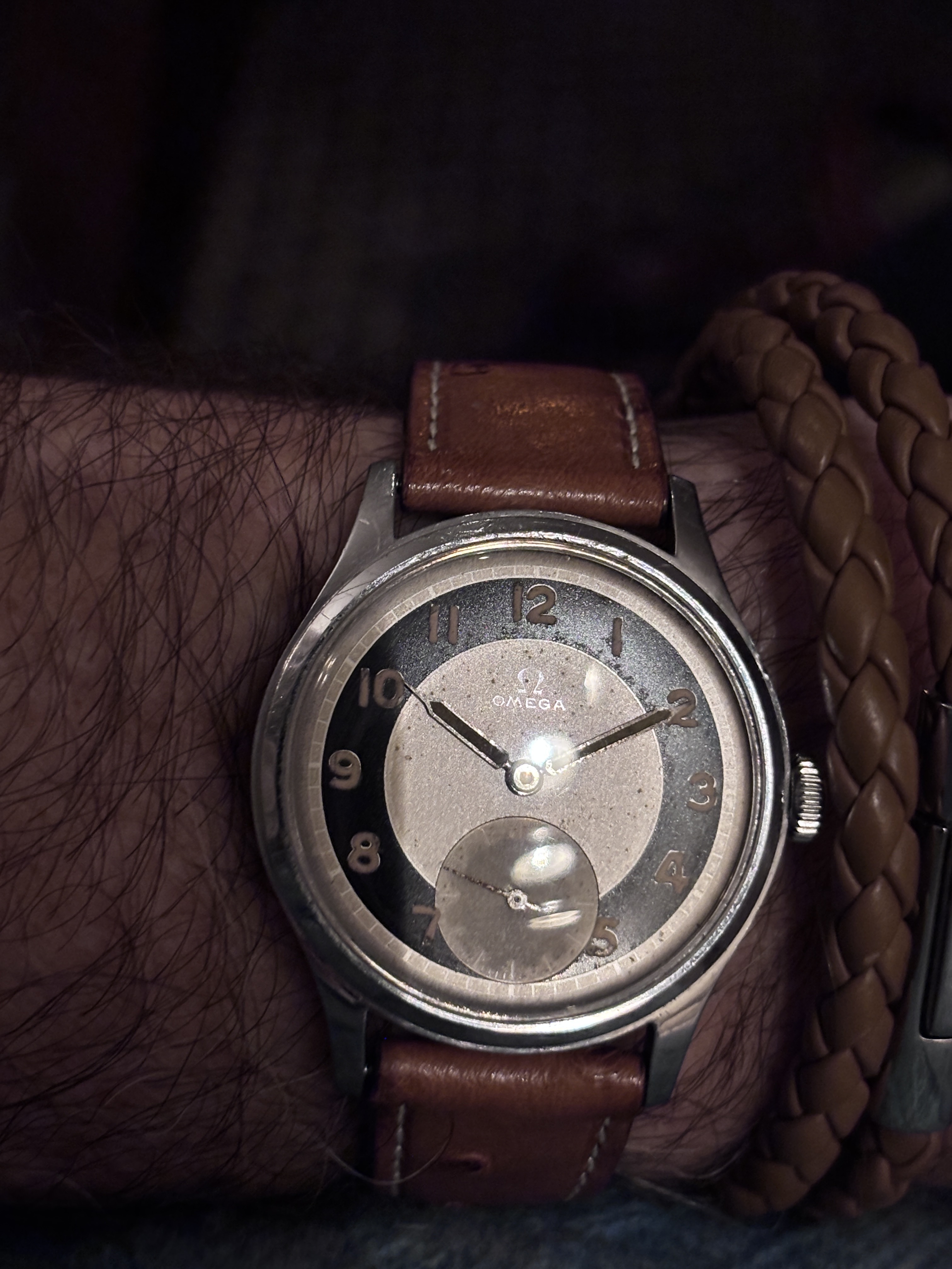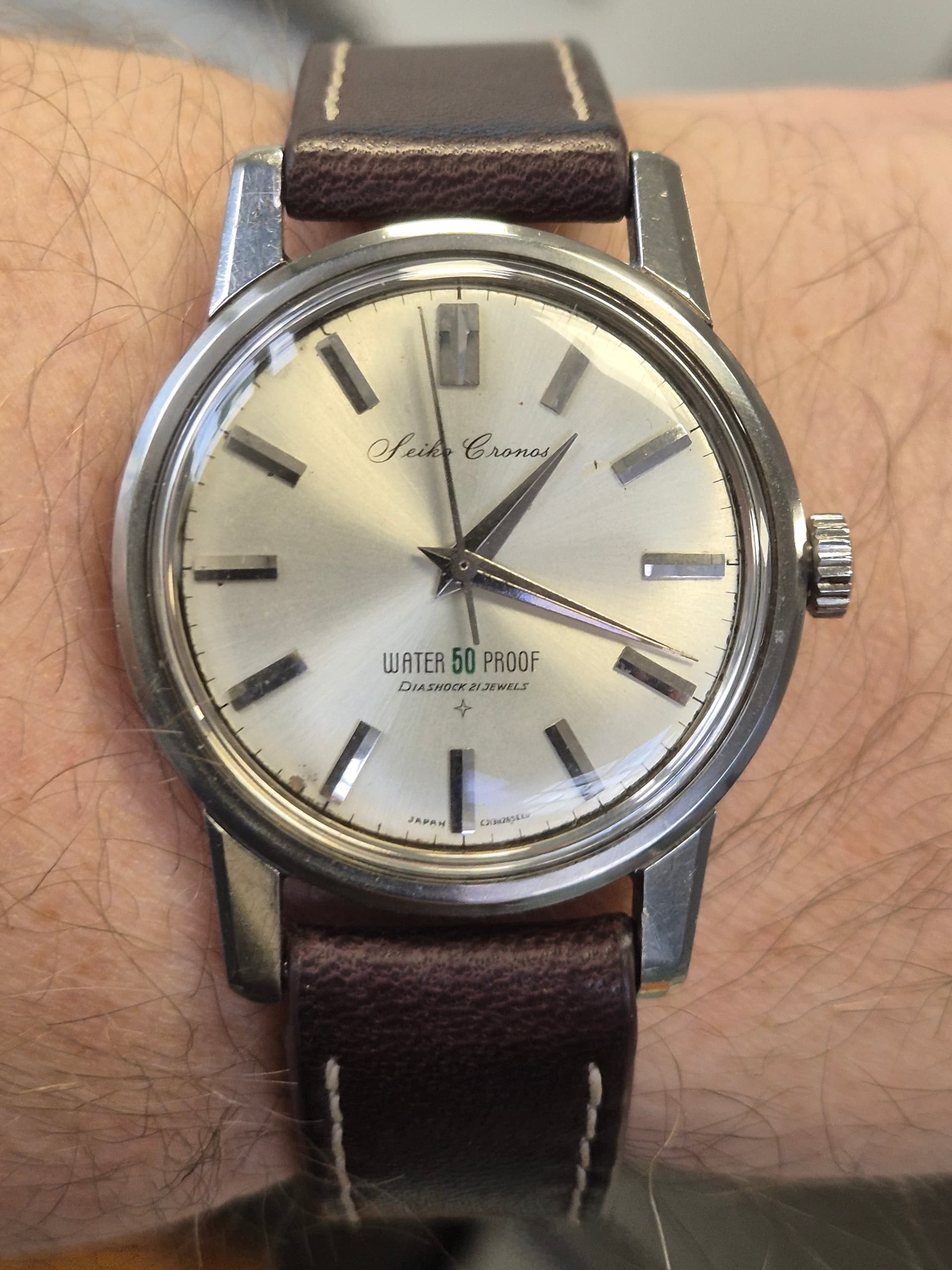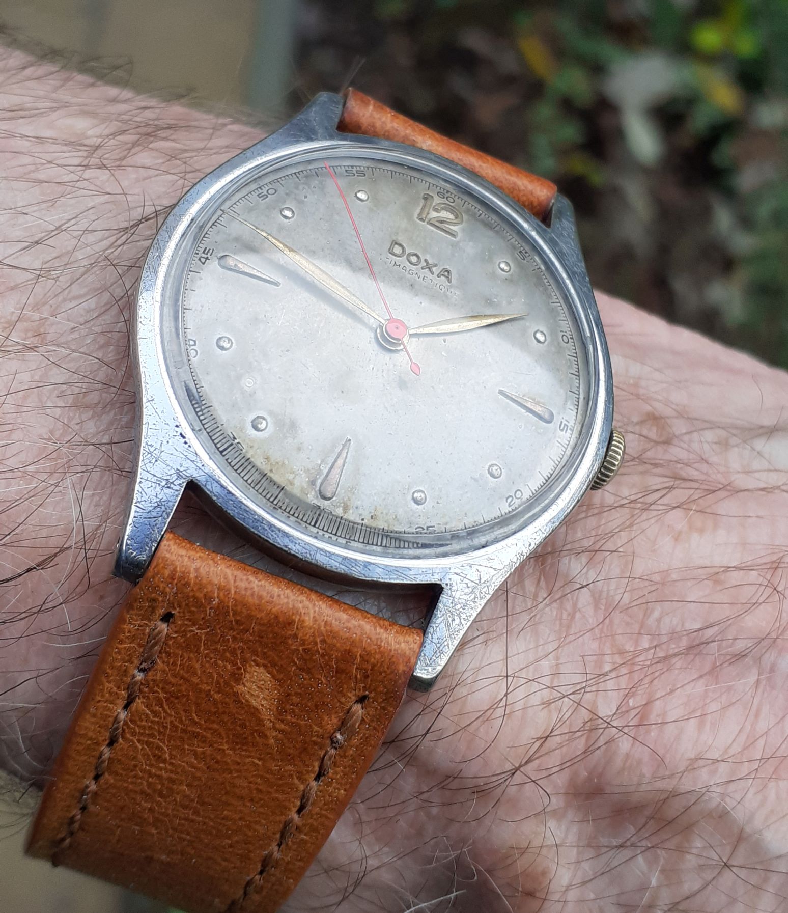 Vandaag draag ik deze Doxa Jumbo met een kastdiameter van 38 mm — behoorlijk groot voor de jaren ’50. Binnenin tikt een ETA 1147, een handopwindkaliber dat rond 1955 op de markt kwam. De wijzerplaat heeft in de loop der jaren een bijzonder patina ontwikkeld; hoe hij er nieuw heeft uitgezien blijft een raadsel, maar juist dat geeft hem nu z’n charme.
