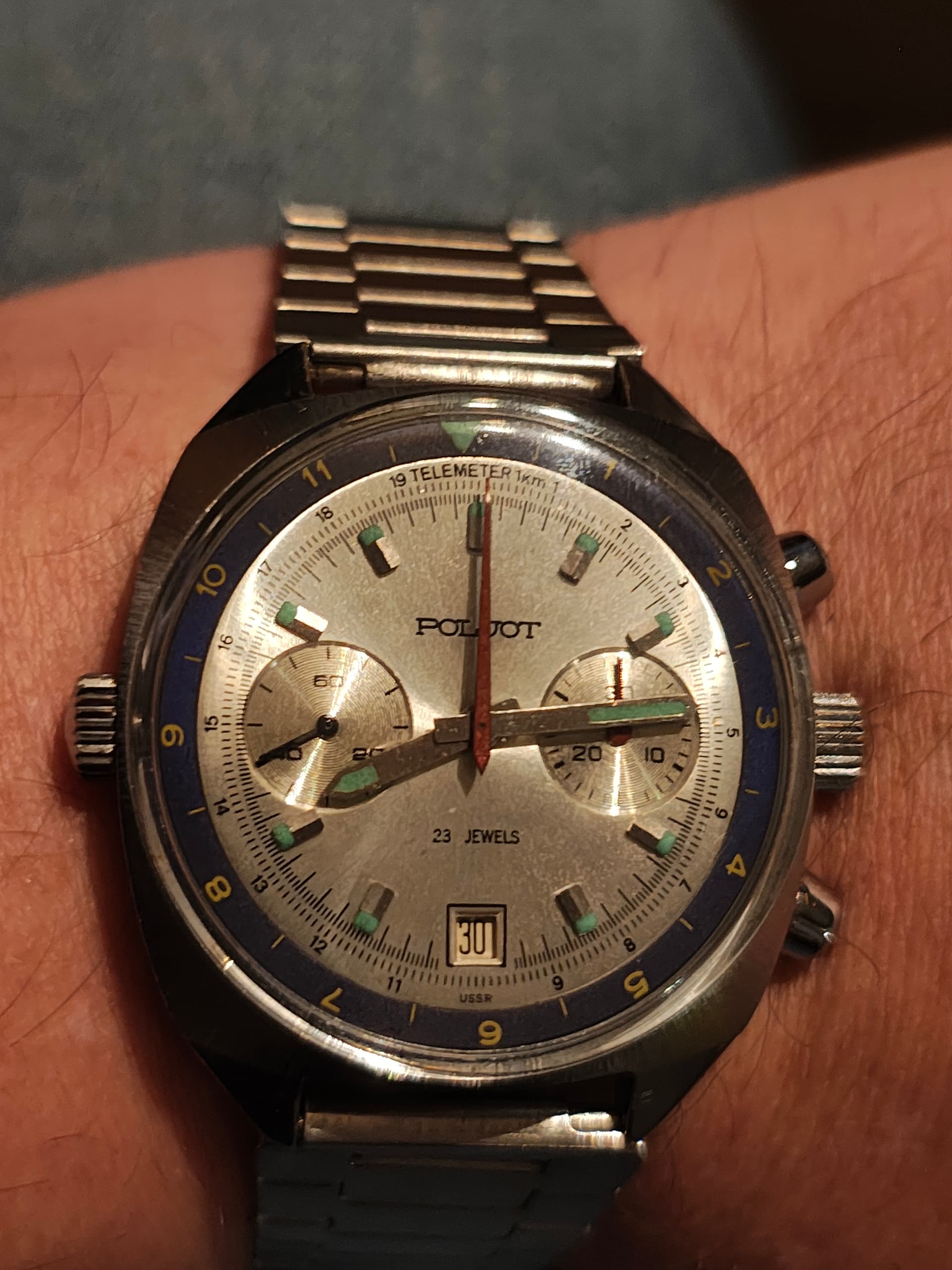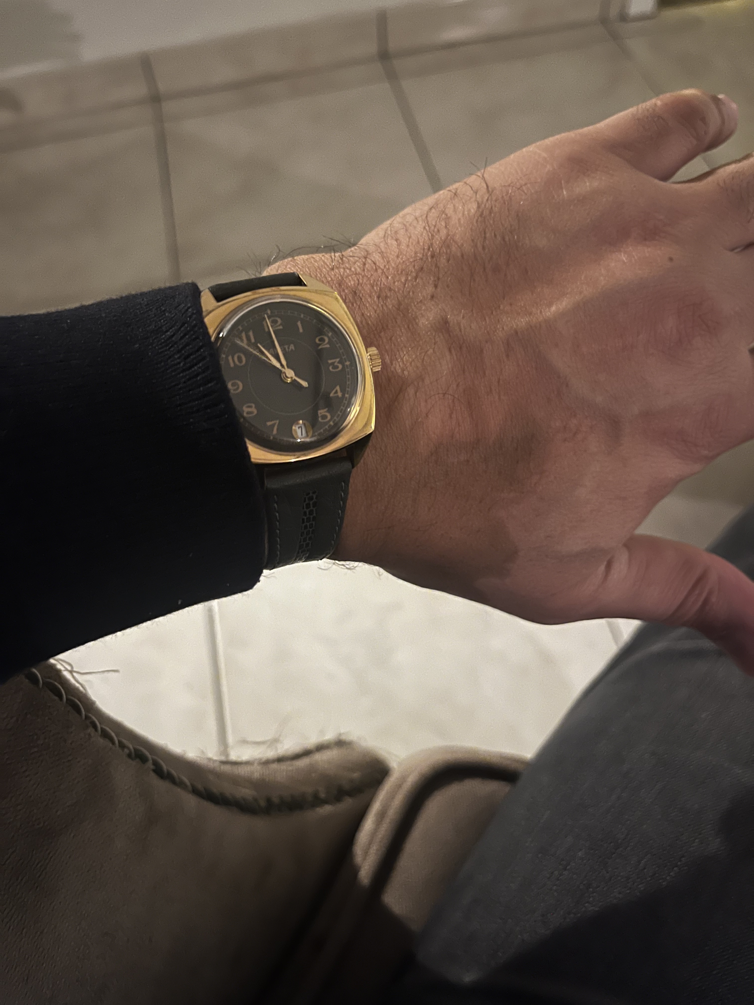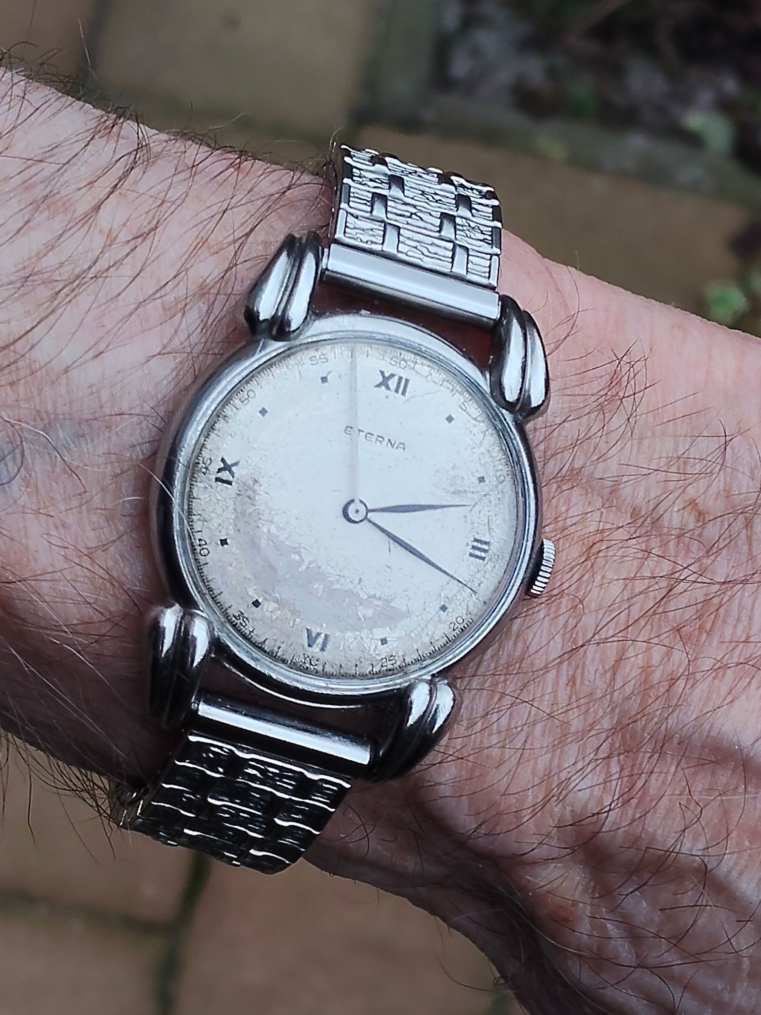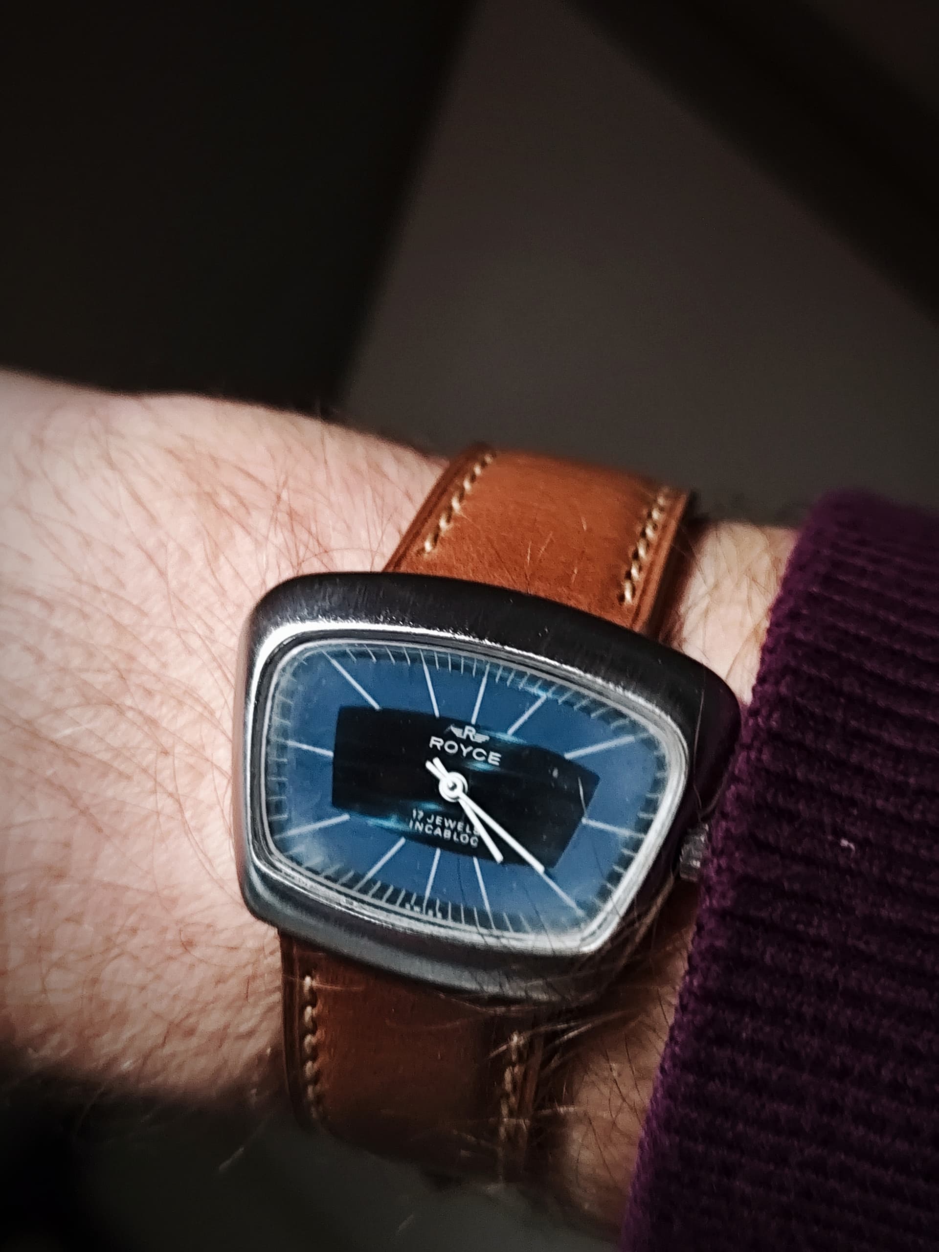 Het lijkt net de TV-kast van mijn grootouders, maar met meer kleur op de dial, dan zij ooit op hun TV-scherm konden zien. Hij kwam op 18mm, maar 20 past makkelijk. De Timegrapher is overtuigend, het uurwerk is prima. Glaasje polijsten ga ik nog doen.