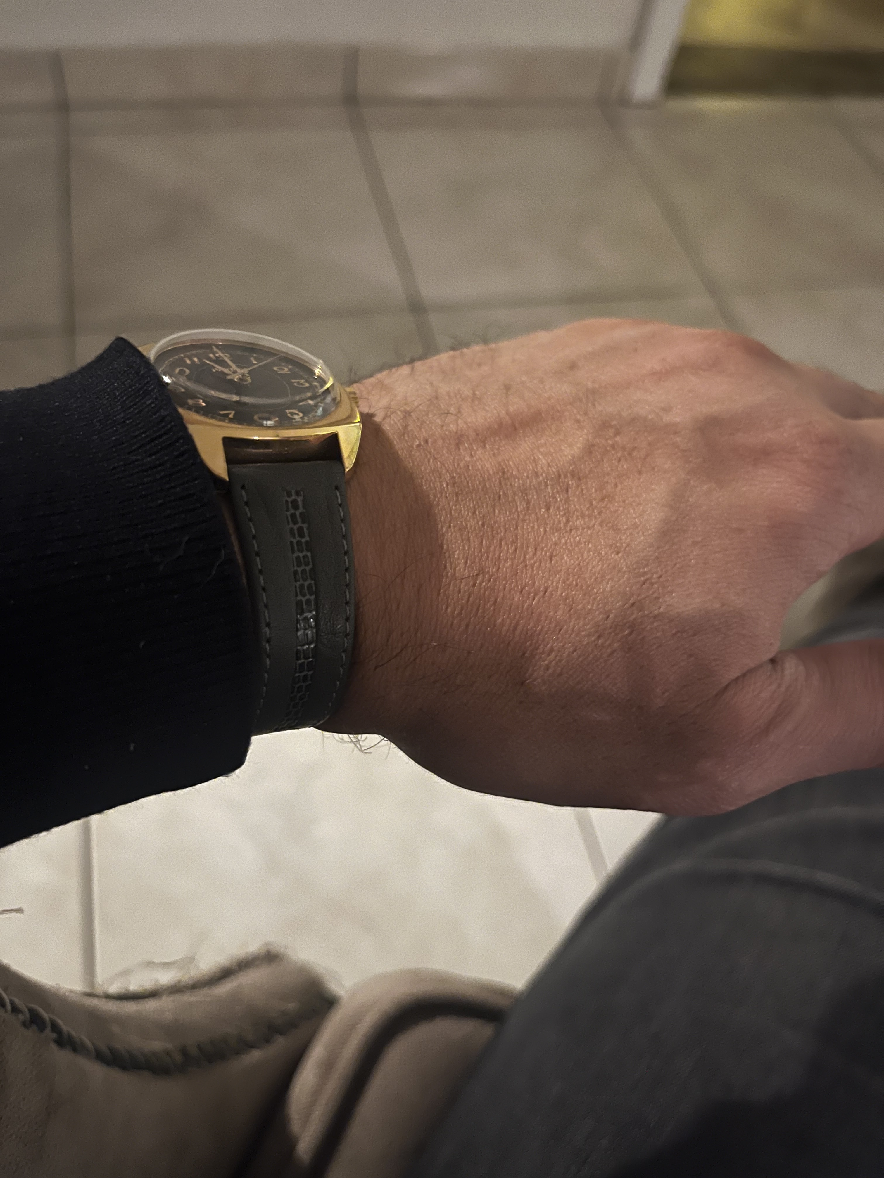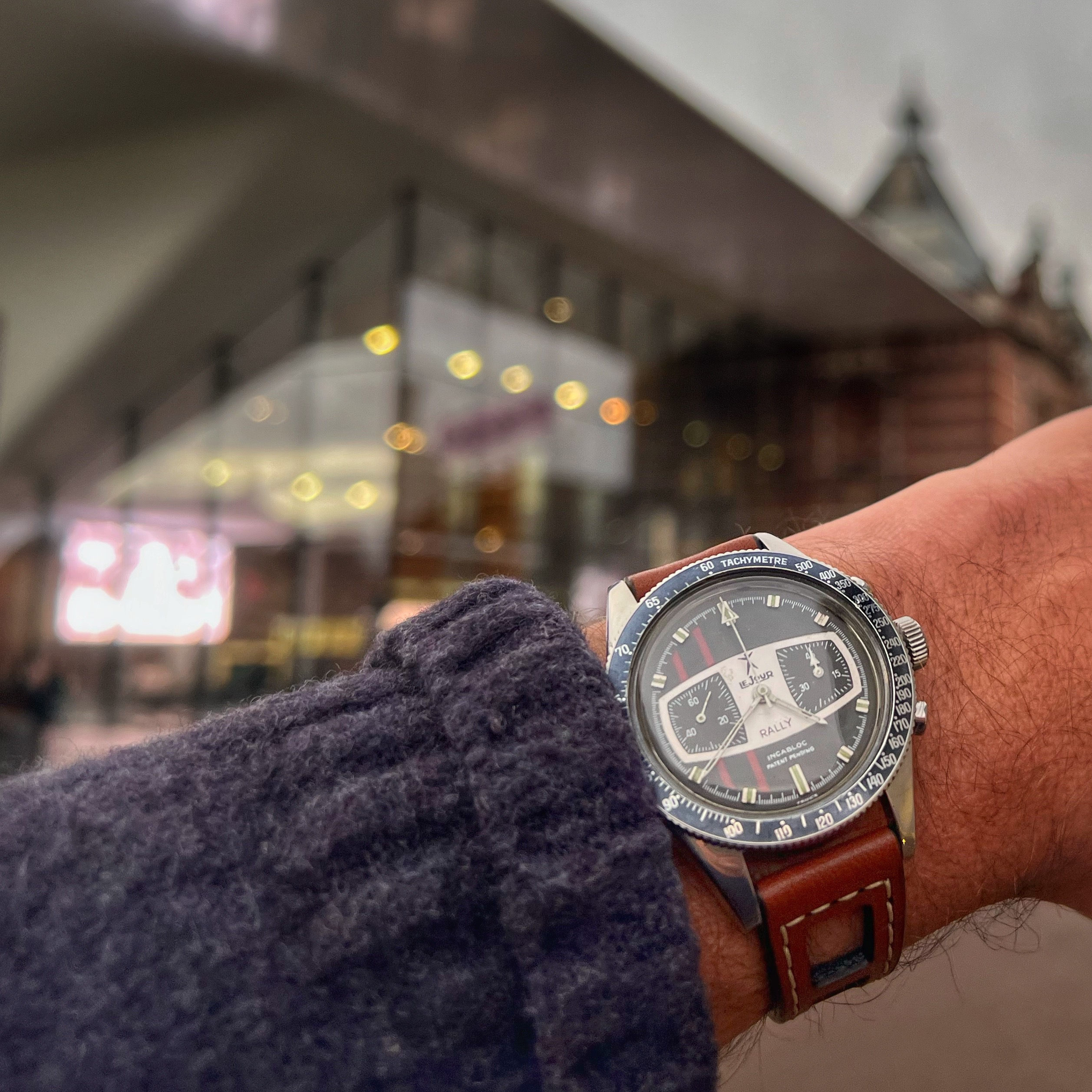 Vintage Yema (LeJour) Rallygraf ‘Andretti’ om, op Two Stitch Straps Yema style band.