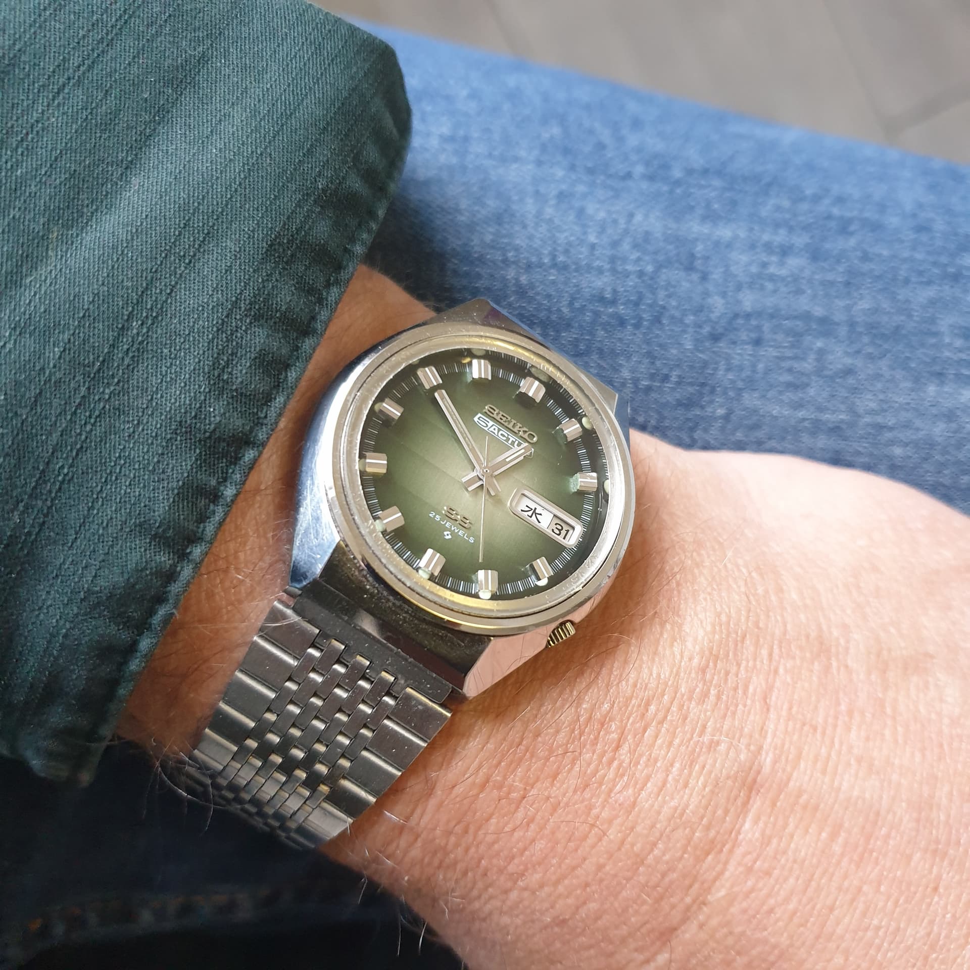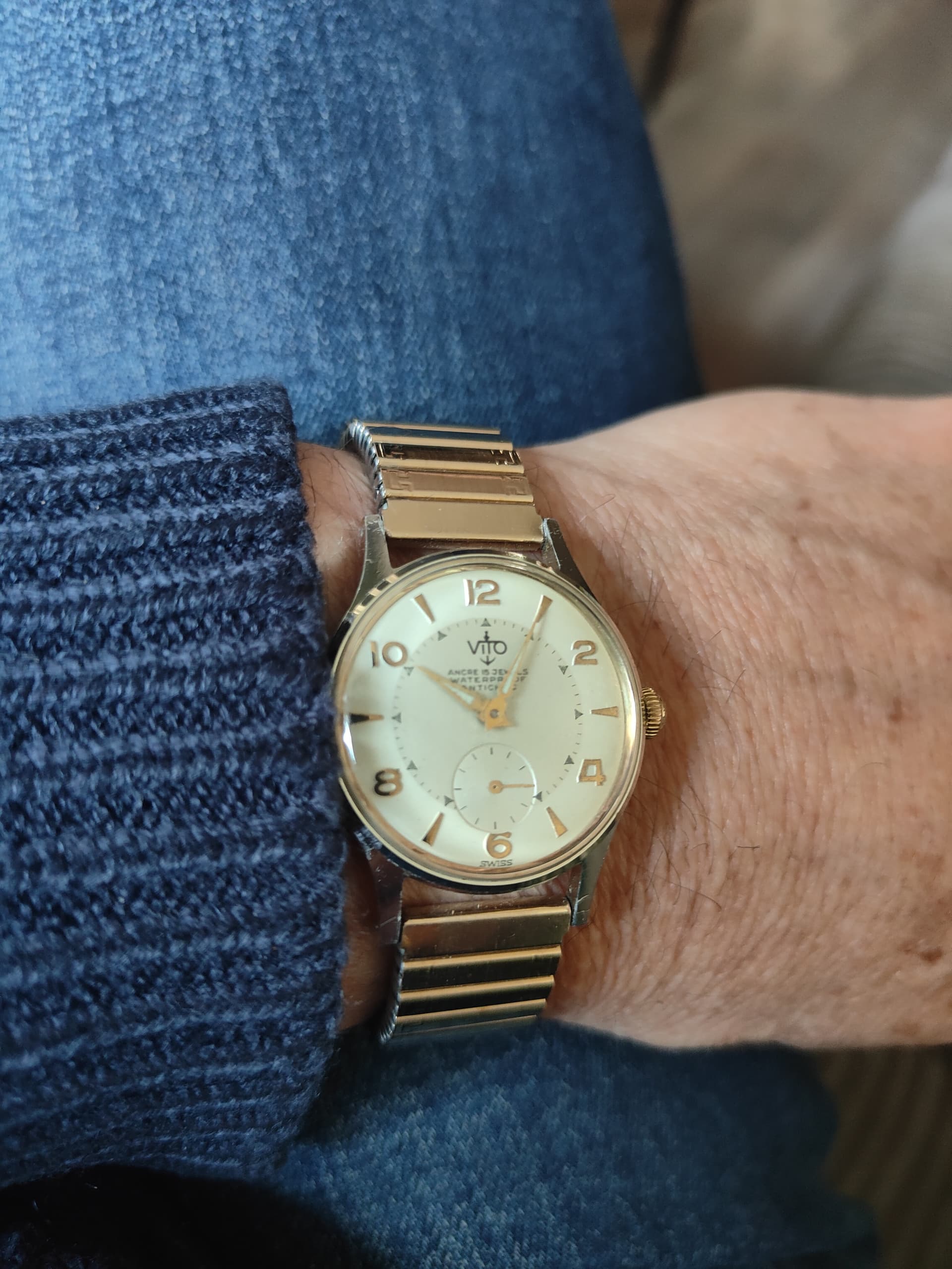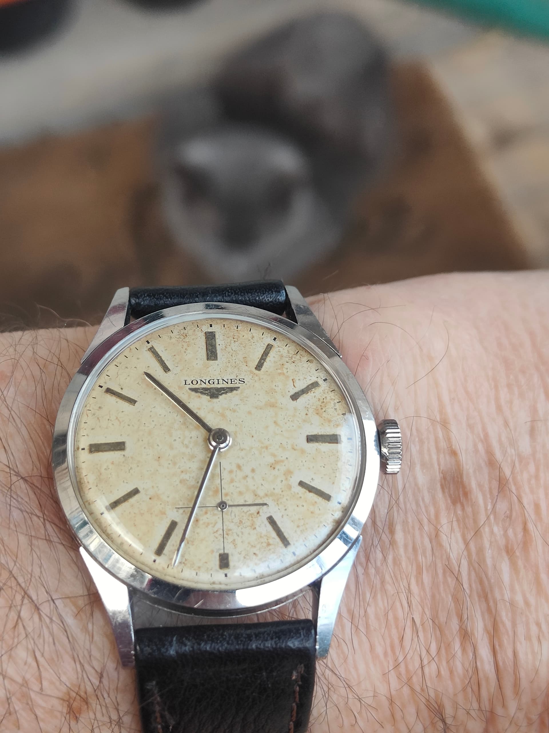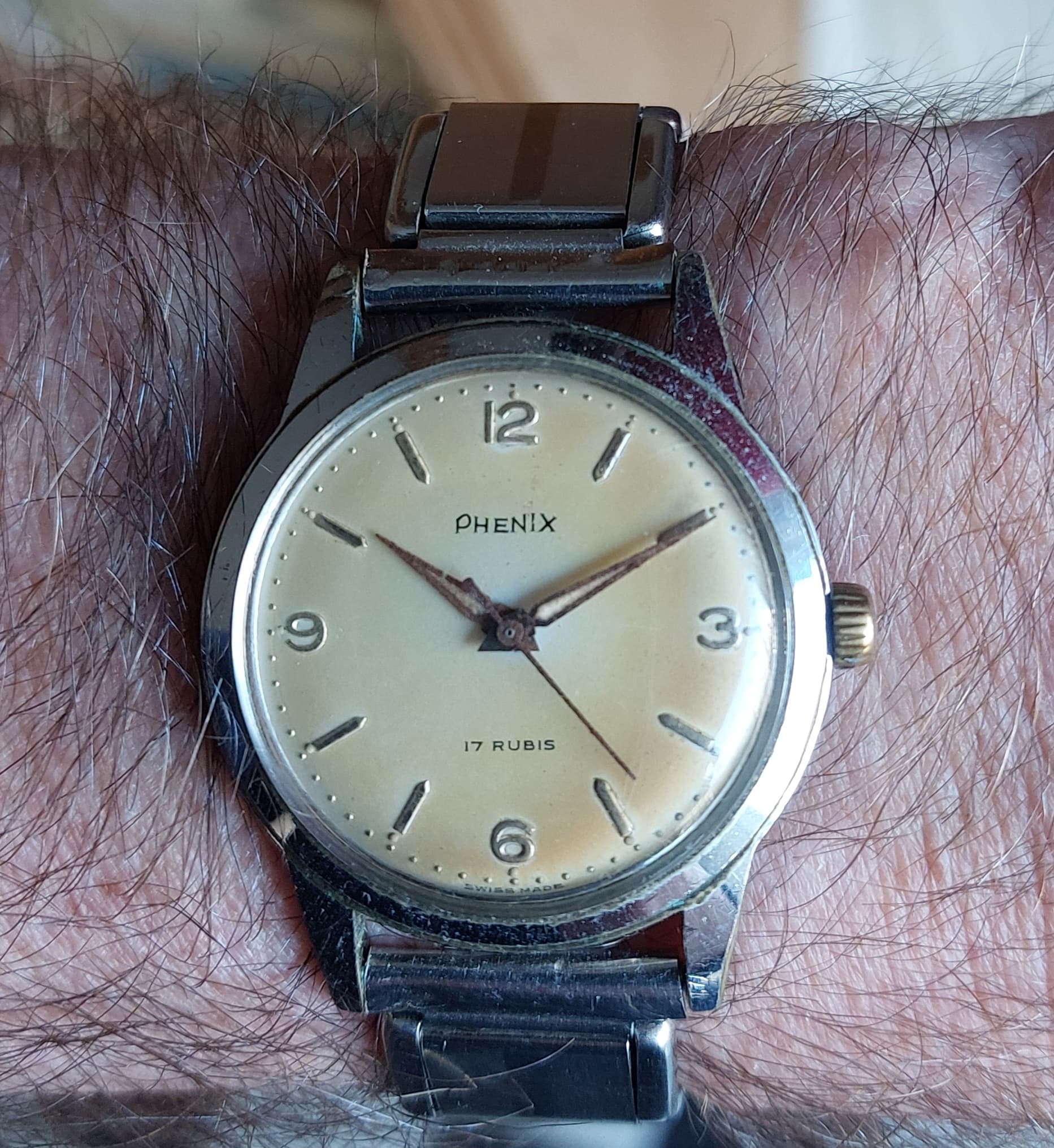 Hij wilde dit horloge eigenlijk niet omdat het geen quartz was. Hij heeft het dan ook nog geen 10 keer gedragen. Het bandje was helemaal uit elkaar gevallen en ik heb er vlug deze aan gezet, maar er moet nog een ander aan komen zonder metseltouwtjes ![]()