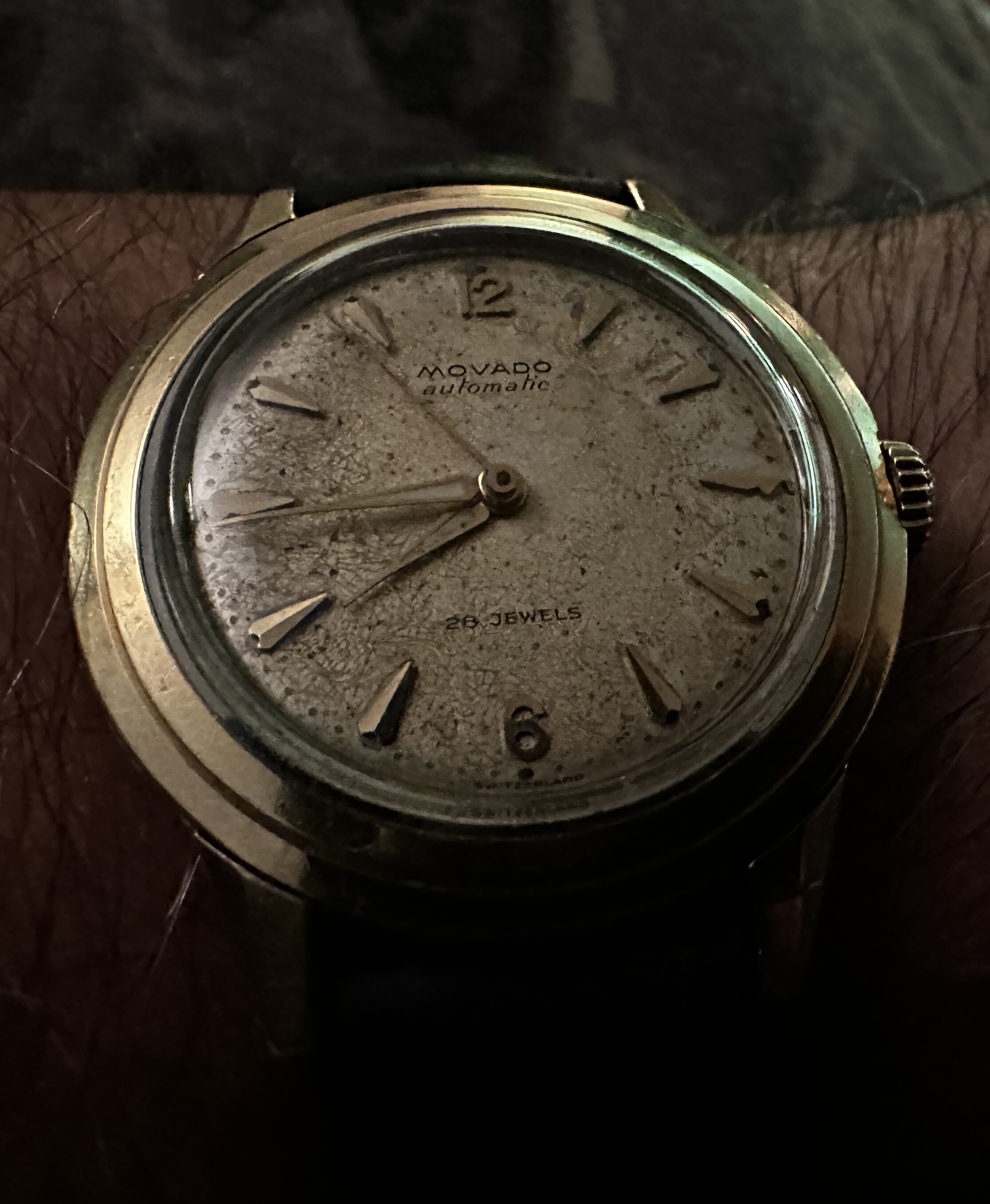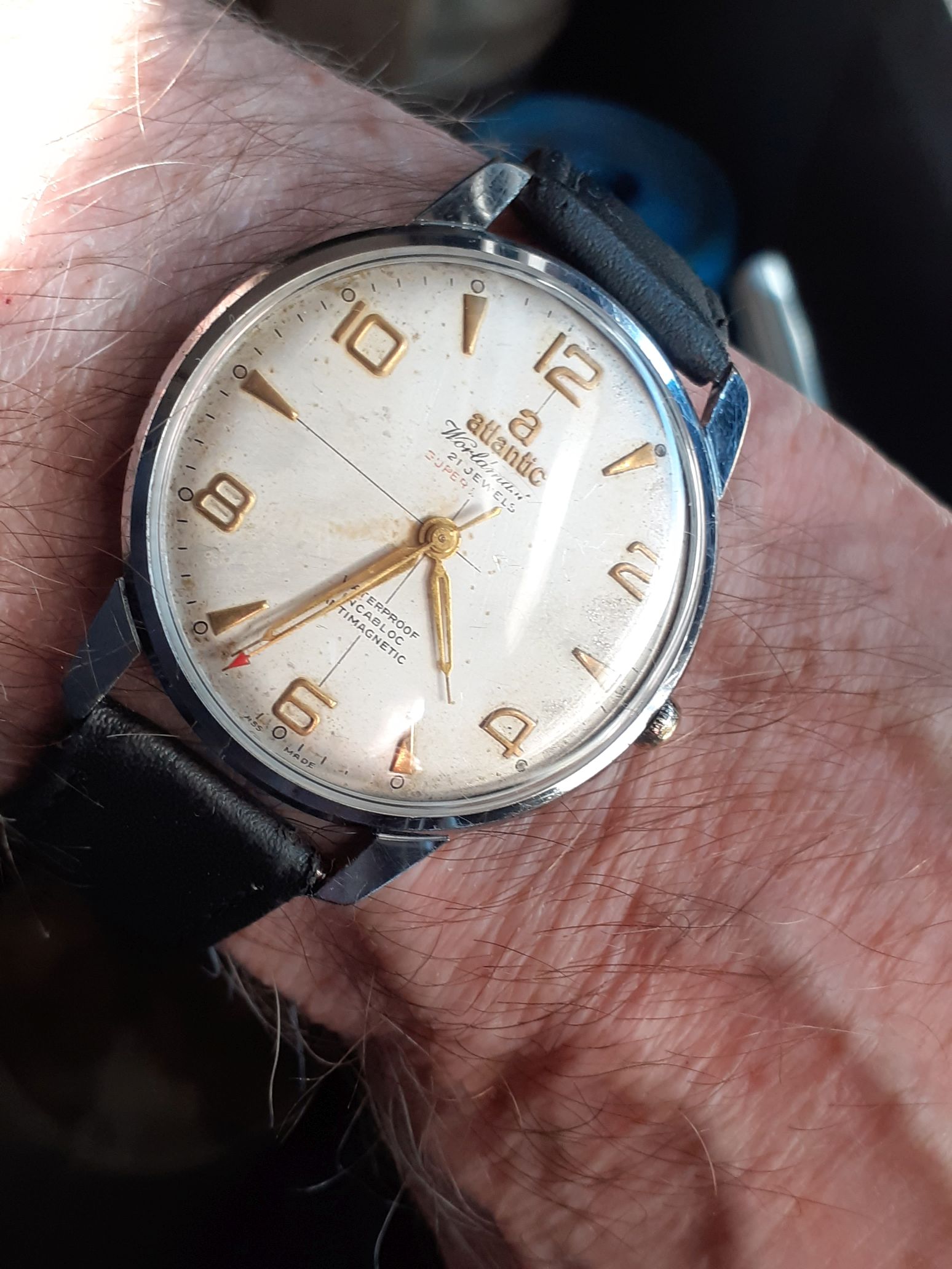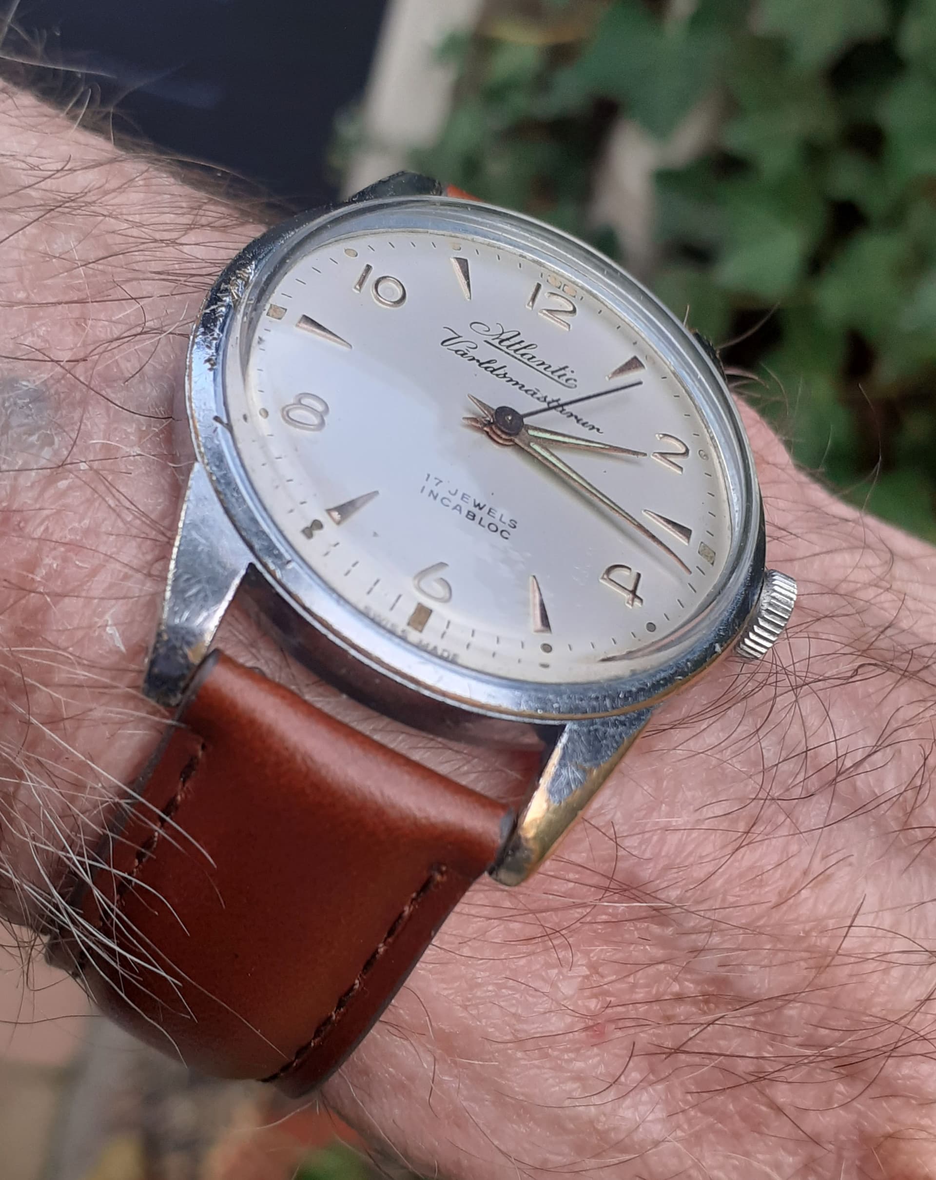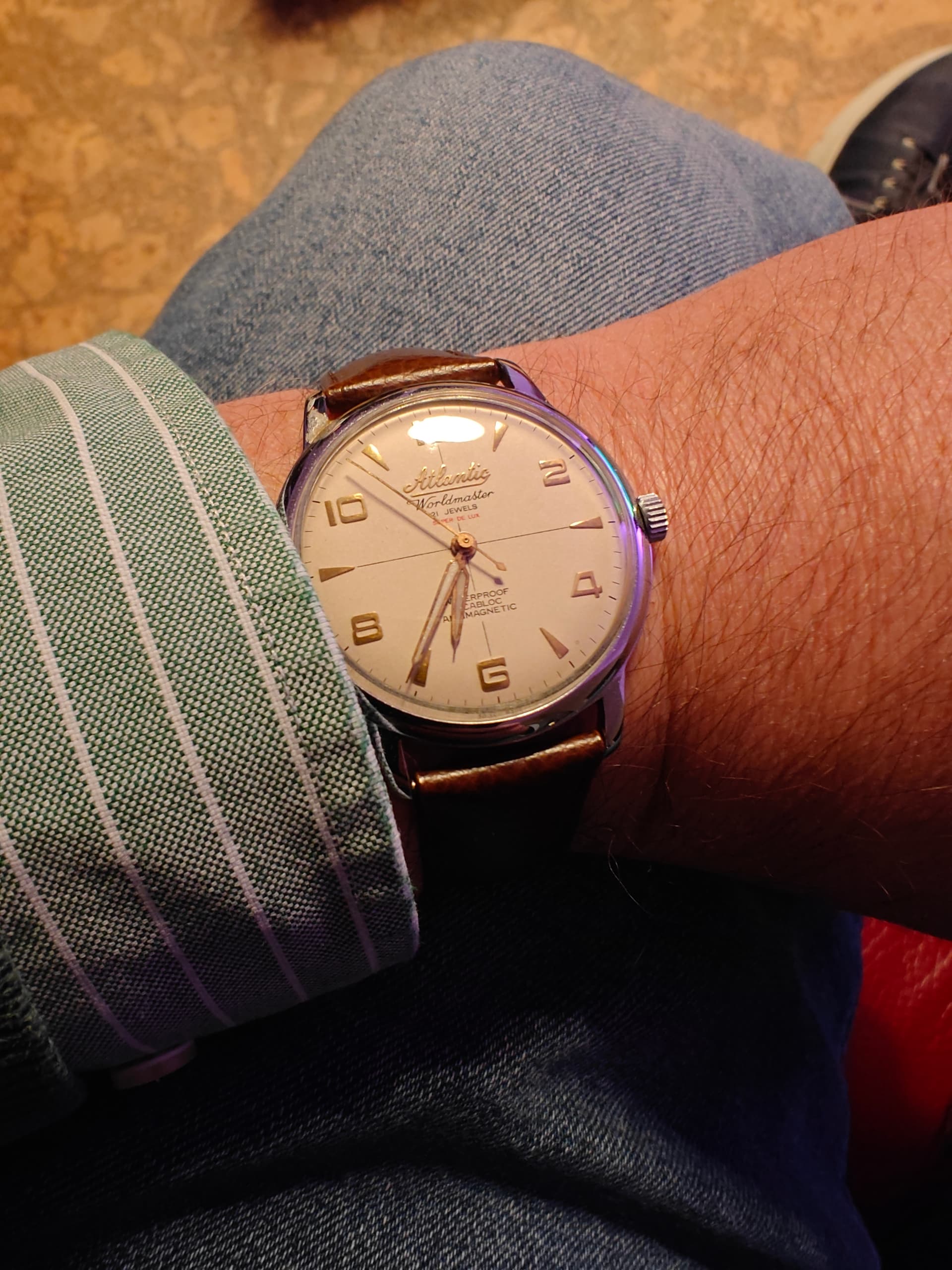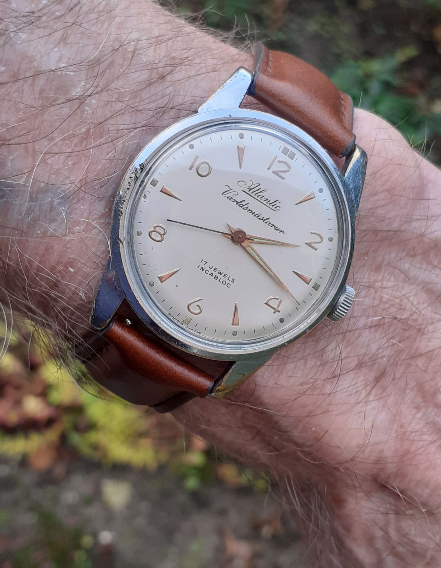 Vandaag draag ik deze charmante Atlantic Varldsmastarur, een klassieker met die herkenbare jaren ’50 uitstraling. De kast vertoont wat sporen van leeftijd, maar dat geeft hem juist karakter.