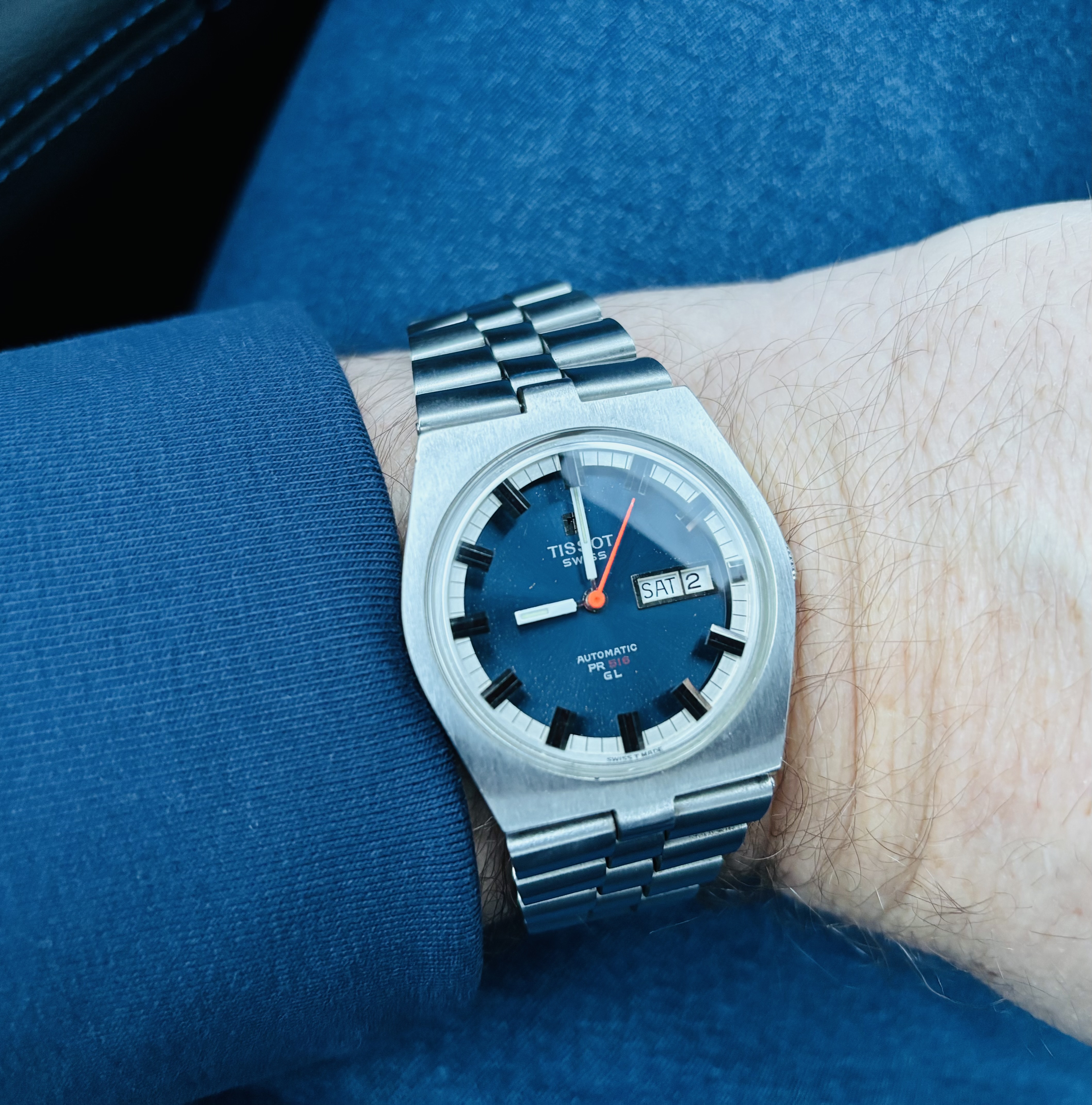 Hij zit heerlijk rond de pols met z’n 36mm kast, strap is te smal (18mm) daar waar er een 19mm tussen hoort dus die is besteld ![]()